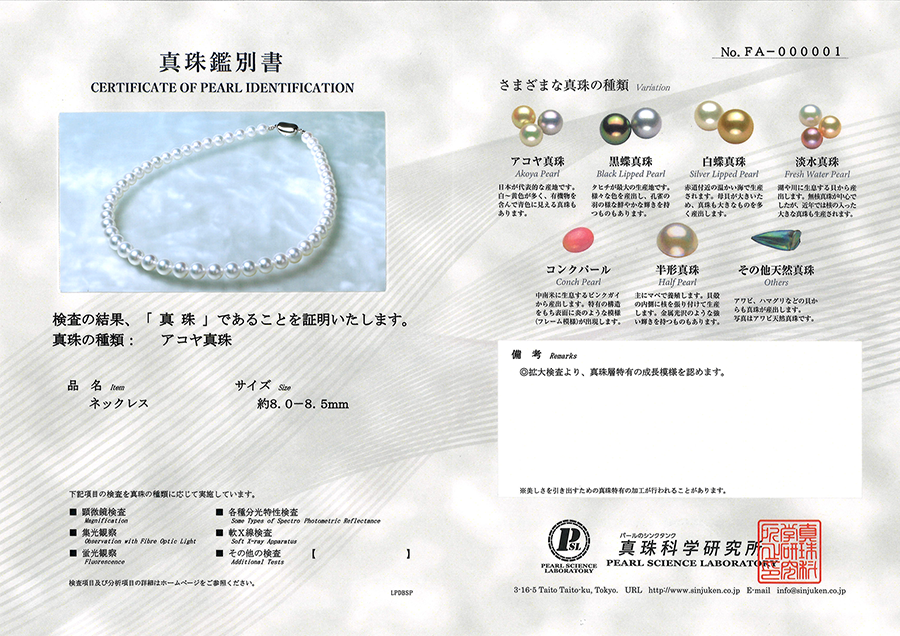 此外,真多研還有一種叫做FA證書。FA型證書不存在任何分級的意義,僅作為對珍珠鑒定真假使用,僅能證明是否為天然海水珍珠。FA證書這類證書僅鑒定它是一顆真的珍珠,證書上沒有任何關於品質的認證。