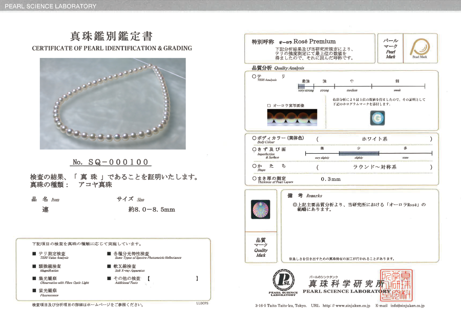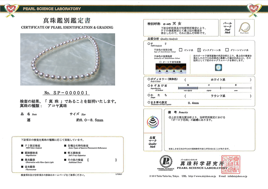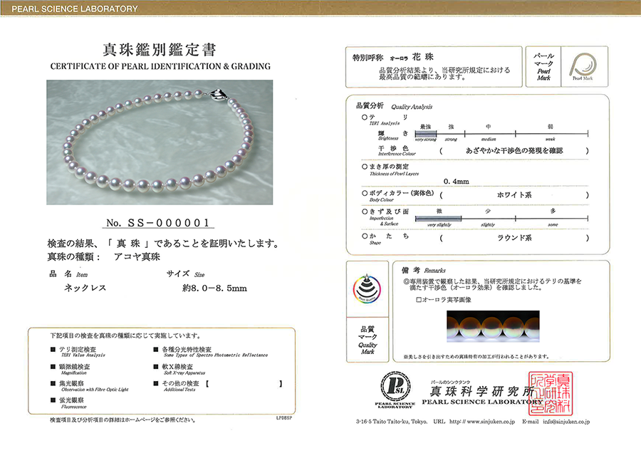 目前在市場上廣泛使用的「天女」、「花珠」等證書,均出自於真科研,真科研對Akoya的鑒定分級具備一套完整而嚴謹的體系標準。Akoya珍珠主要以白色為主,有極少數的天然淺香檳金色和藍灰色。真科研將最高品質的白色系Akoya珍珠稱為「特選」,「天女」次之為「花珠」。藍色系最高品質者被稱為「真多麻」,金色系最高品質者被稱為「Akoya皇后」。