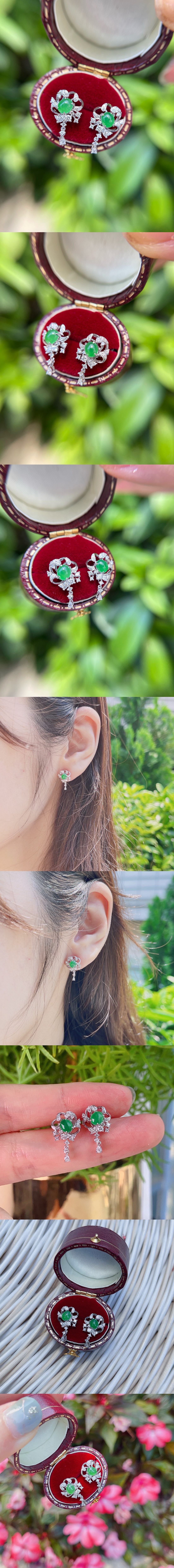 被立體C形曲線及點點星光般散落的鑽石圍繞,陽綠高冰翡翠顯得格外水靈動人,下面還有小垂吊鑽石💠增加浪漫氛圍,讓翡翠首飾美出新高度,打破舊有給人老器的感覺