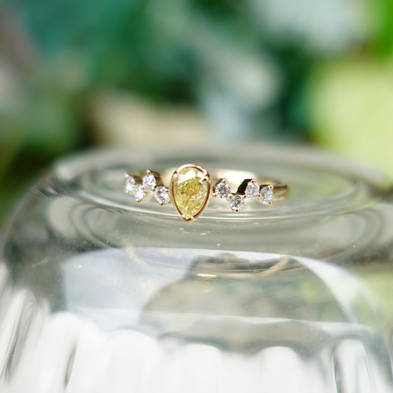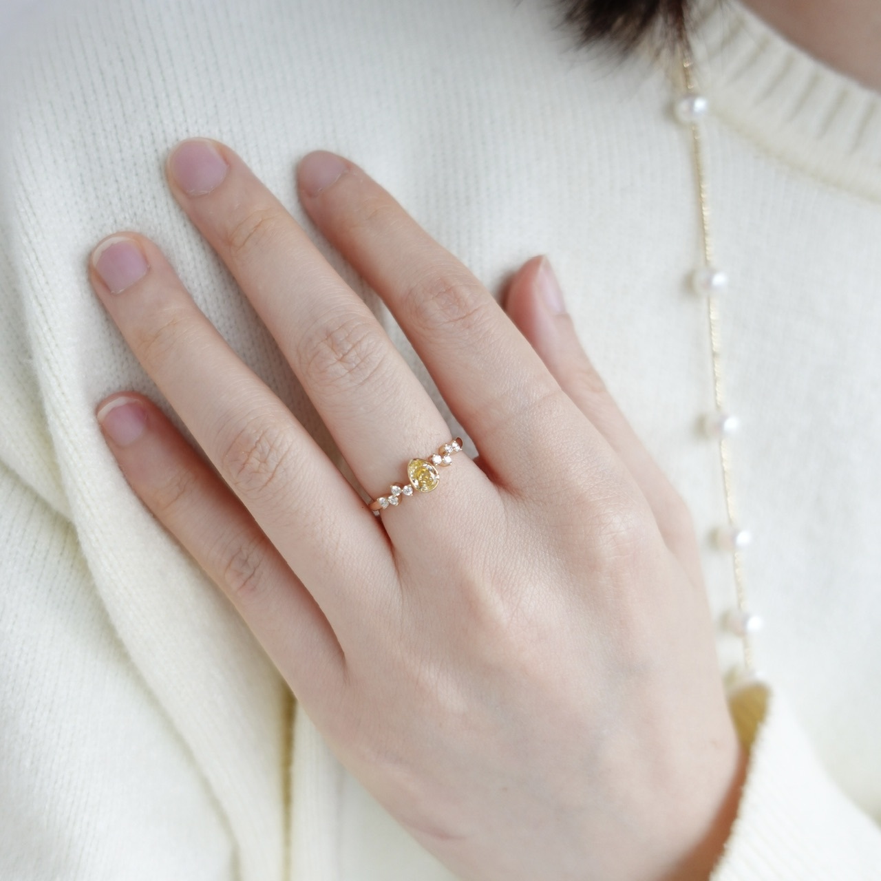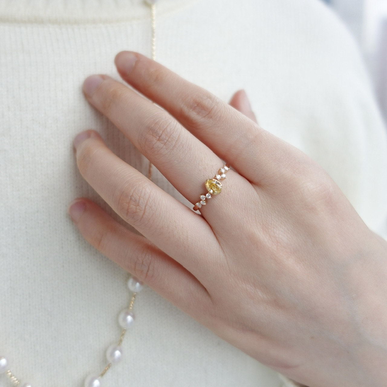 主石採Fancy Yellow色級黃鑽, 任何角度都感受到它飽滿的色彩,戒指臂的小碎鑽錯落排列,如星光點點的點綴著,十分吸睛✨