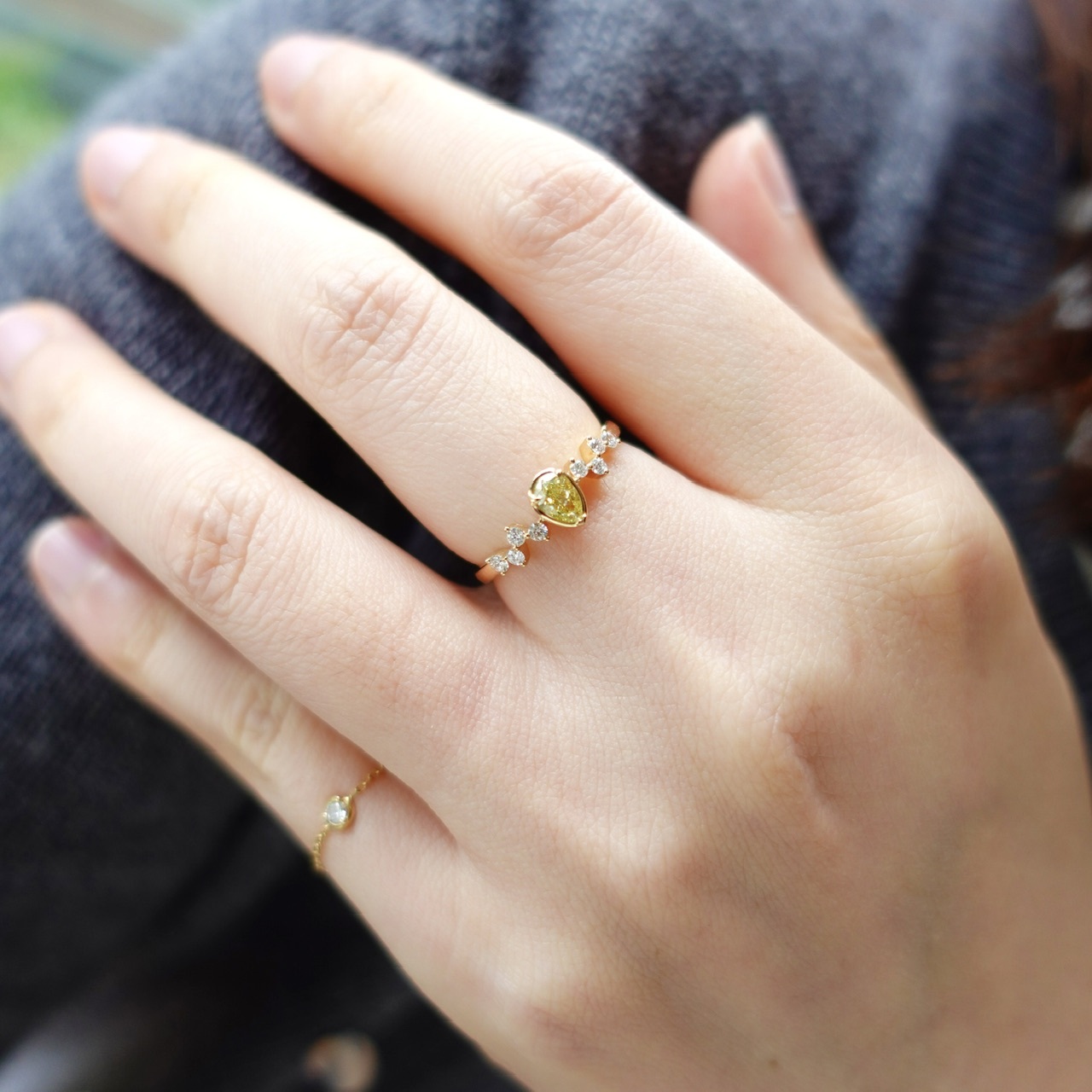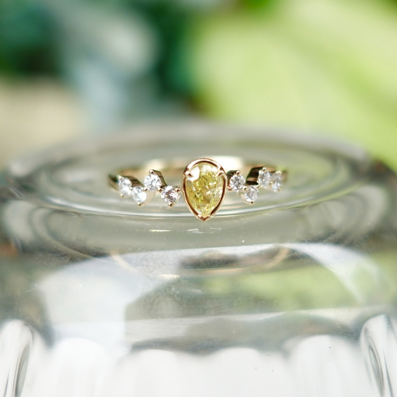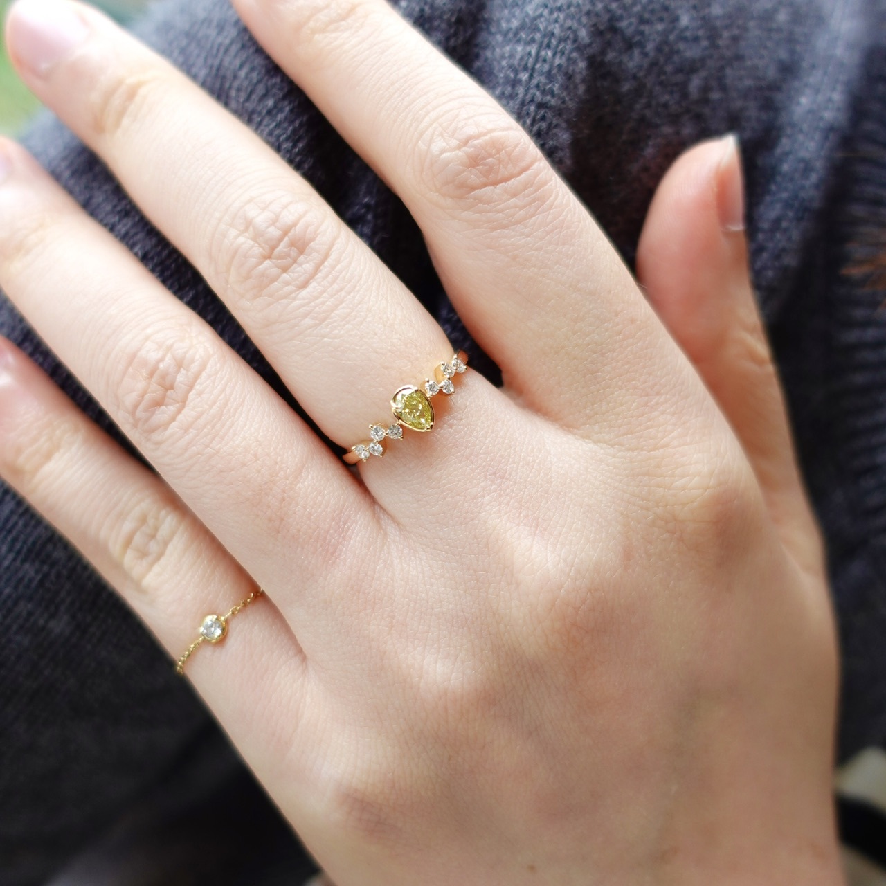 主石採Fancy Yellow色級黃鑽, 任何角度都感受到它飽滿的色彩,戒指臂的小碎鑽錯落排列,如星光點點的點綴著,十分吸睛✨