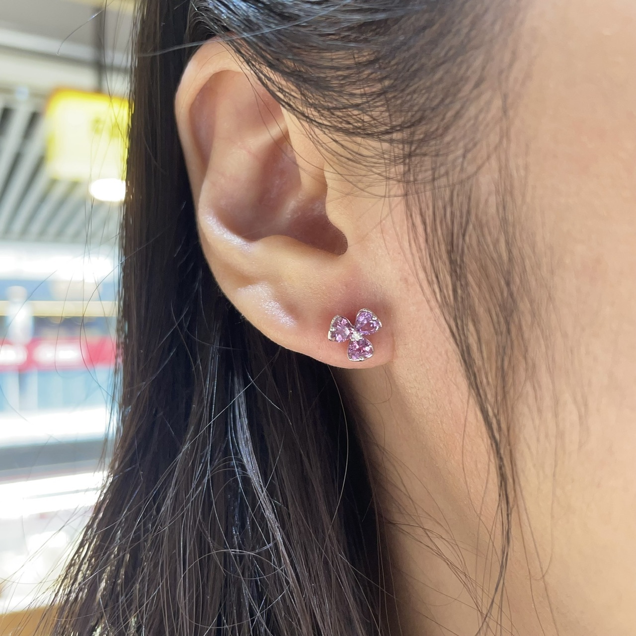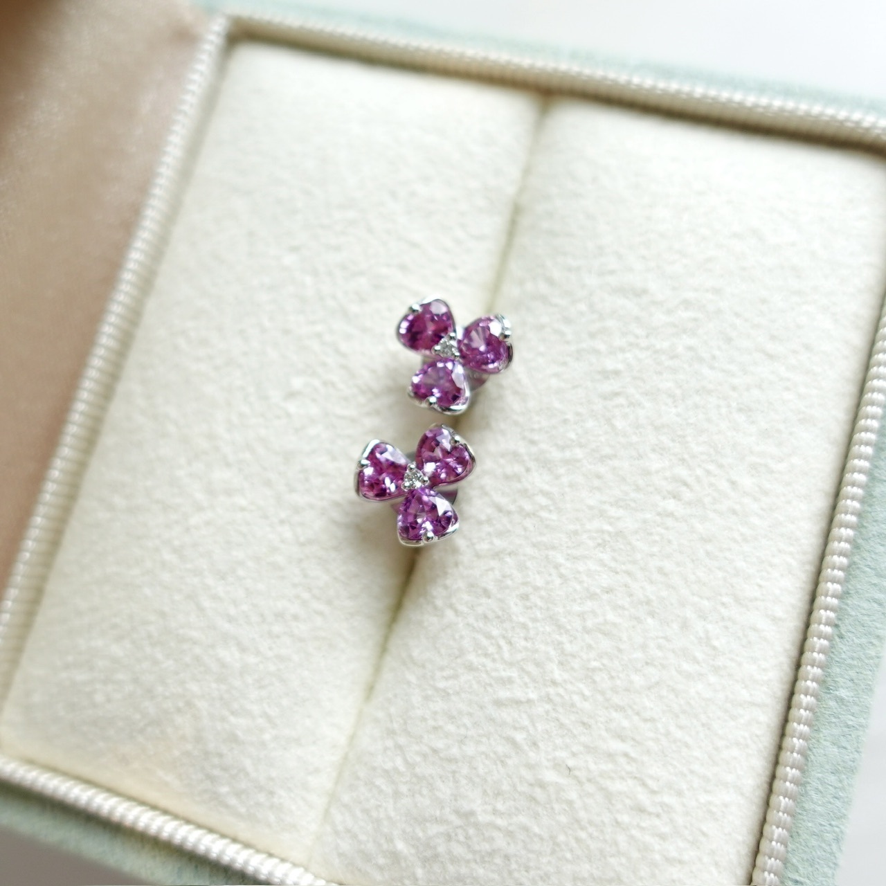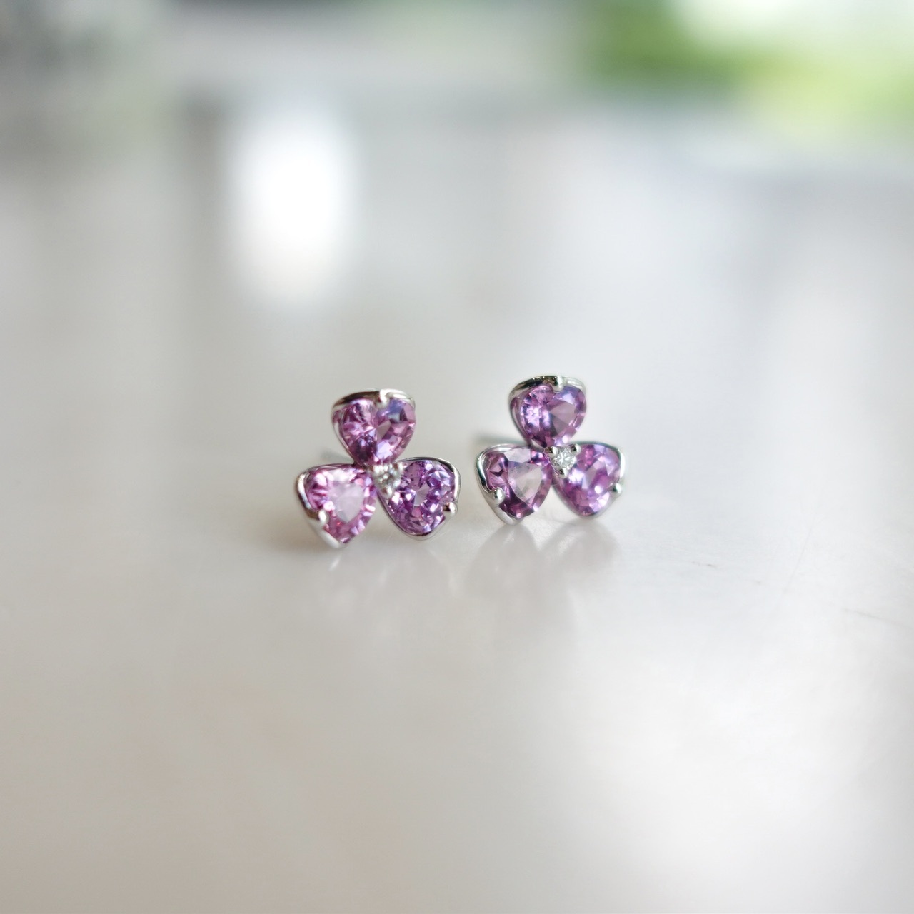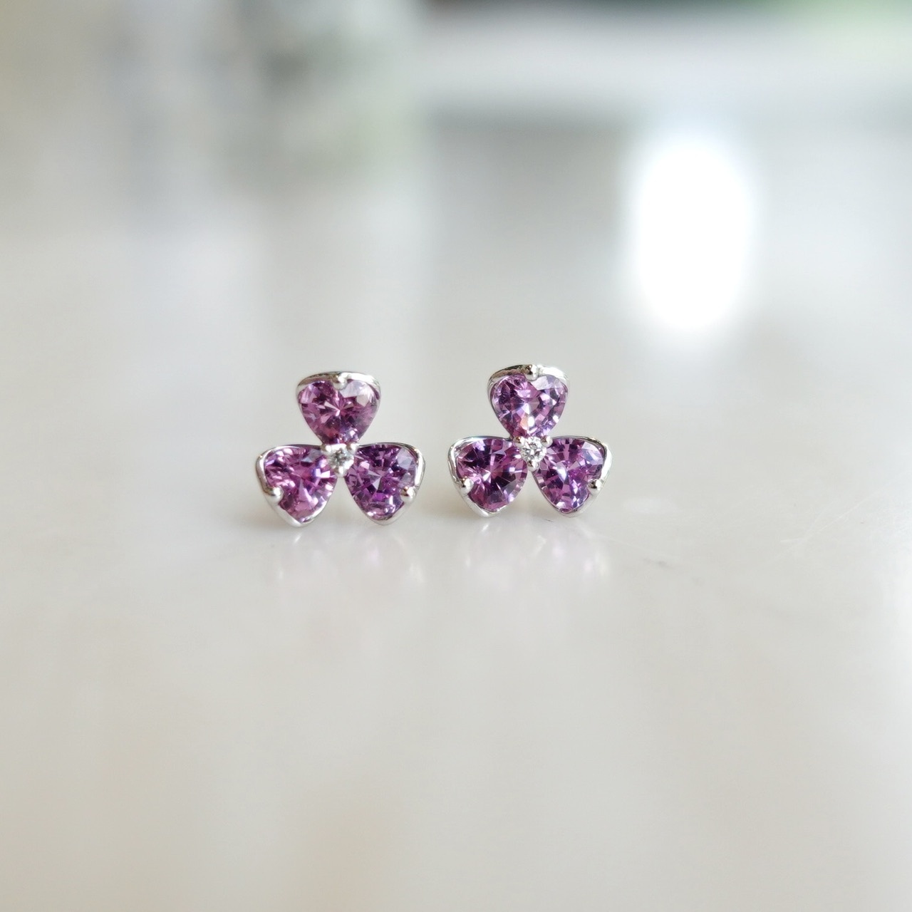 以三瓣花為靈感,每片花瓣鑲嵌心形粉紫色藍寶石,散發著甜美的夢幻光暈。設計精緻浪漫,超有氣質!
