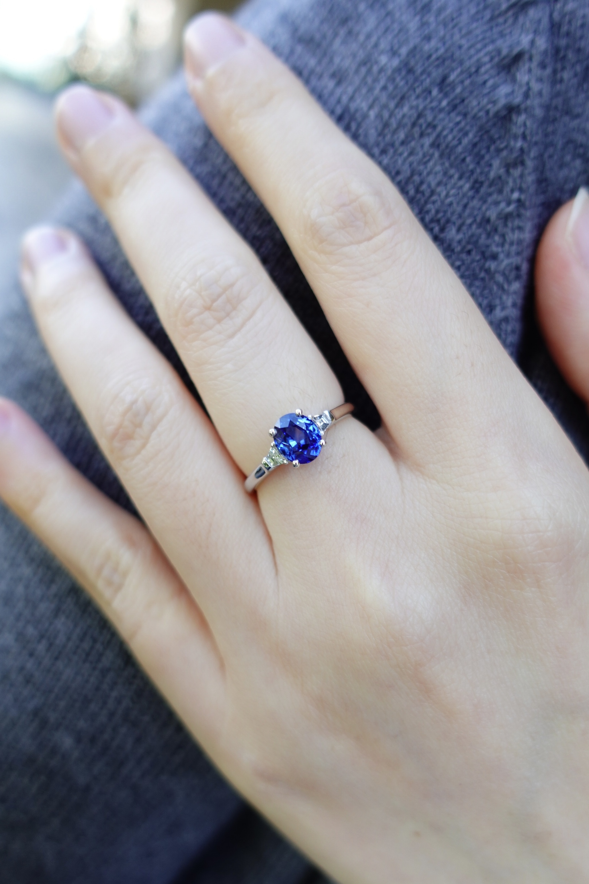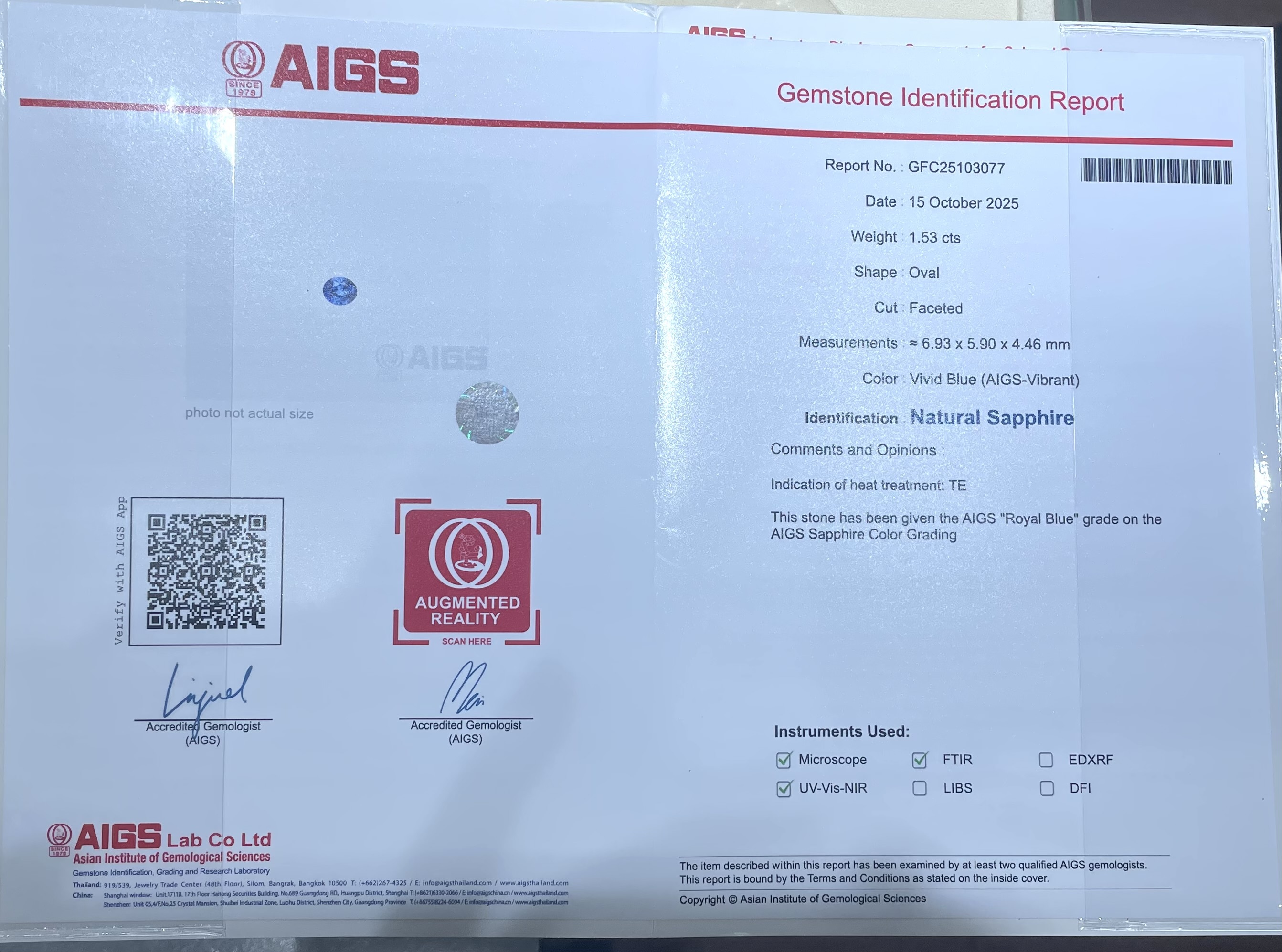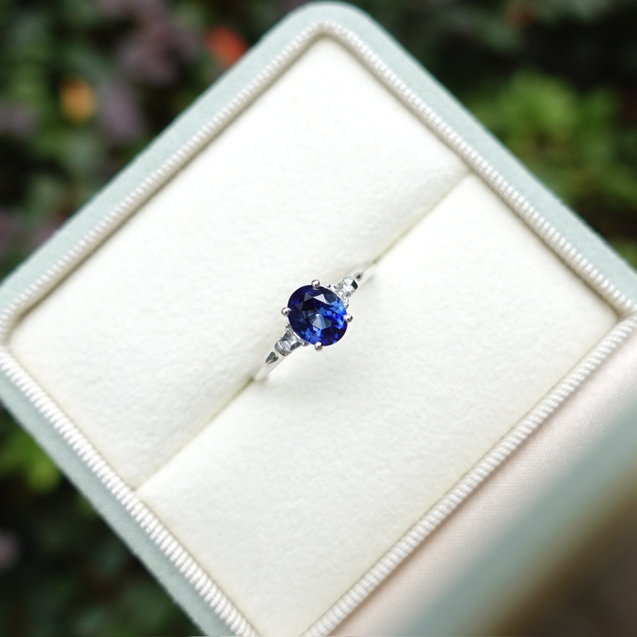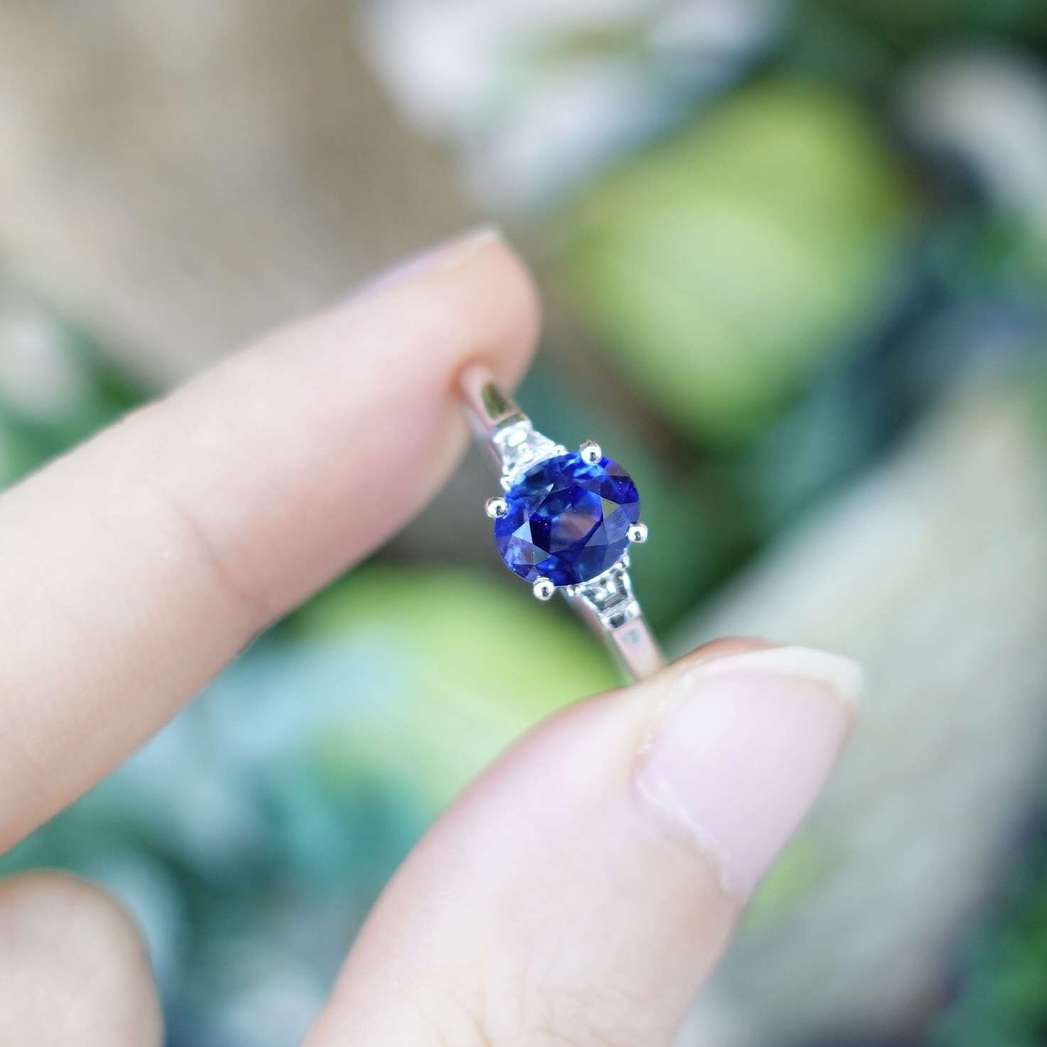The 1.5ct thick-cut royal blue sapphire trades a large table for superior brilliance—no excessive embellishment needed! Set in a minimalist three-stone design, it highlights the inherent beauty of the gemstone itself!