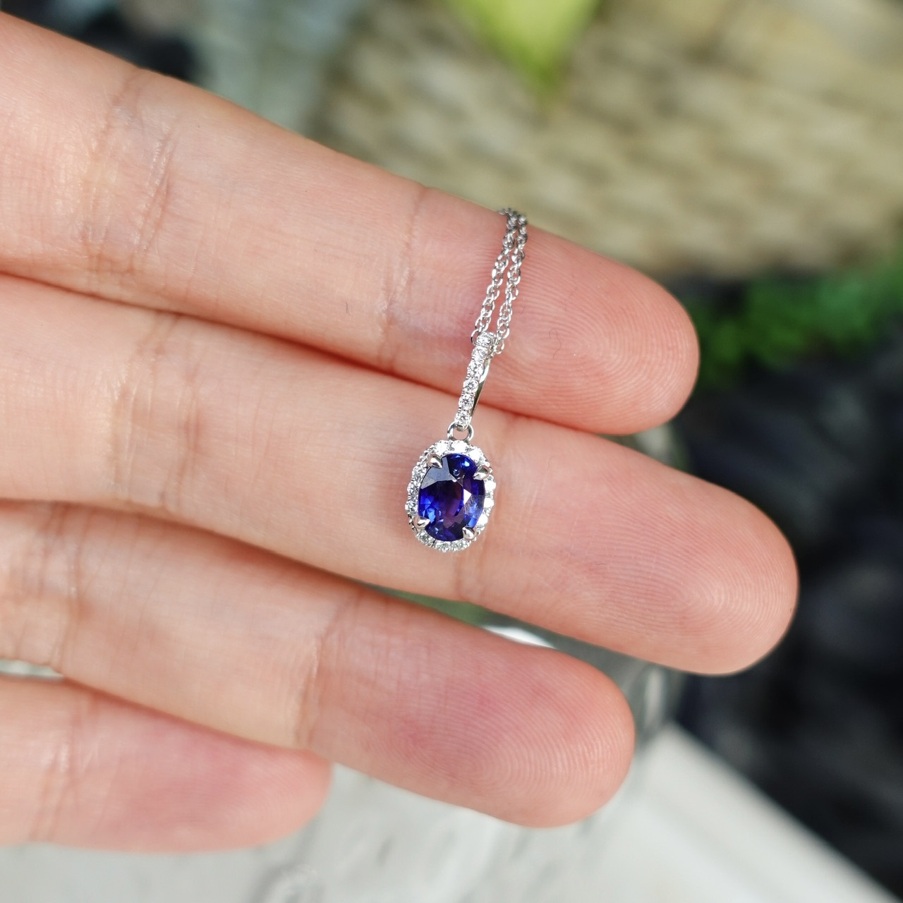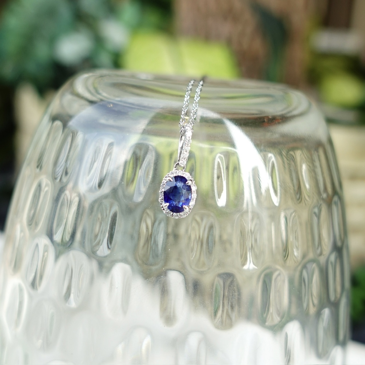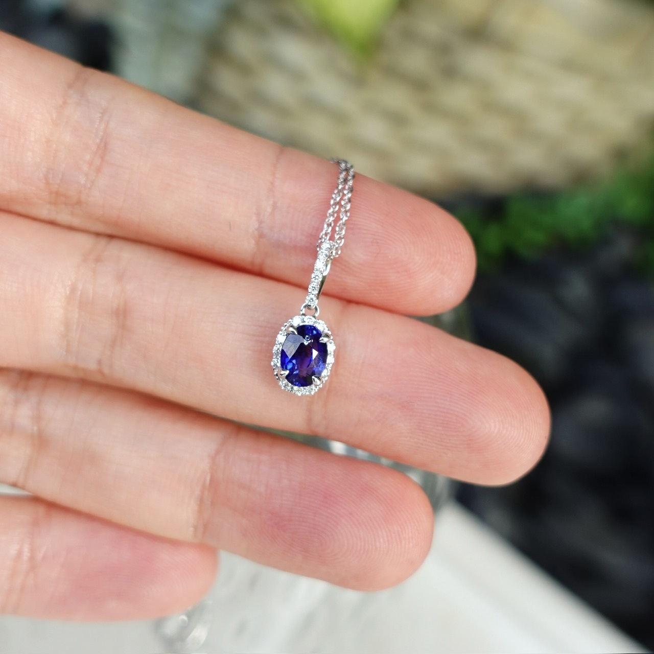 18K Gold Blue Sapphire Pendant with Diamonds setting - Oval