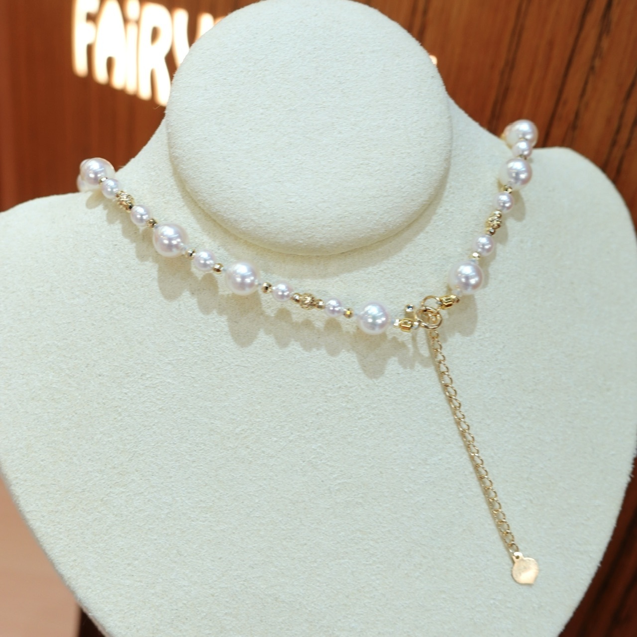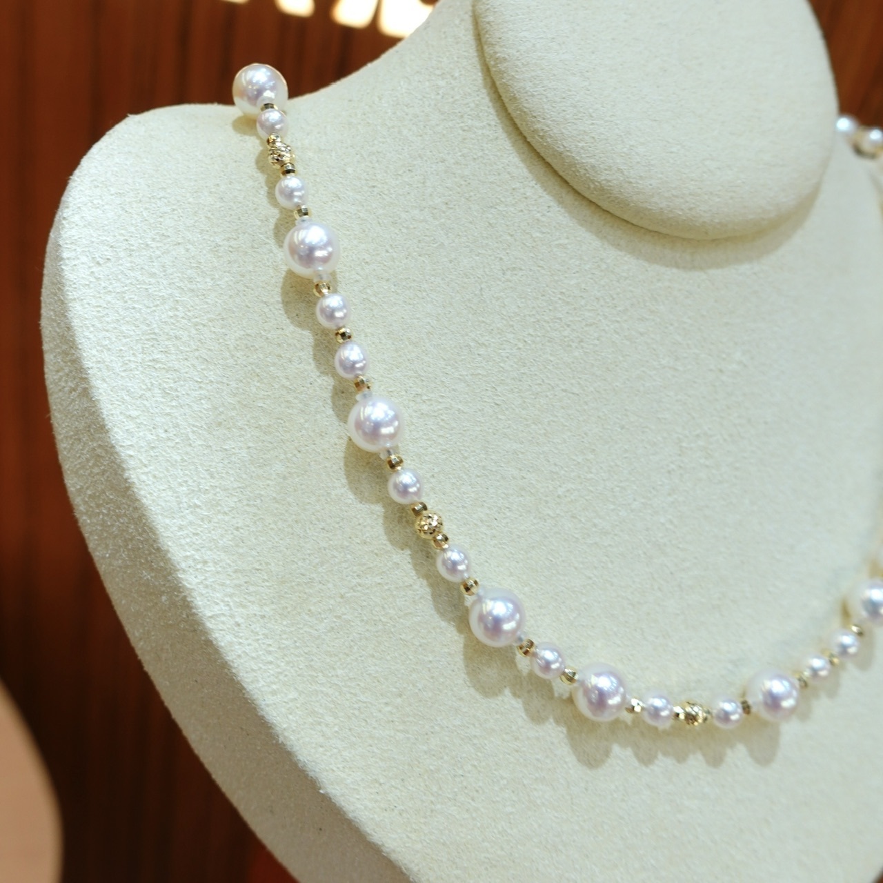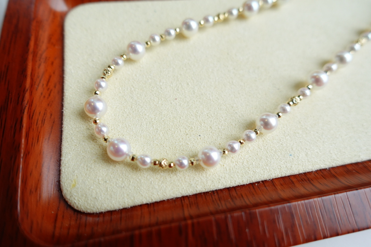 採用3.5-6.5mm不同尺寸的akoya珍珠錯落相間,豐富視覺層次感,百搭又時尚。皮光很好的Akoya珍珠帶粉嫩柔光,戴上變得額外顯眼,珍珠散落在頸間,感覺一下子被點亮了,款式不挑膚色不挑人,簡單搭配T shirt都非常出眾,隨意搭配都能非常出彩。18k鐳射切割小金球和Akoya錯落相間,光影相互映射呼應,閃耀吸晴,每一個細節都是手工量制,精緻不死板。