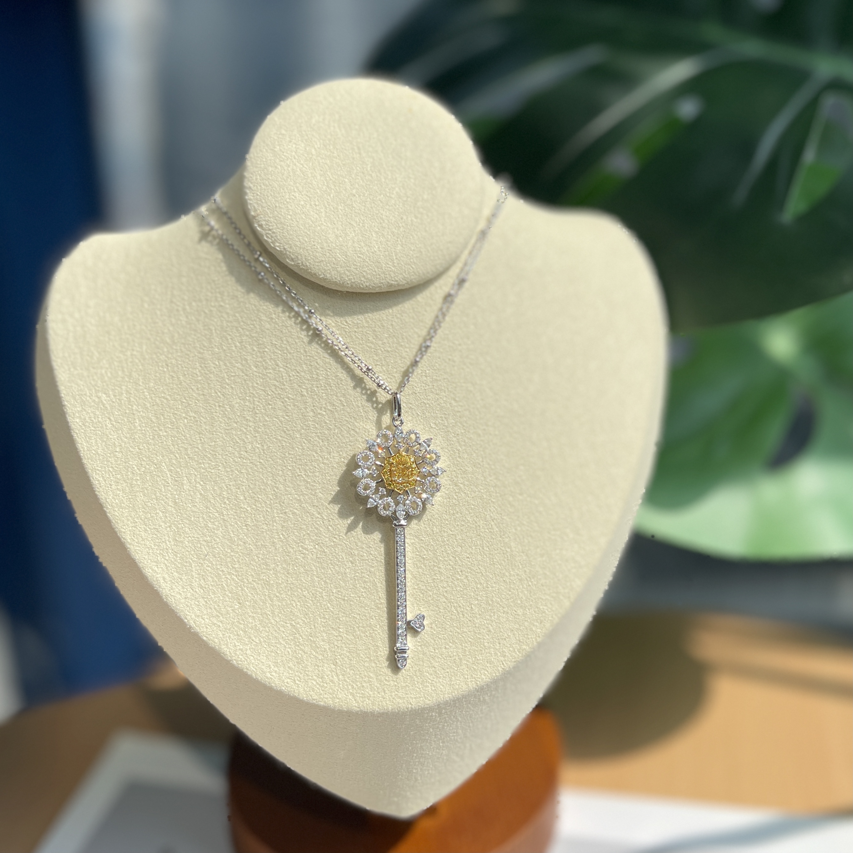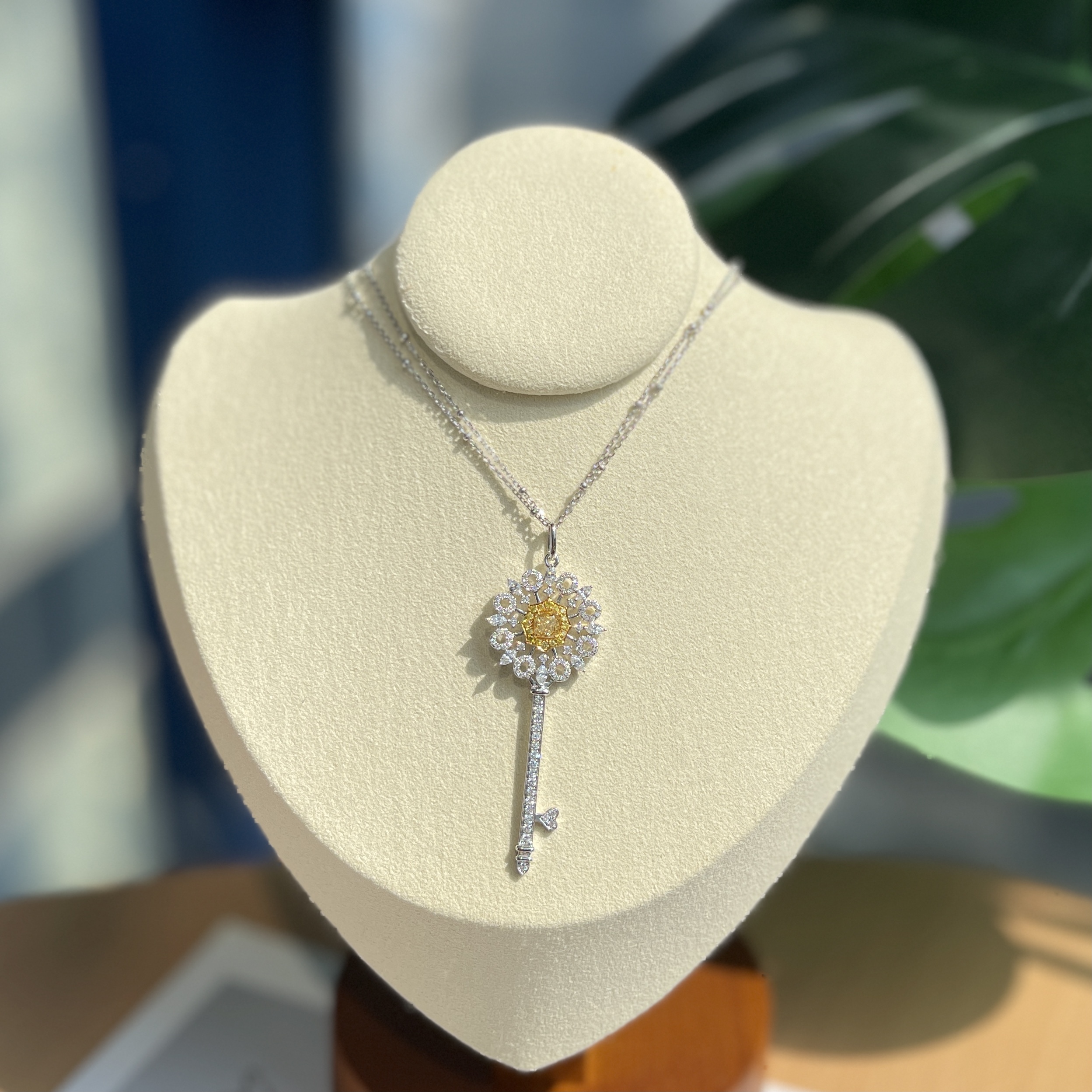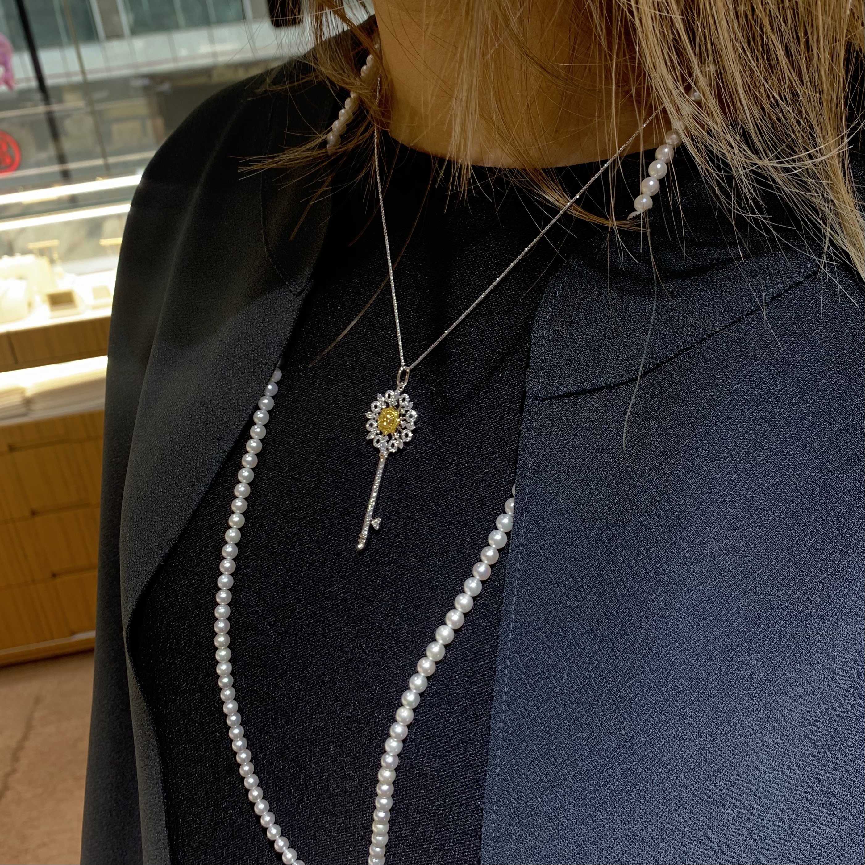 纖細精緻的鑰匙吊墜在項間擺動,為自信平添了一種特別的堅韌氣質,搭配鑲飾於吊墜的鑽石,煥發出迷人光彩