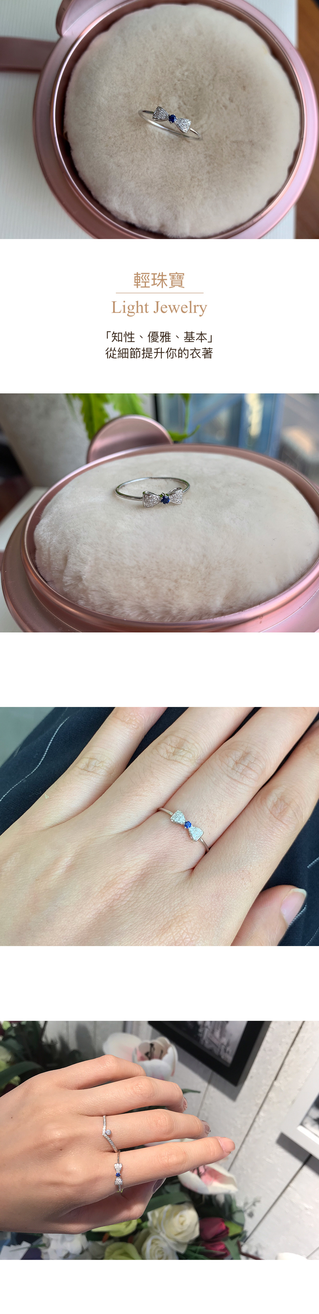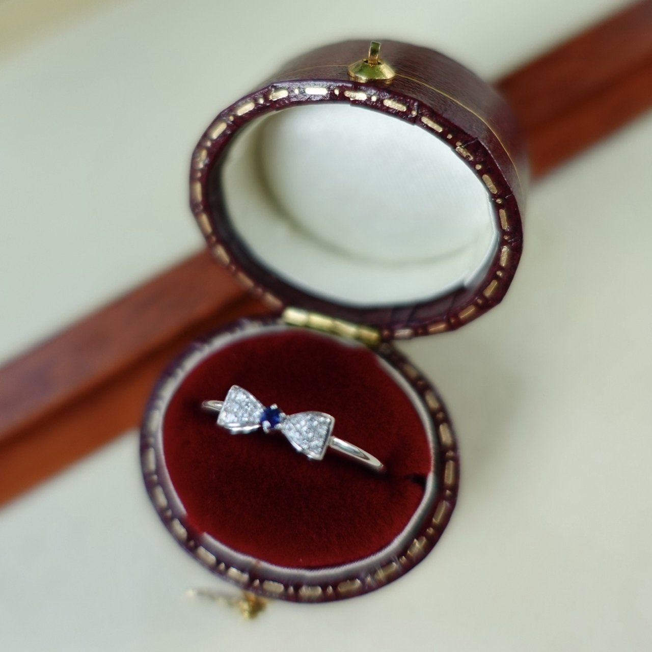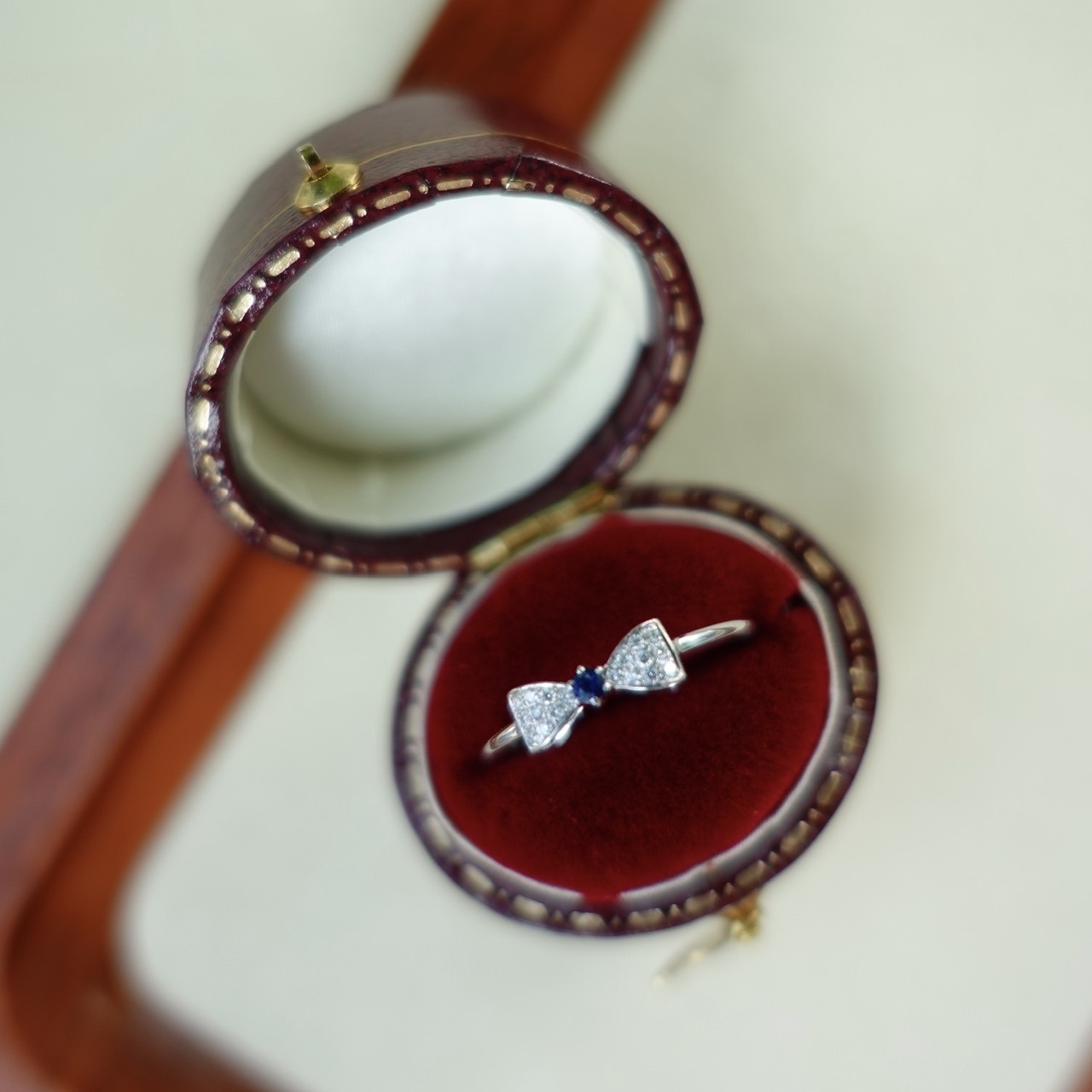 蝴蝶結造型,以一顆小藍寶石在為中心主石,旁邊鑲滿小鑽石,唯美之餘增添一點可愛玩味感。