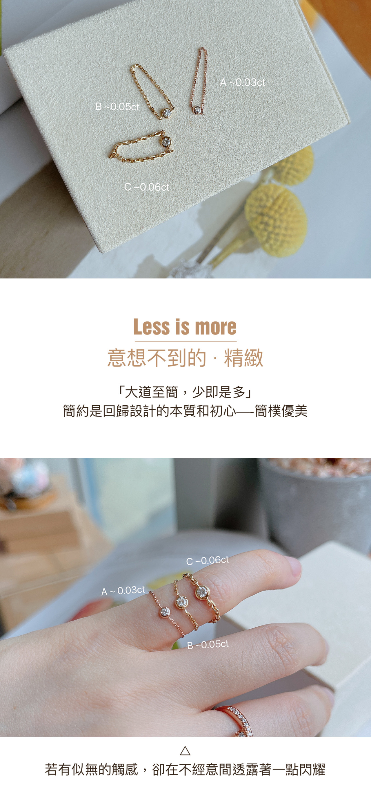 以全18K金打造的鏈條戒,主石採用3爪鑲疊加水泡底托,有放大鑽石的視覺效果同時,又不礙於鑽石的折射,上手既可愛又blingbling。