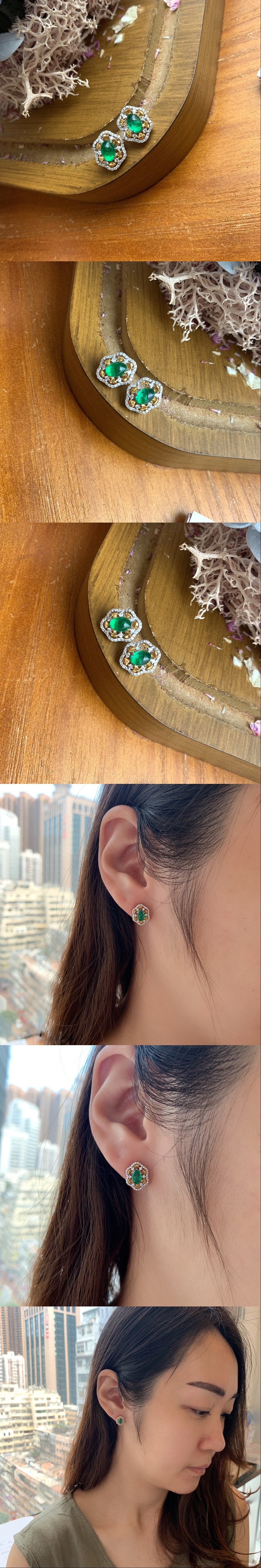 耳釘採用雙色金設計,以18K黃金瓜鑲,四周以黃金立體造型點綴主石,鑲工極奇考驗師傅手工;外圍以波浪形態鑲嵌一圈鑽石,雙色金為視覺效果帶來衝擊,添上復古品味。