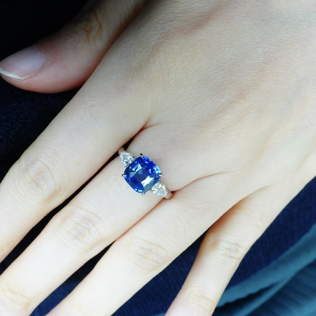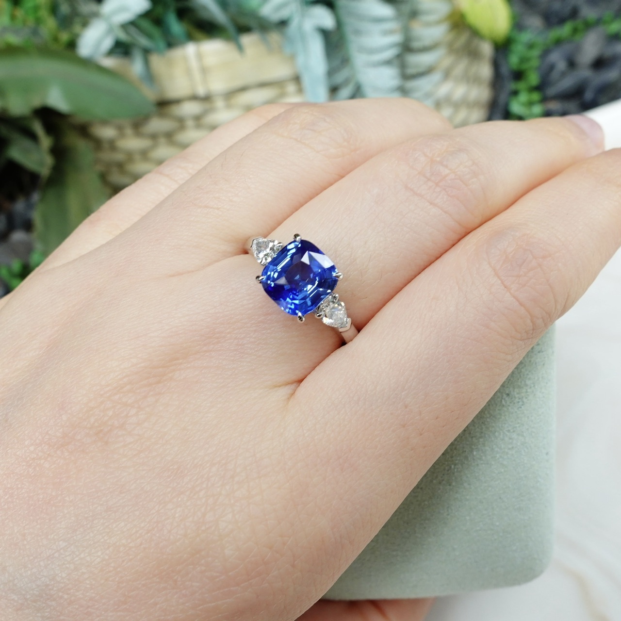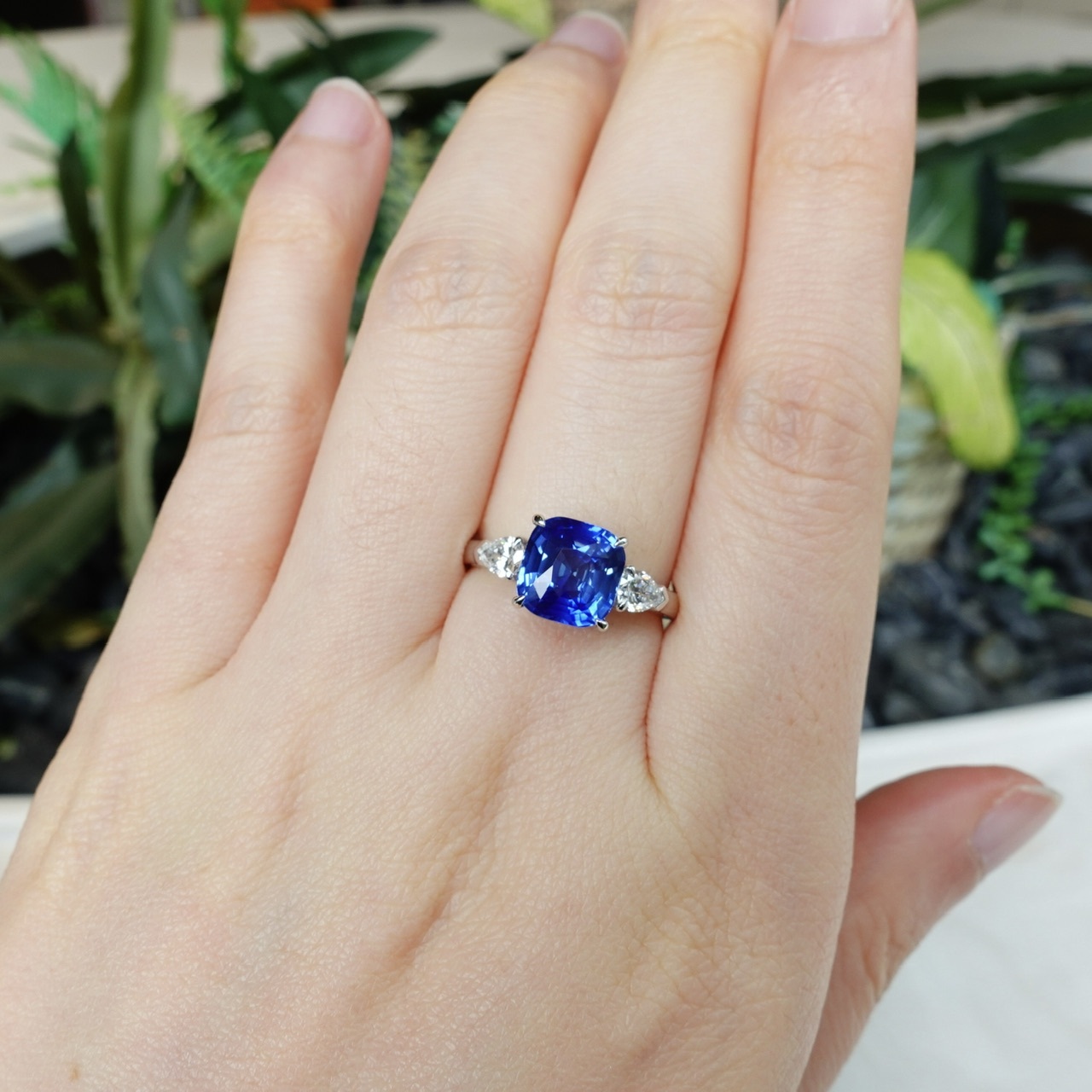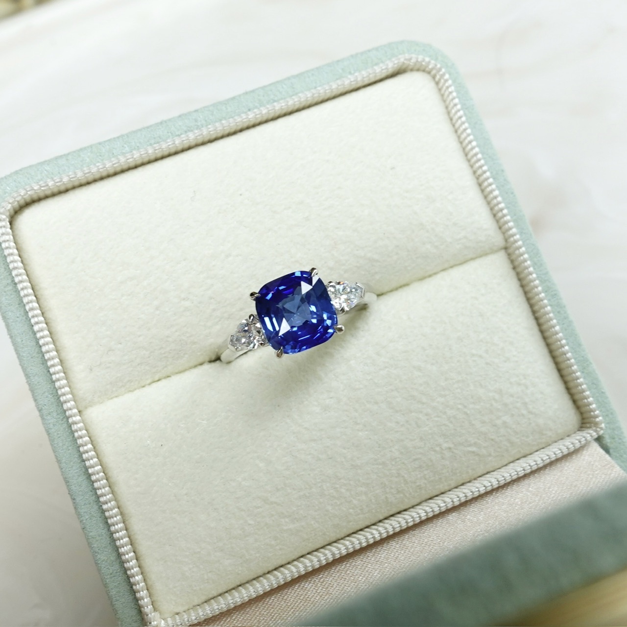 主石3.1ct的墊形切割矢車菊藍寶石,色澤純正明亮,晶體透亮,淨度突出。經典三石款設計,於主石兩旁鑲嵌梨形鑽石,款式歷久彌新。佩戴上手,氣質滿滿。