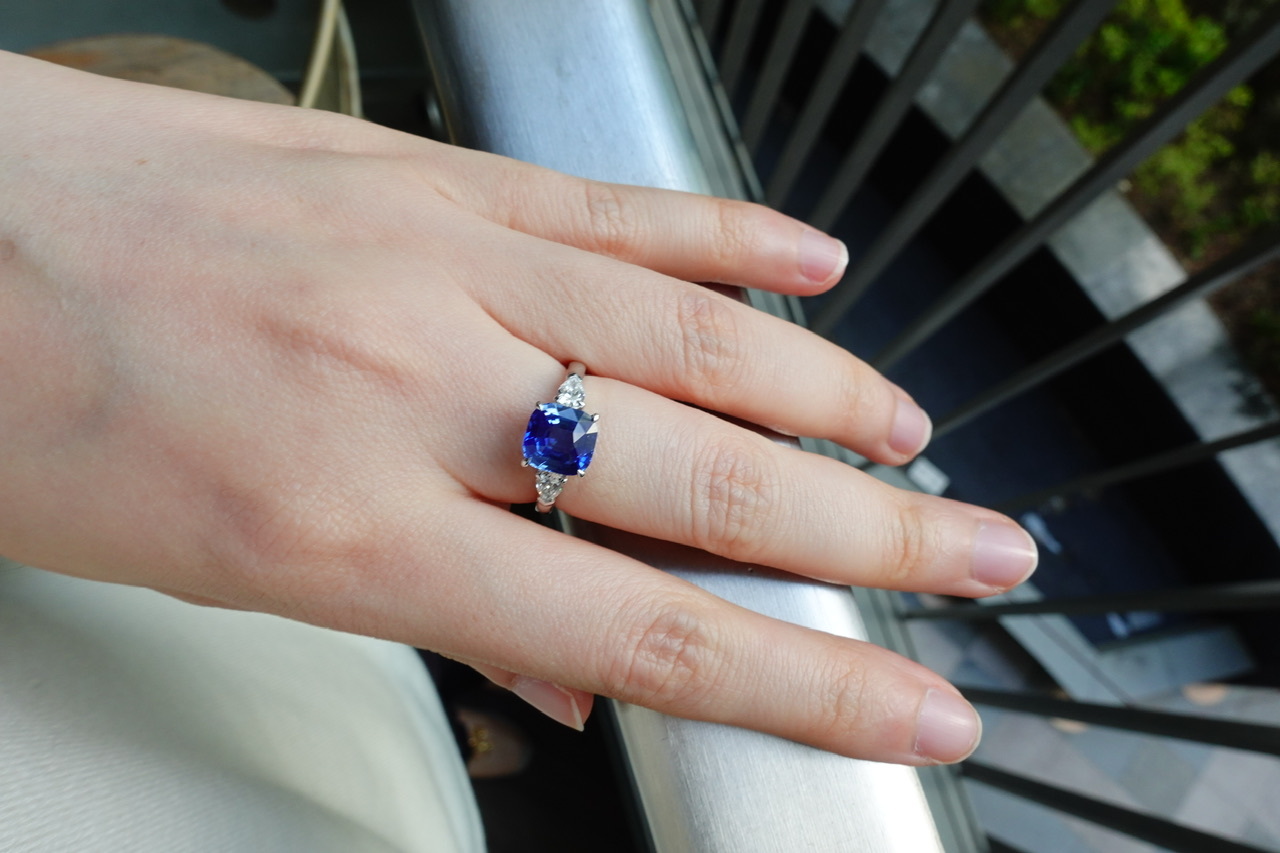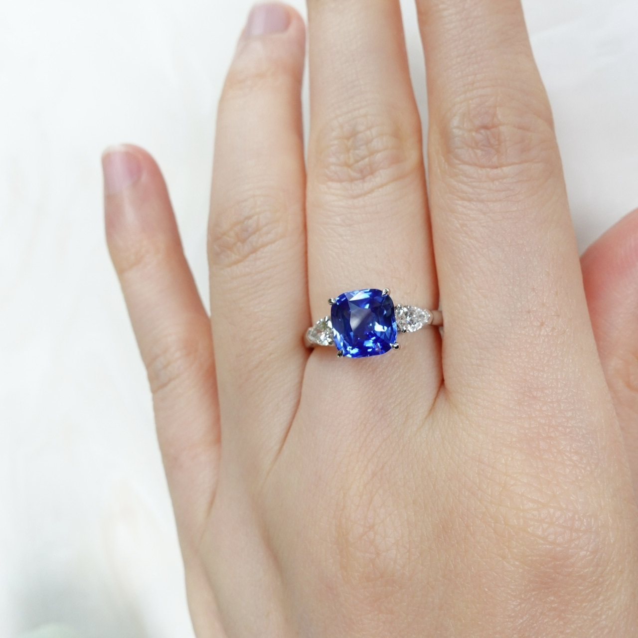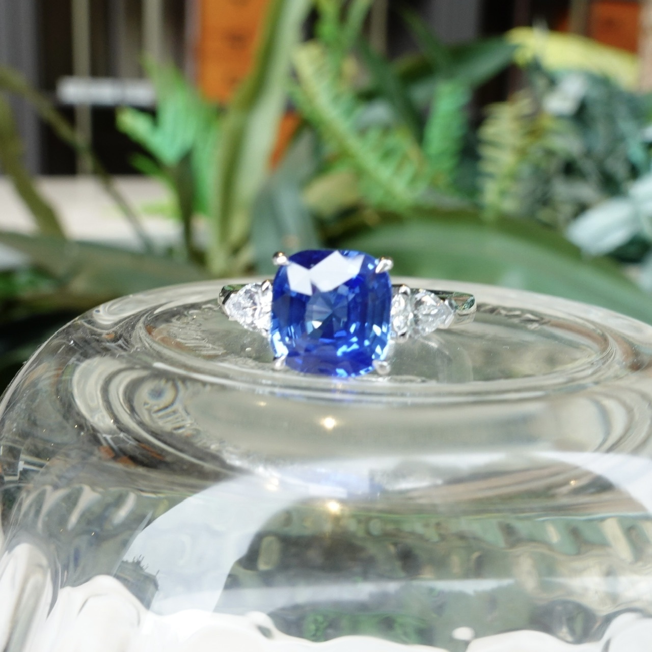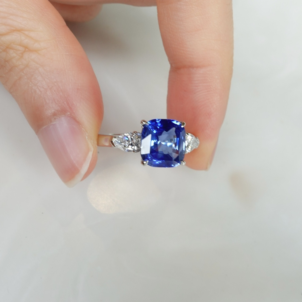 主石3.1ct的墊形切割矢車菊藍寶石,色澤純正明亮,晶體透亮,淨度突出。經典三石款設計,於主石兩旁鑲嵌梨形鑽石,款式歷久彌新。佩戴上手,氣質滿滿。