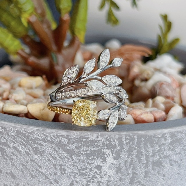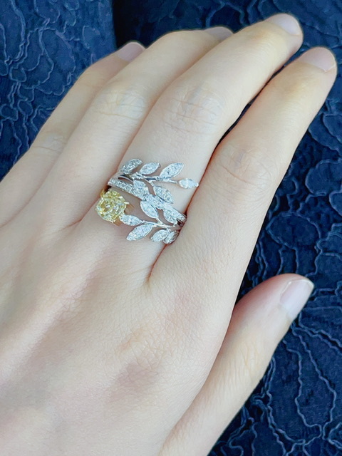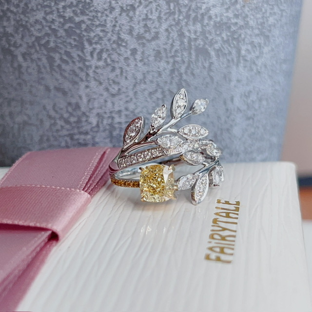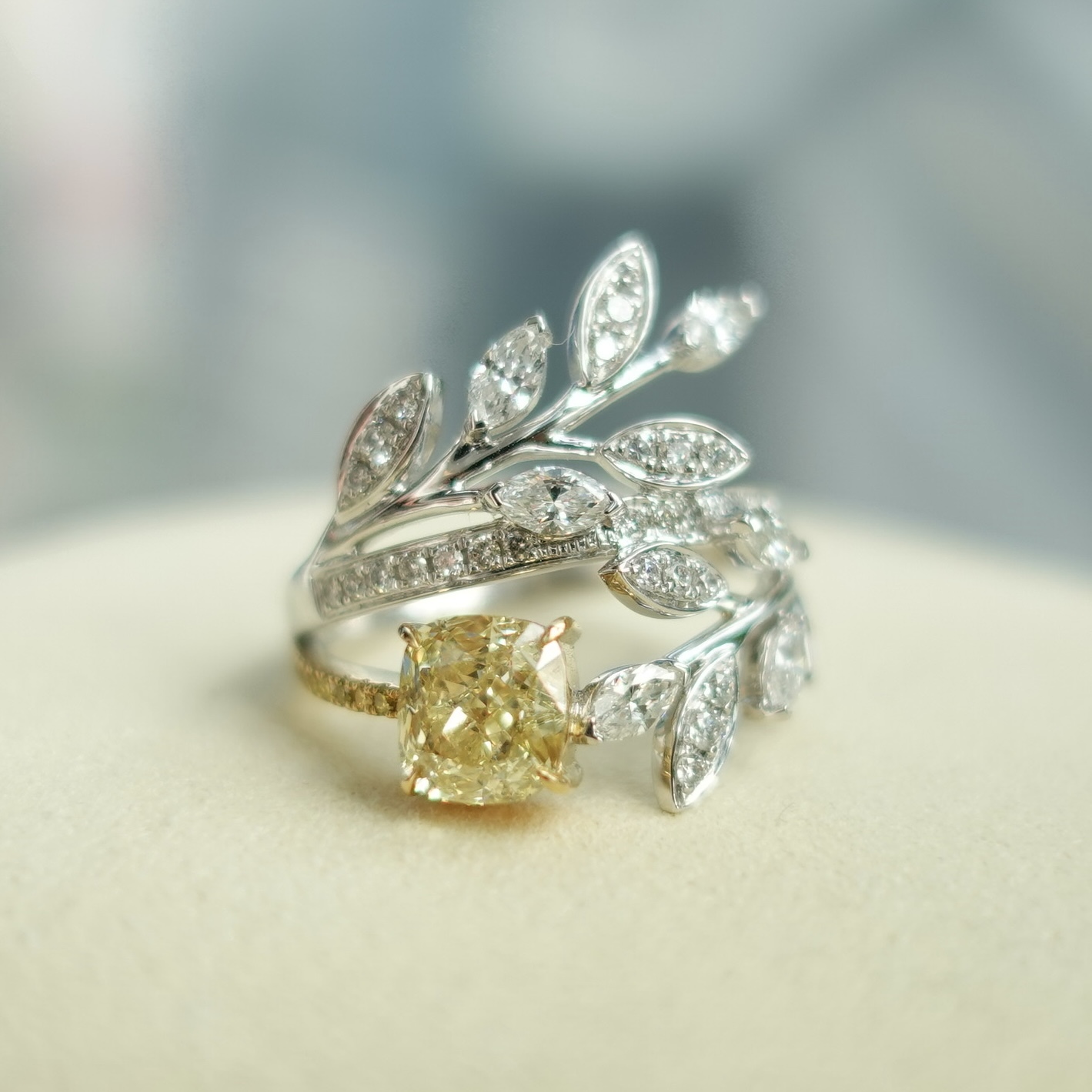 這款黃鑽戒指以橄欖尖造型呈現葉片的自然美感,環繞在指間時更加生動自然。重達1.3卡Fancy Yellow (彩黃鑽)融入桂冠式的戒指設計中,綻放出閃爍溫暖的火彩,充滿生命