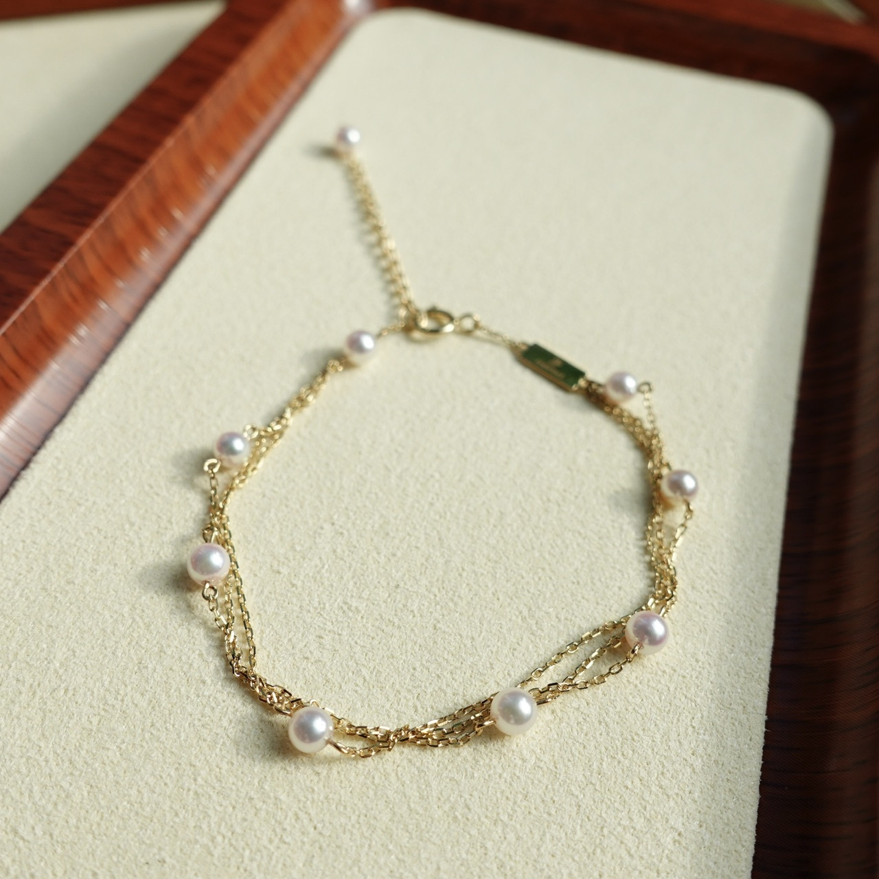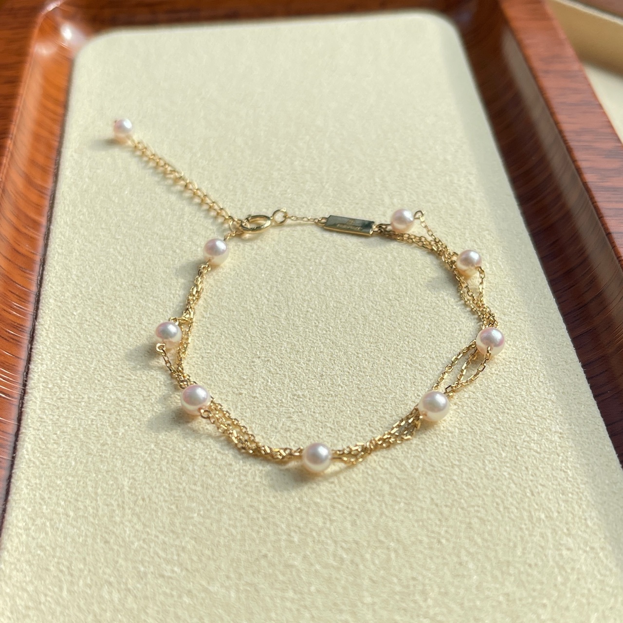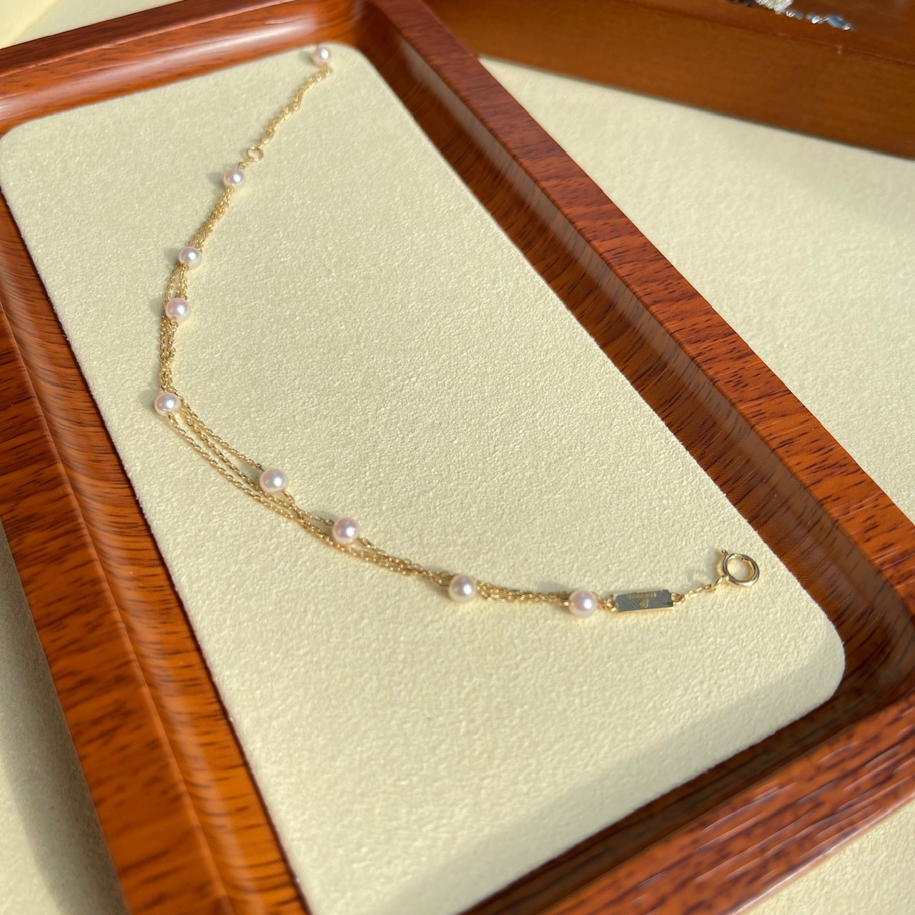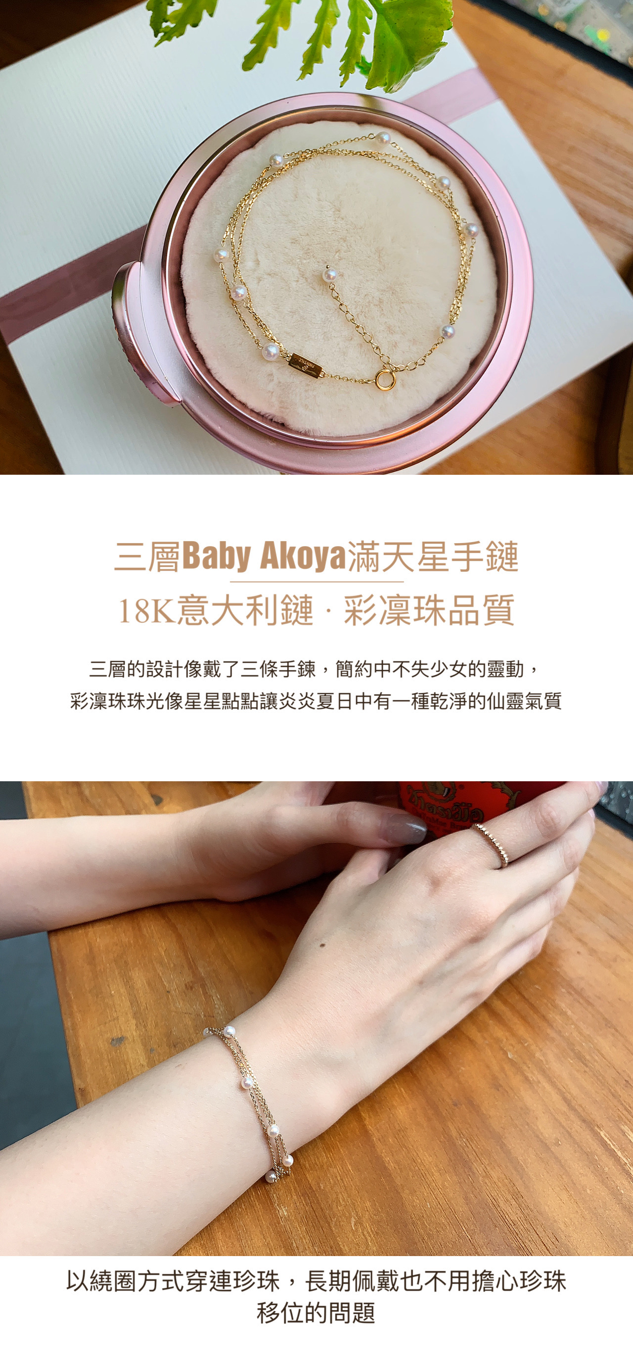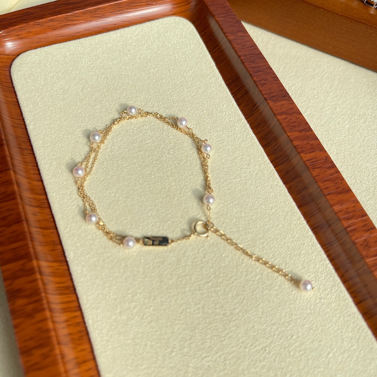手鏈採用9顆3.5-4mm彩凜珠品質的baby akoya ,顆顆小燈泡一樣的光澤,鏈尾繫上一顆小珍珠作結,可愛又靈動。另外鏈身是大牌子慣用的意大利18K金鍊,質感非常好,並以繞圈方式穿連珍珠,長期佩戴也不用擔心珍珠移位的問題。