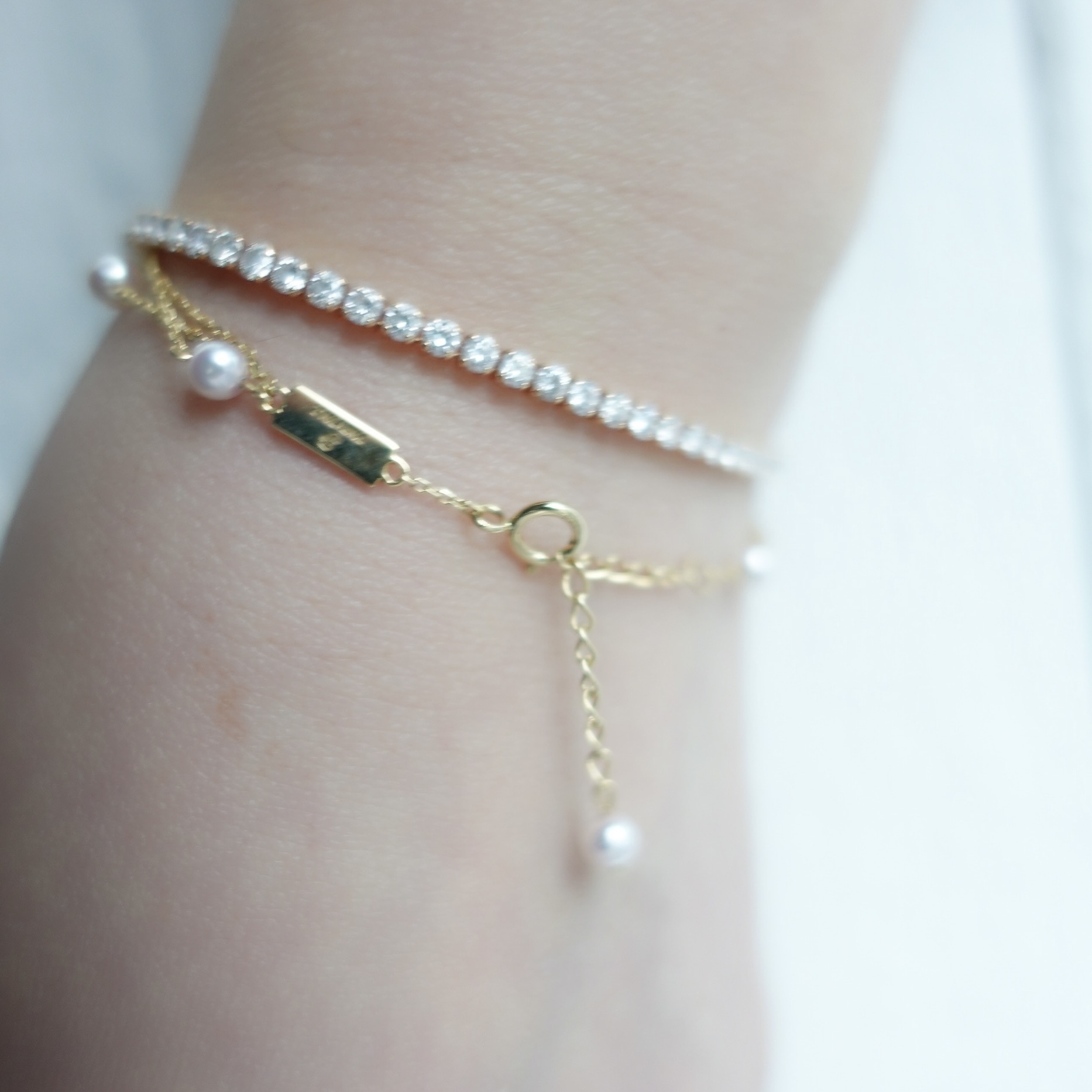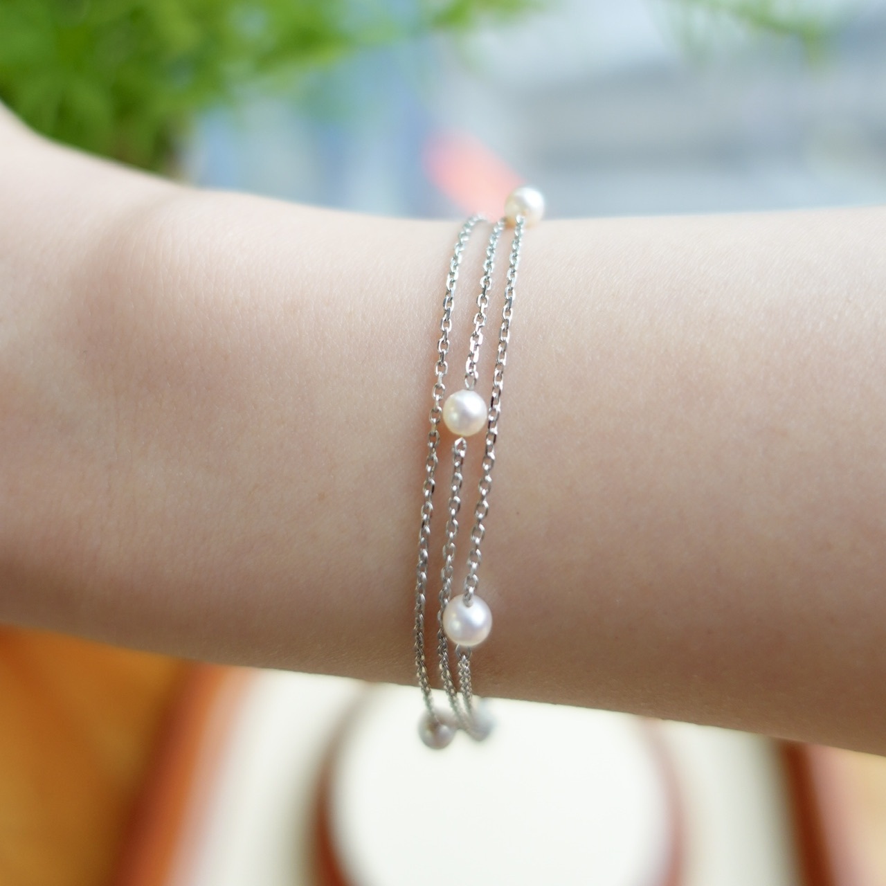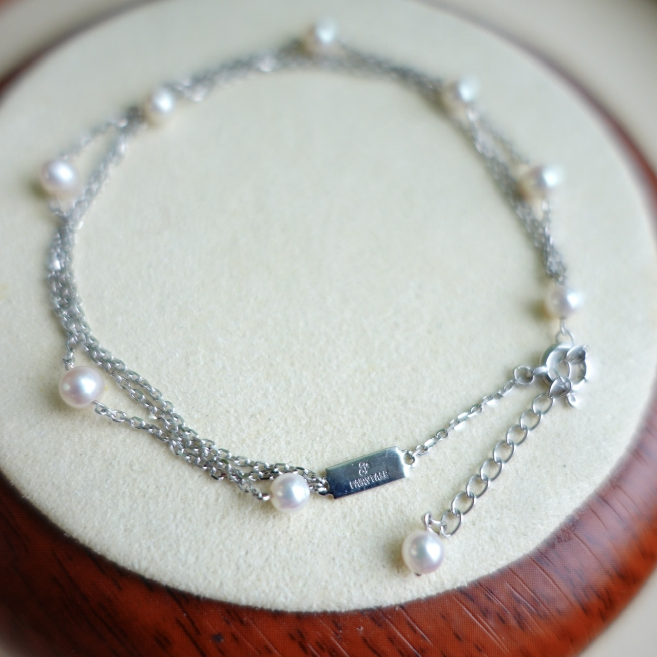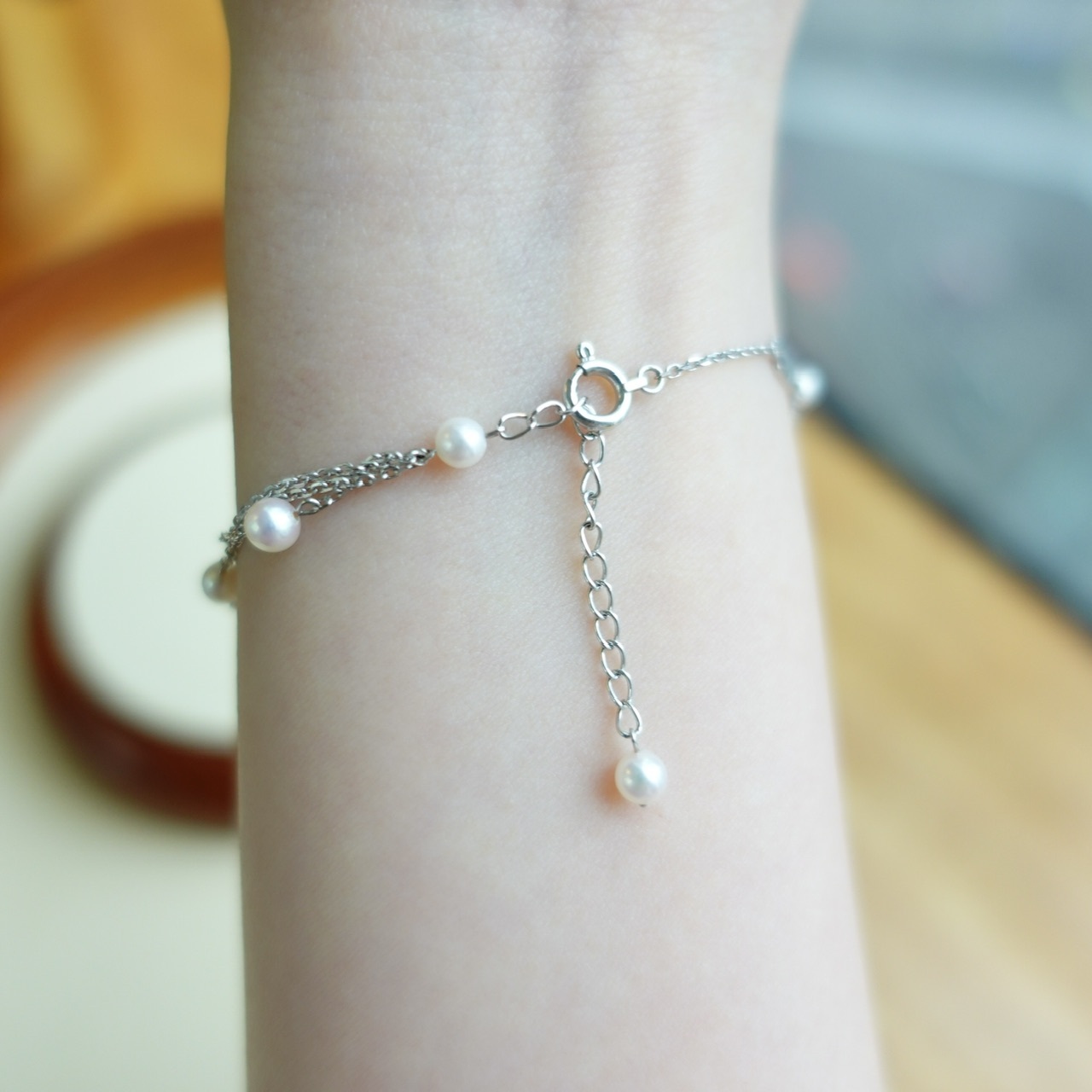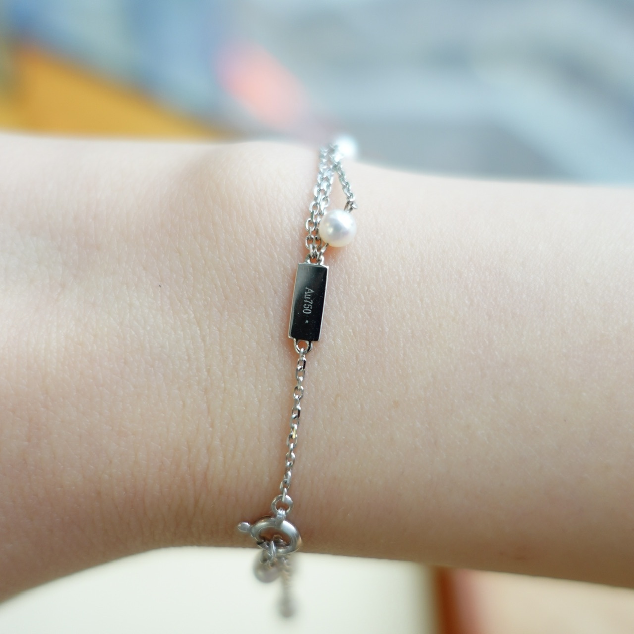 手鏈採用9顆3.5-4mm彩凜珠品質的baby akoya ,顆顆小燈泡一樣的光澤,鏈尾繫上一顆小珍珠作結,可愛又靈動。另外鏈身是大牌子慣用的意大利18K金鍊,質感非常好,並以繞圈方式穿連珍珠,長期佩戴也不用擔心珍珠移位的問題。