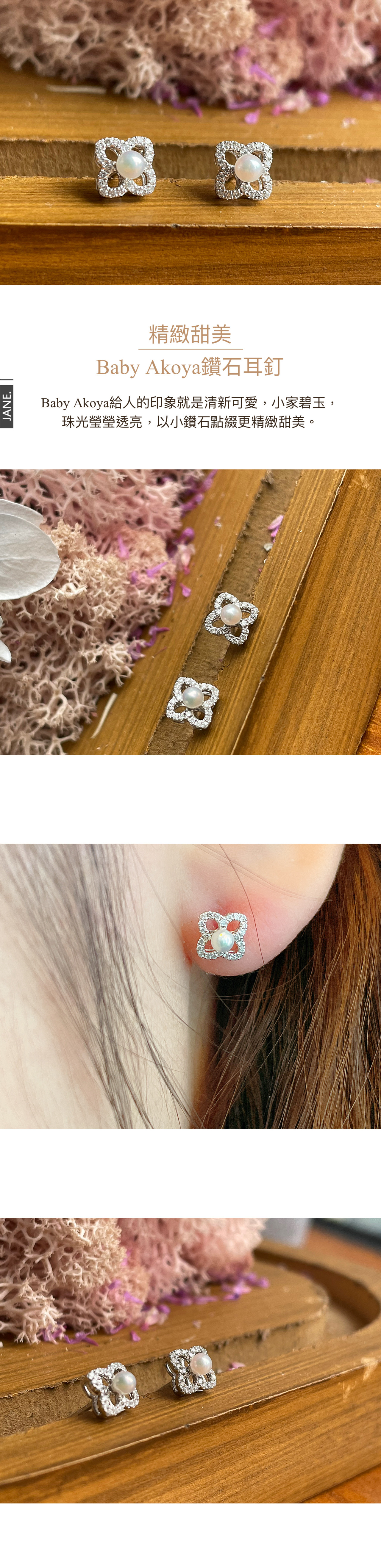 Baby Akoya給人的印象就是清新可愛,光澤強如小燈泡,像這種2.5mm的極小baby akoya因為產量少,養殖成本高,市場上非常稀缺!耳釘以小鑽石圍邊組成鏤空四葉草,做工非常精緻,中間鑲上2.5mm的baby akoya,珠光瑩瑩透亮,戴上耳顯得清新甜美。