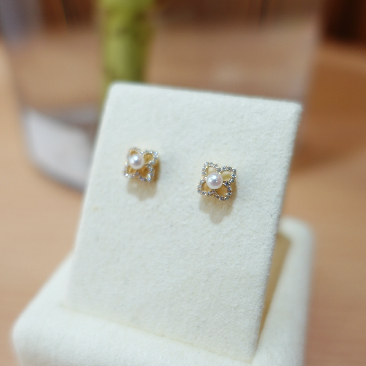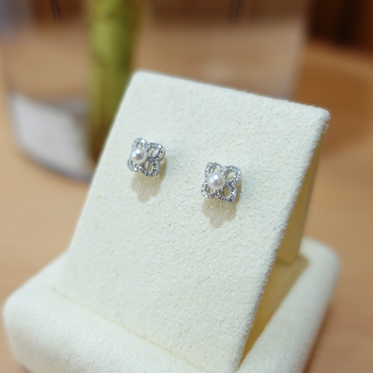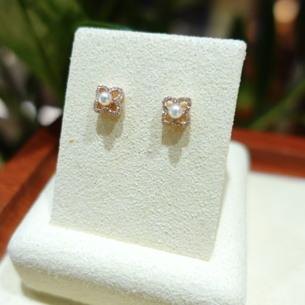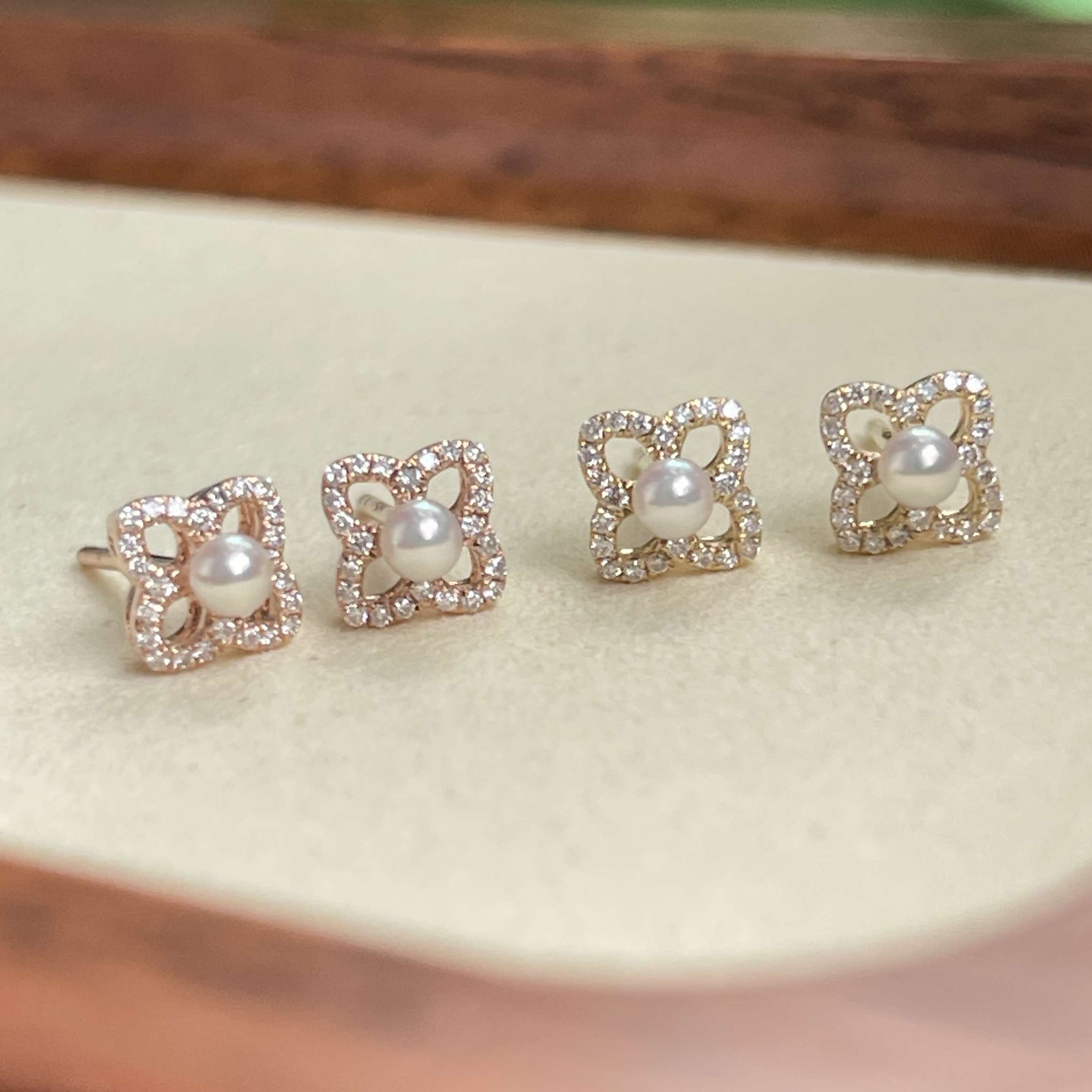 Baby Akoya給人的印象就是清新可愛,光澤強如小燈泡💡,像這種2.5mm的極小baby akoya因為產量少,養殖成本高,市場上非常稀缺!耳釘以小鑽石圍邊組成鏤空四葉草,做工非常精緻,中間鑲上2.5mm的baby akoya,珠光瑩瑩透亮,戴上耳顯得清新甜美。