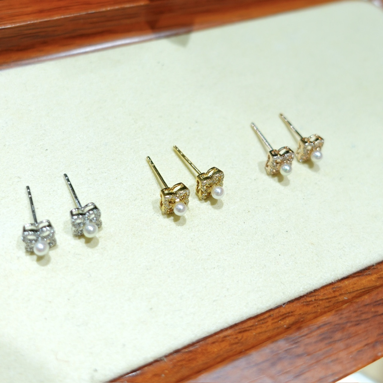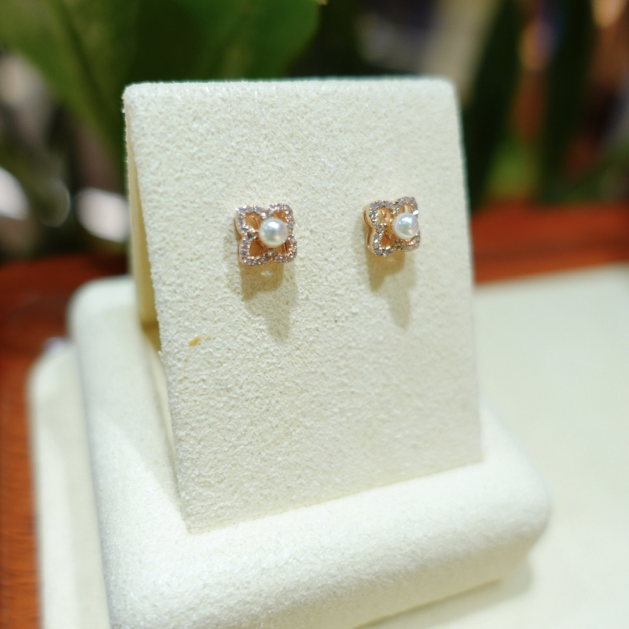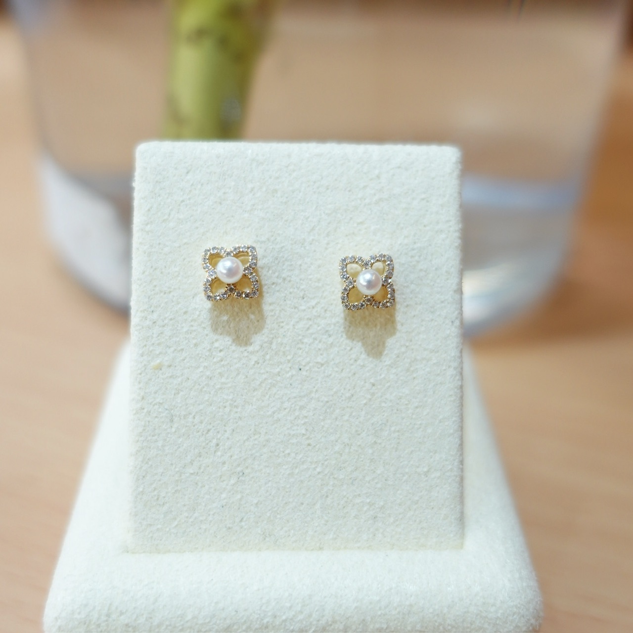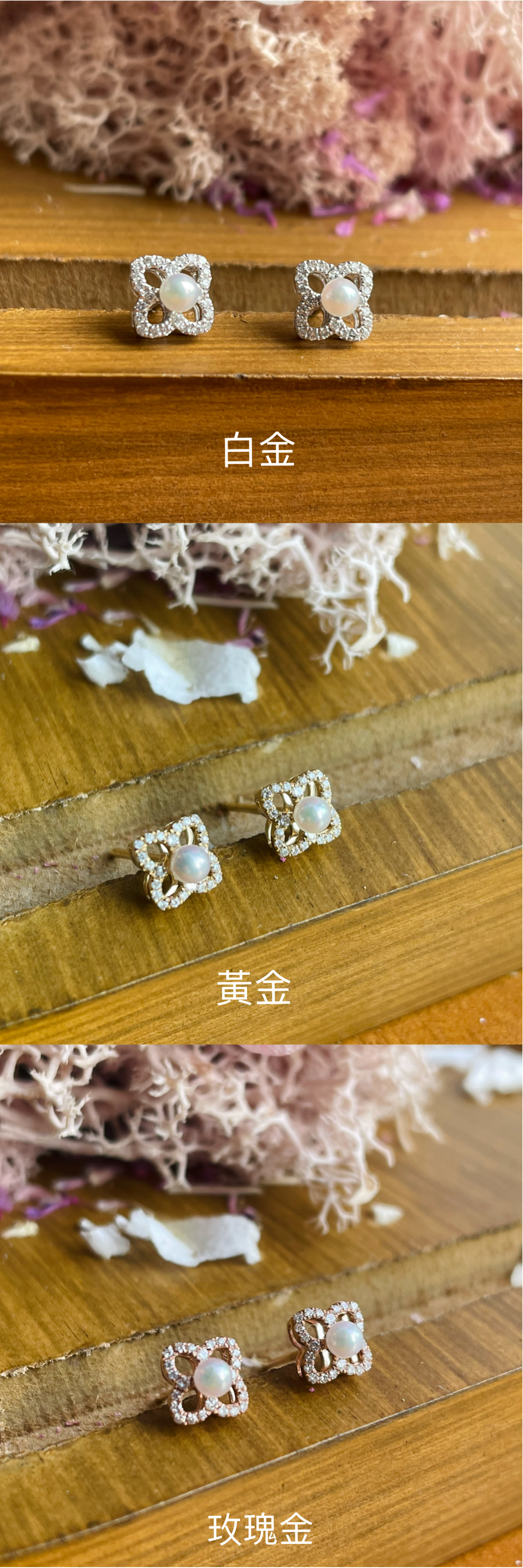 Baby Akoya給人的印象就是清新可愛,光澤強如小燈泡💡,像這種2.5mm的極小baby akoya因為產量少,養殖成本高,市場上非常稀缺!耳釘以小鑽石圍邊組成鏤空四葉草,做工非常精緻,中間鑲上2.5mm的baby akoya,珠光瑩瑩透亮,戴上耳顯得清新甜美。