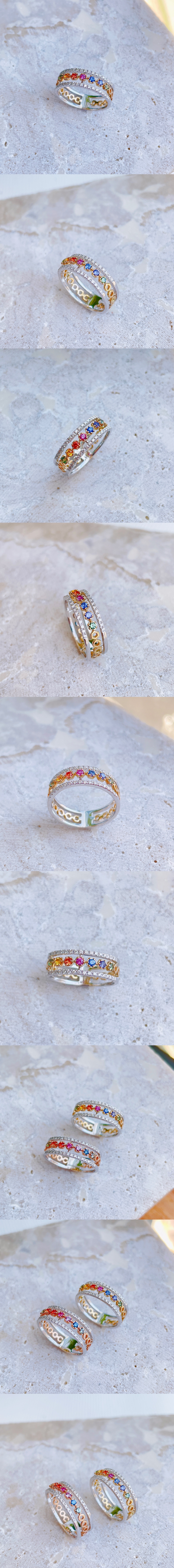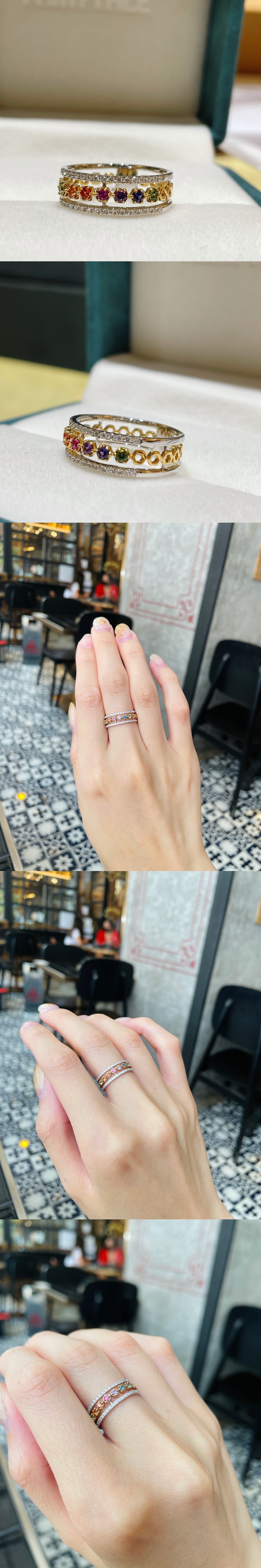 18K雙色金彩虹藍寶石鑽石鏤空戒指