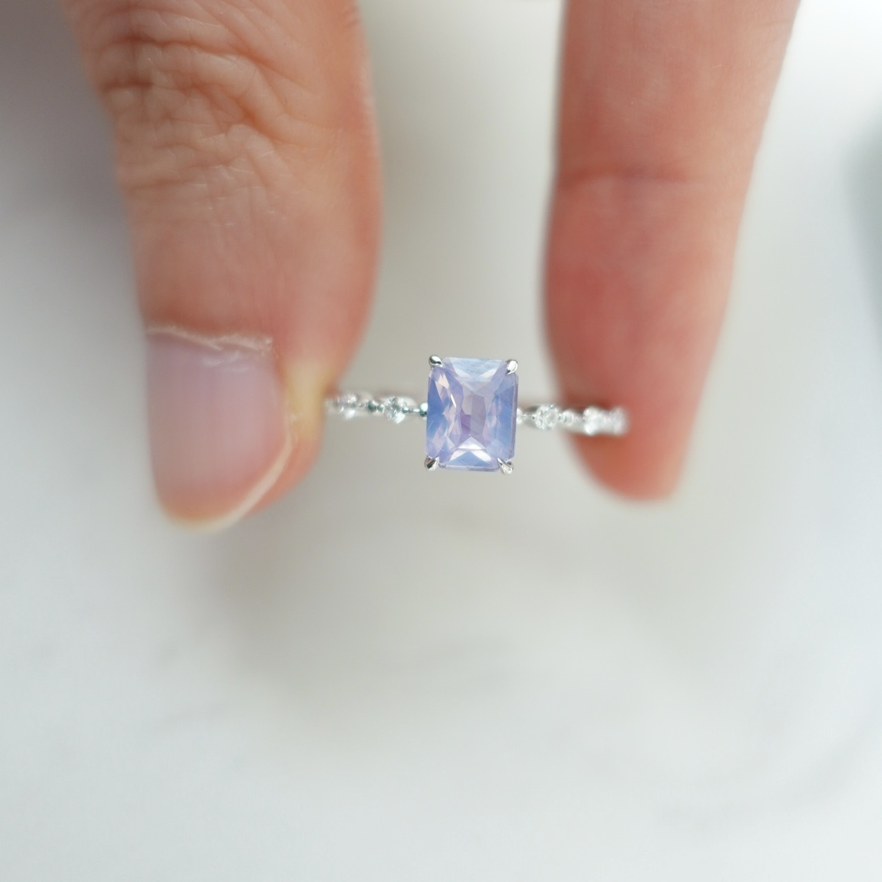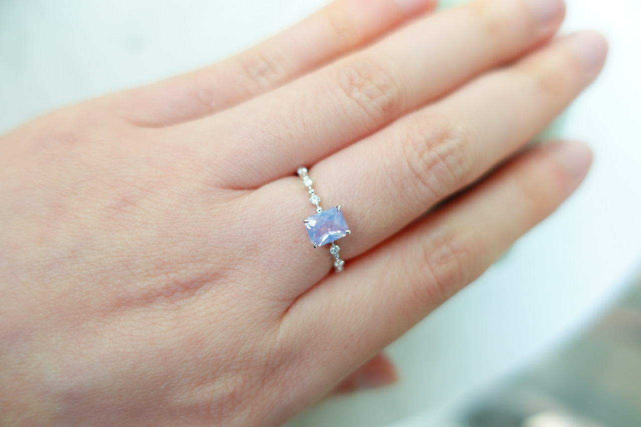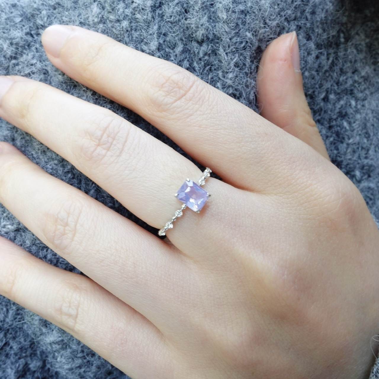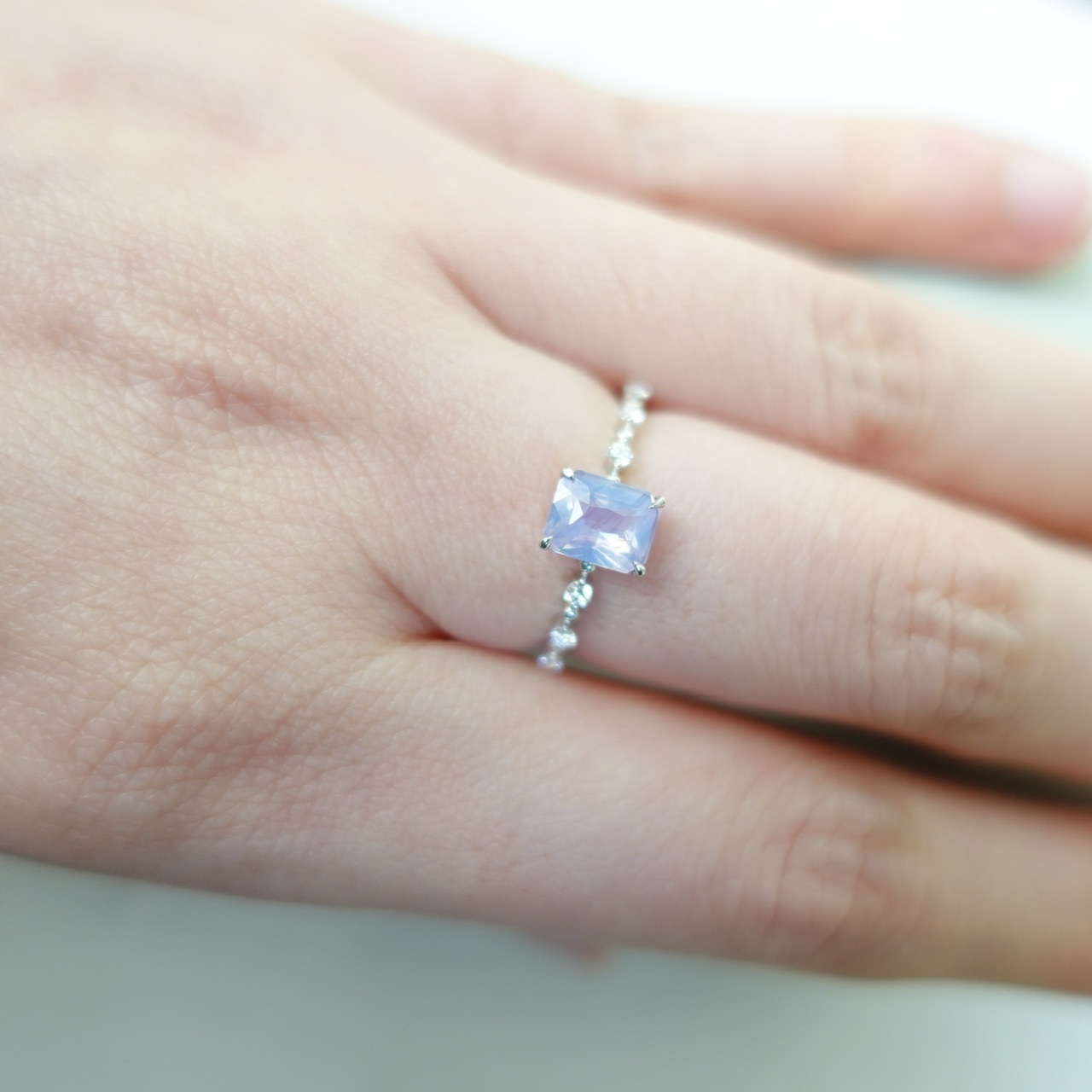 微奶體寶石自帶朦朧底色,有控種朦朧美!這枚Emerald cut粉紫色藍寶石,在微奶體的暈染中交融漸變,似水彩在絹帛上自然洇開。轉動寶石時產生的返火,恰似混沌夢境中破土而出的種子,終將長出烈日驕陽!