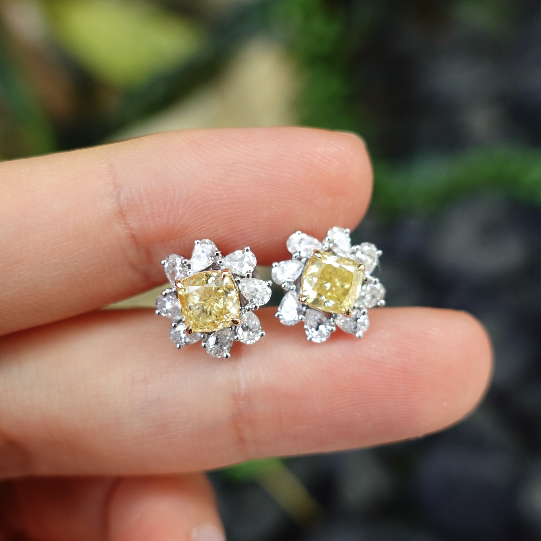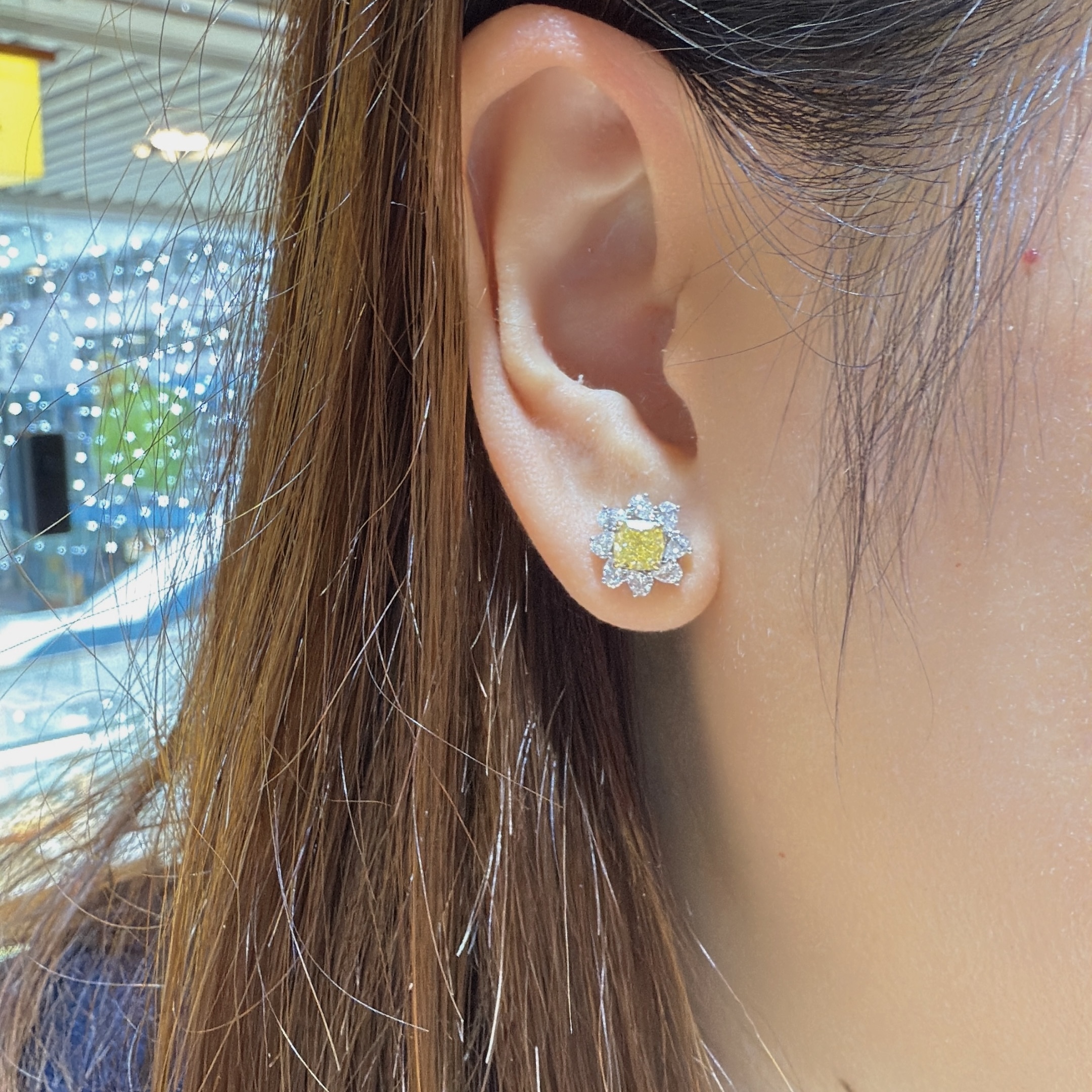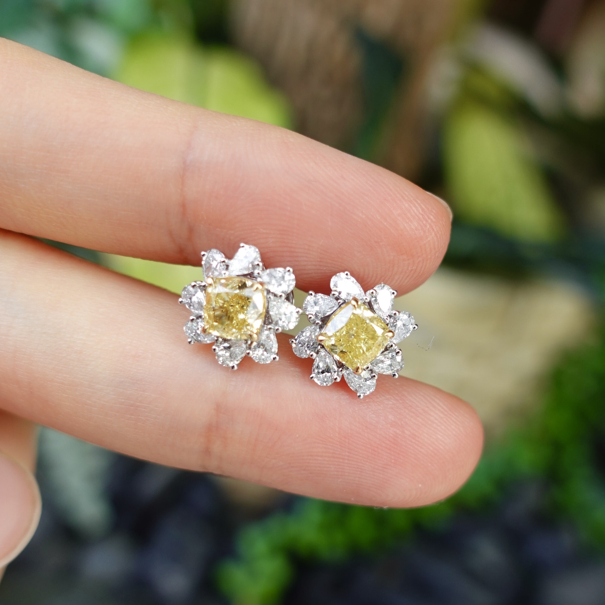 天然彩黃鑽耳環,主石各重80分,以雙枕形黃鑽為主石,圍鑲梨形白鑽,整體如盛開的向日葵。色彩對比鮮明,光影交織間,宛如將陽光戴於耳際,黃鑽色澤暖亮如燦陽,日常佩戴亦能點亮造型,展現優雅與活力。