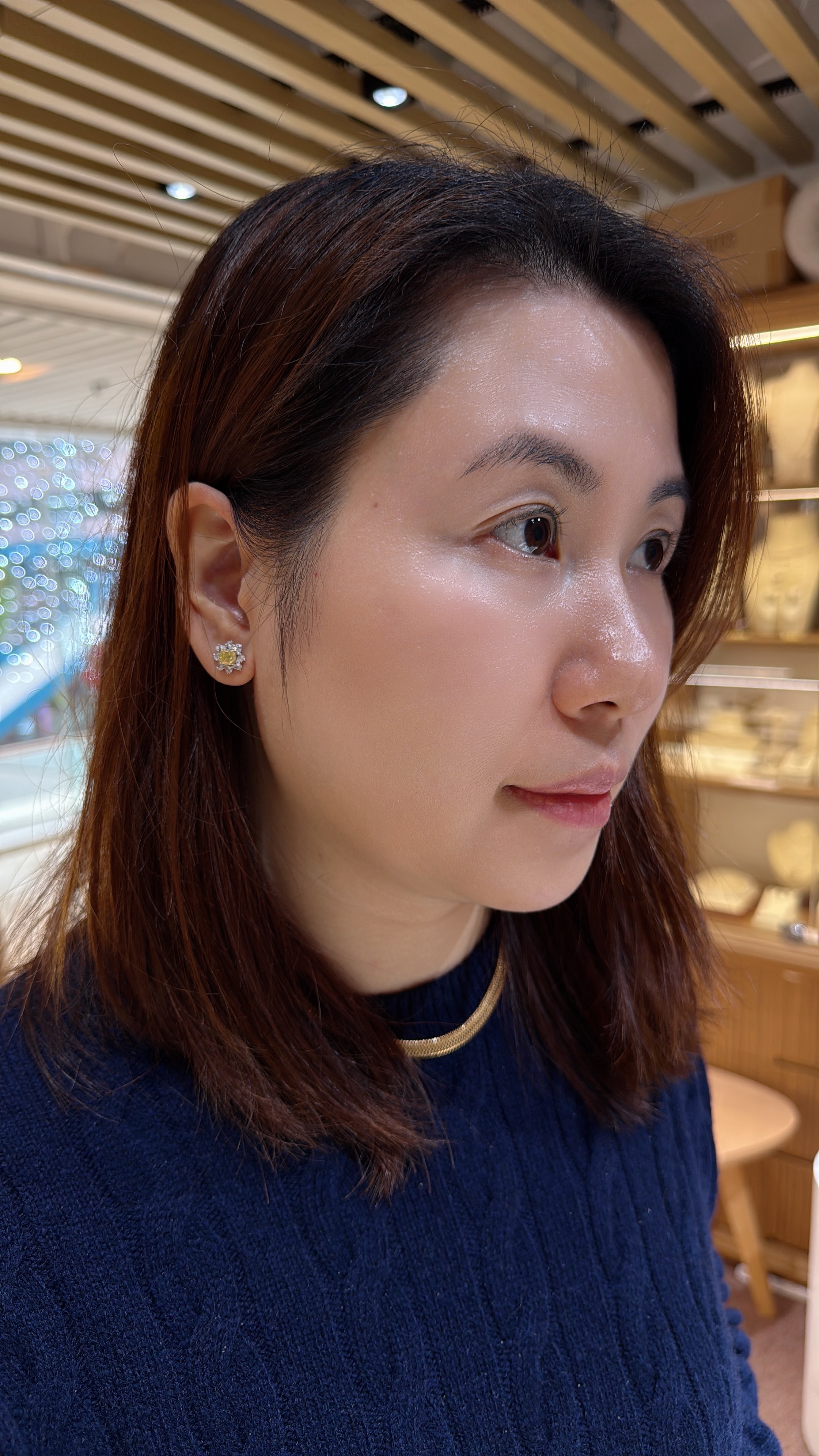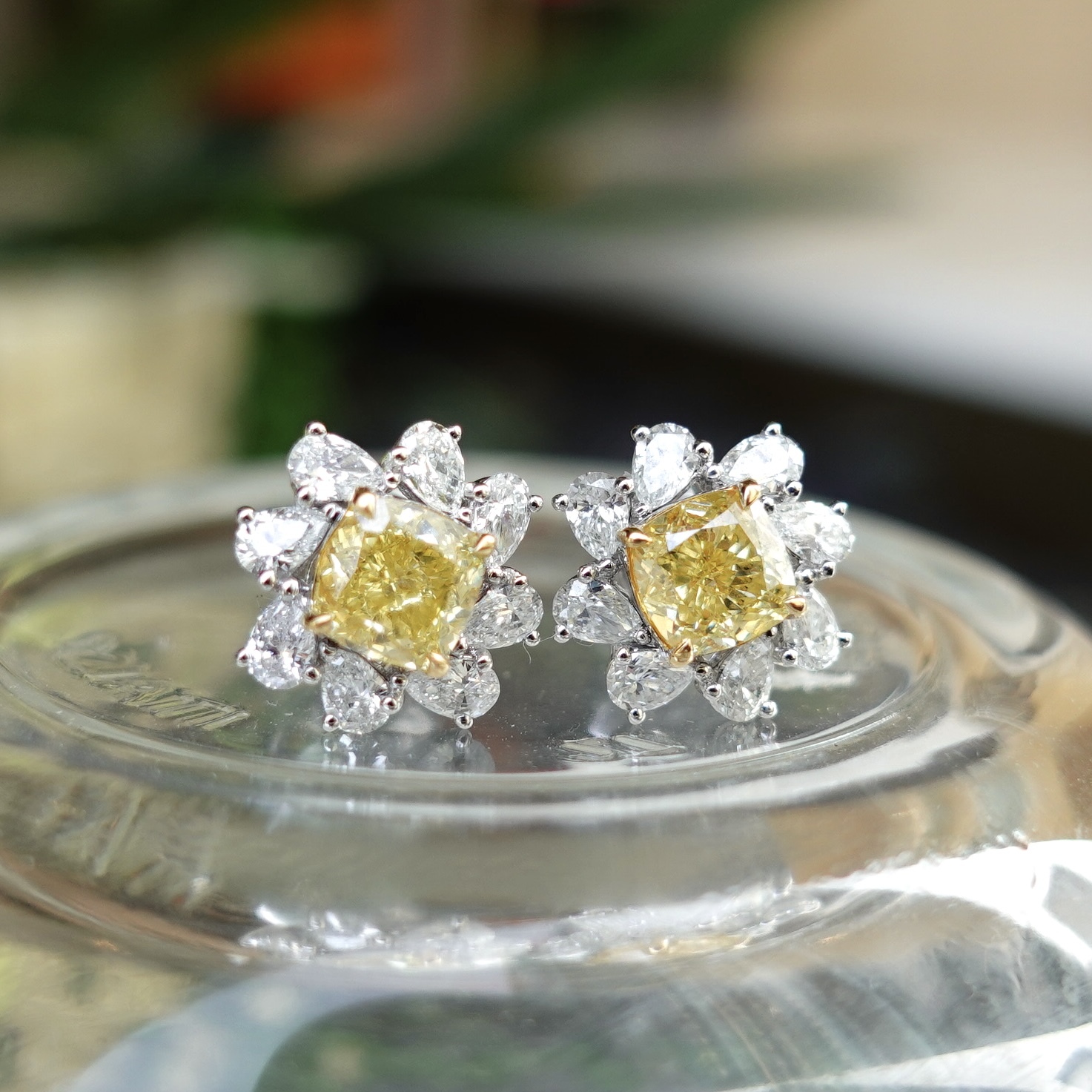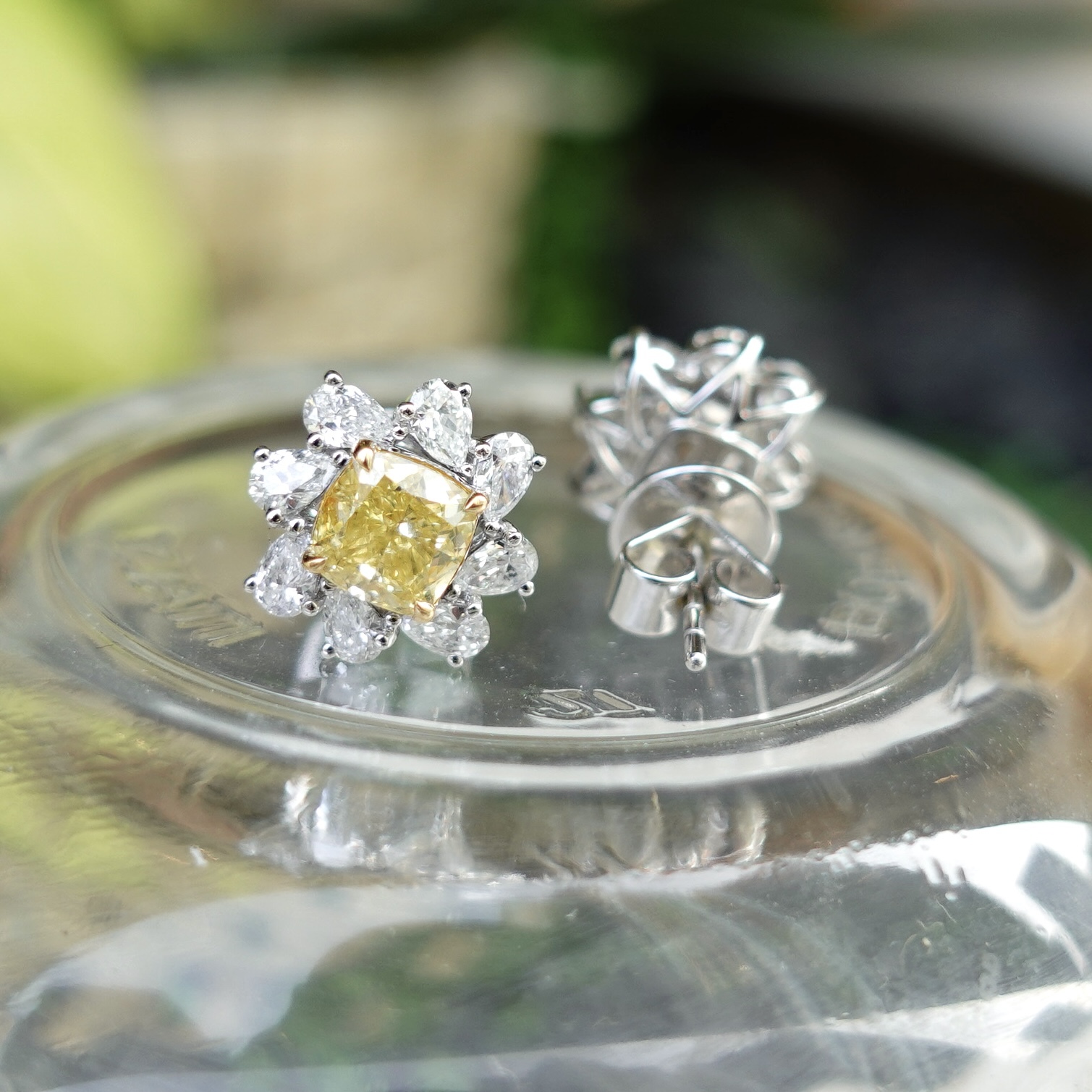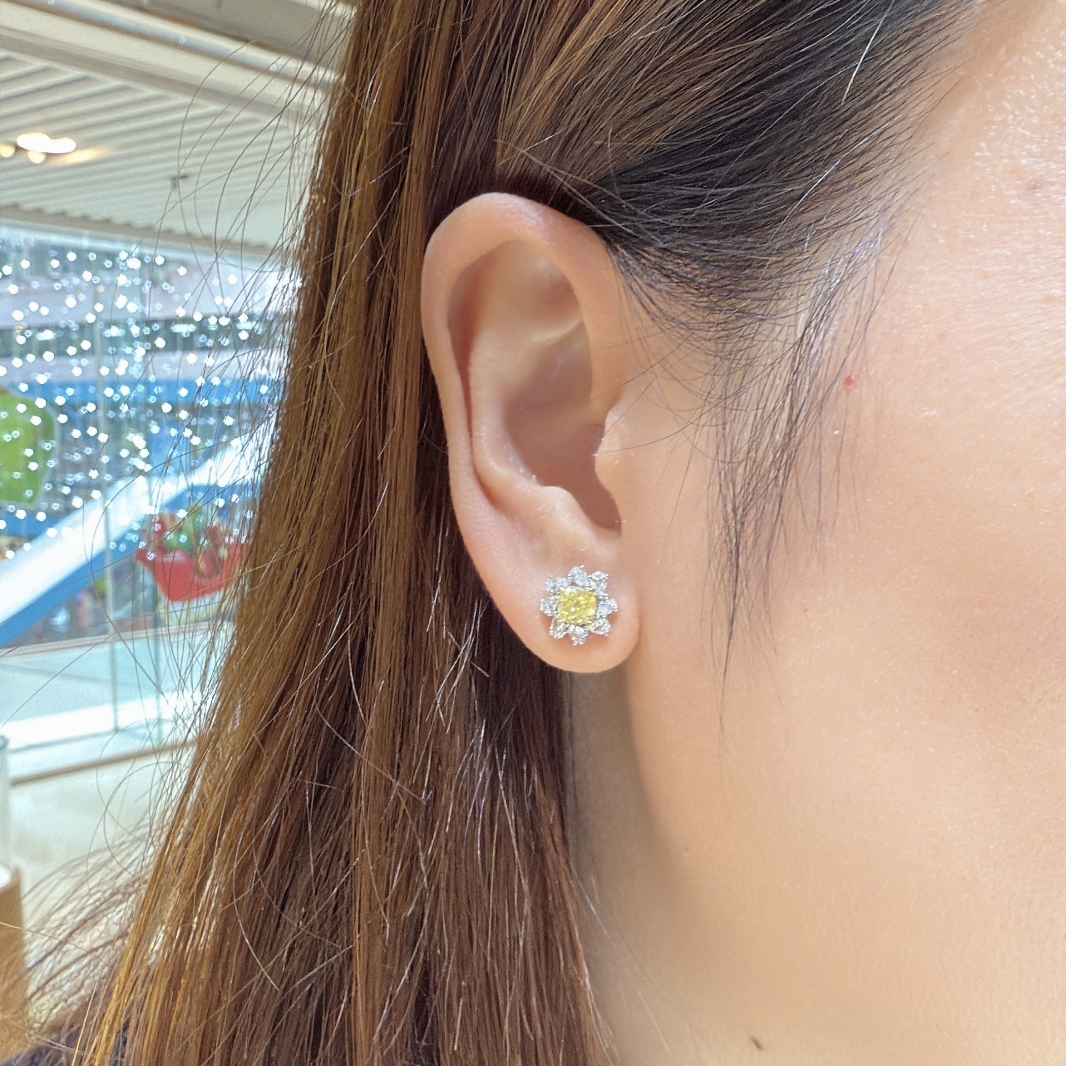 天然彩黃鑽耳環,主石各重80分,以雙枕形黃鑽為主石,圍鑲梨形白鑽,整體如盛開的向日葵。色彩對比鮮明,光影交織間,宛如將陽光戴於耳際,黃鑽色澤暖亮如燦陽,日常佩戴亦能點亮造型,展現優雅與活力。