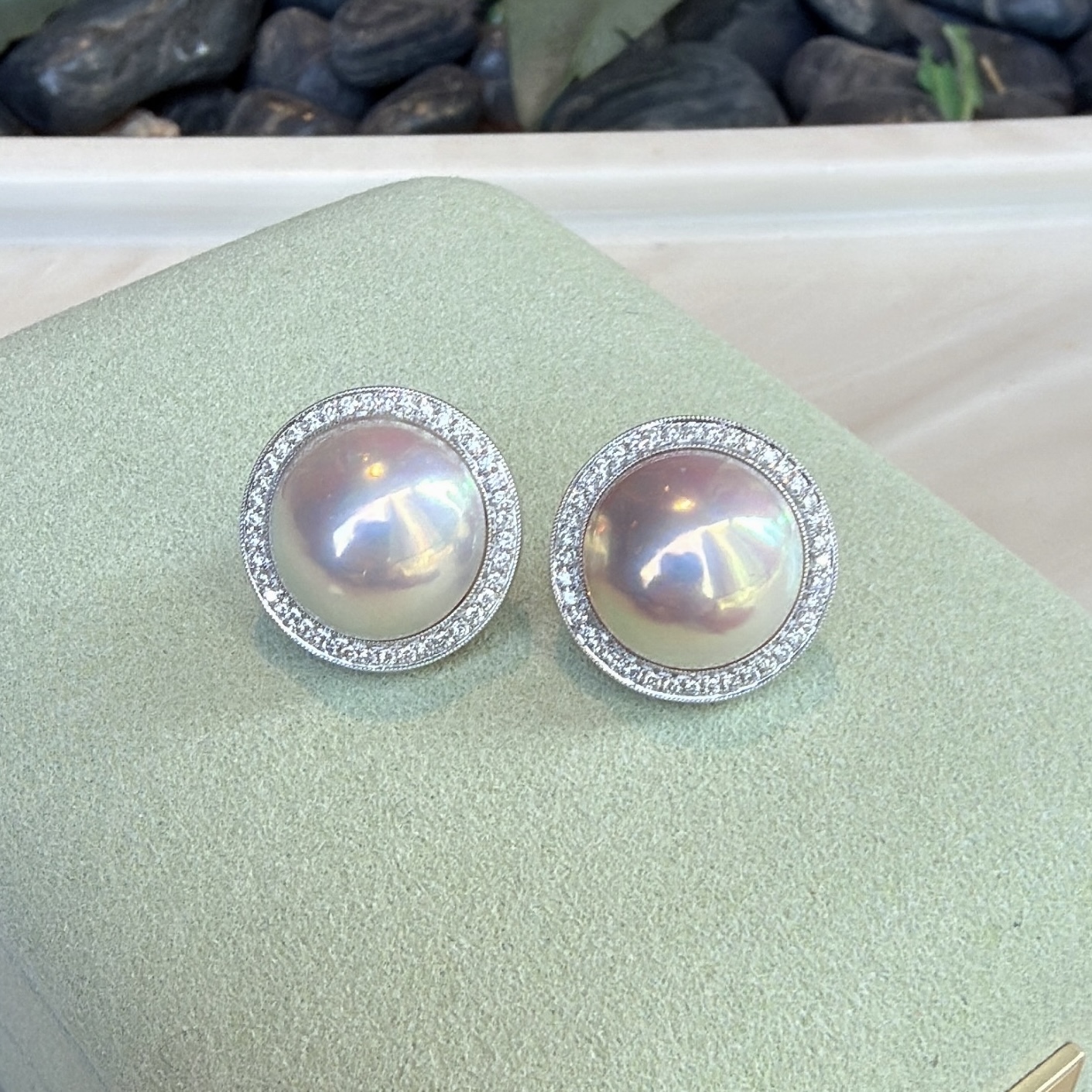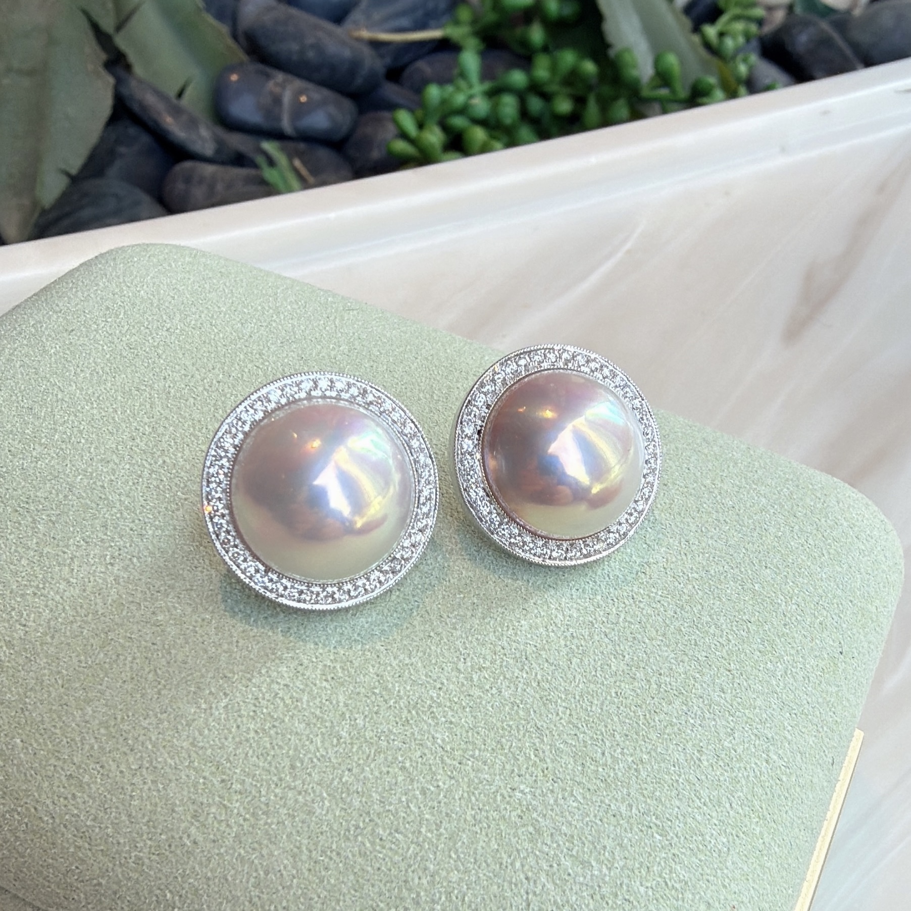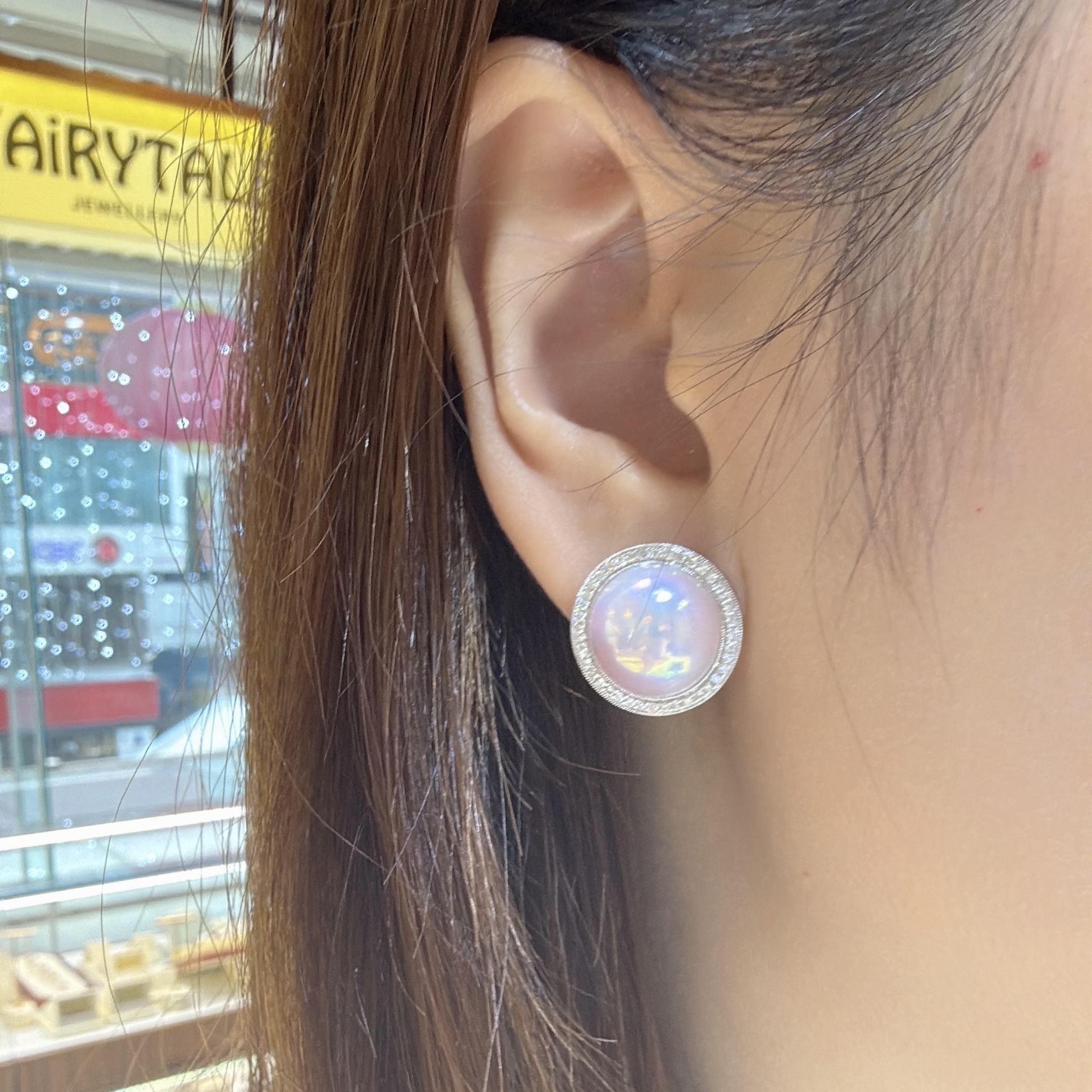 18K金日本稀有極光炫彩白色馬貝珠鑽石耳環