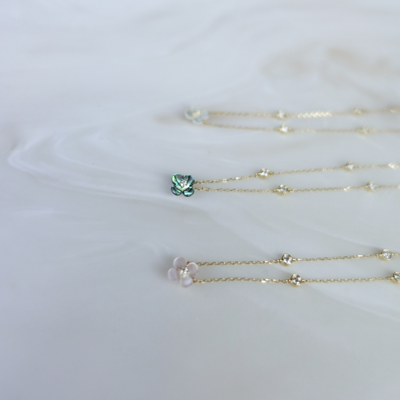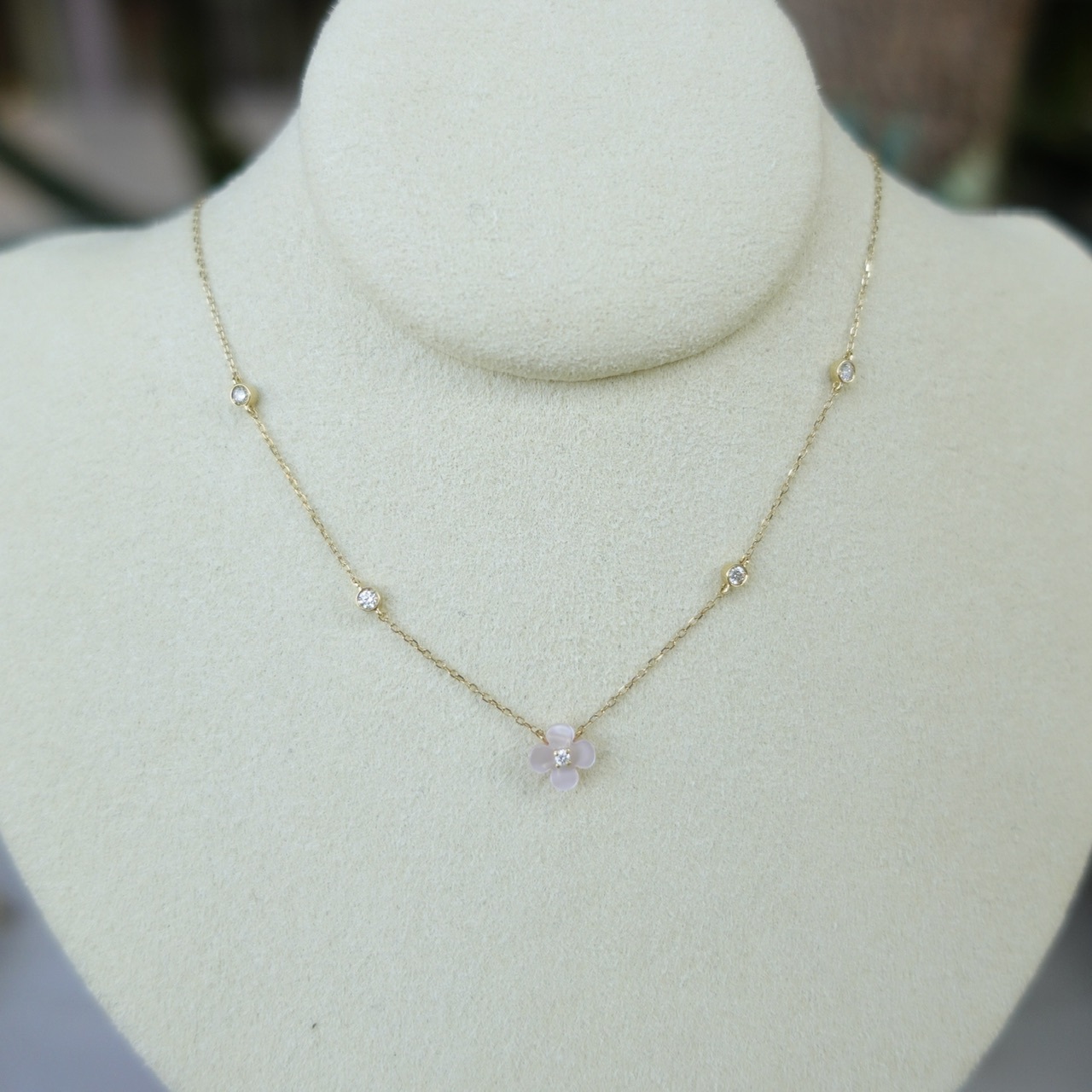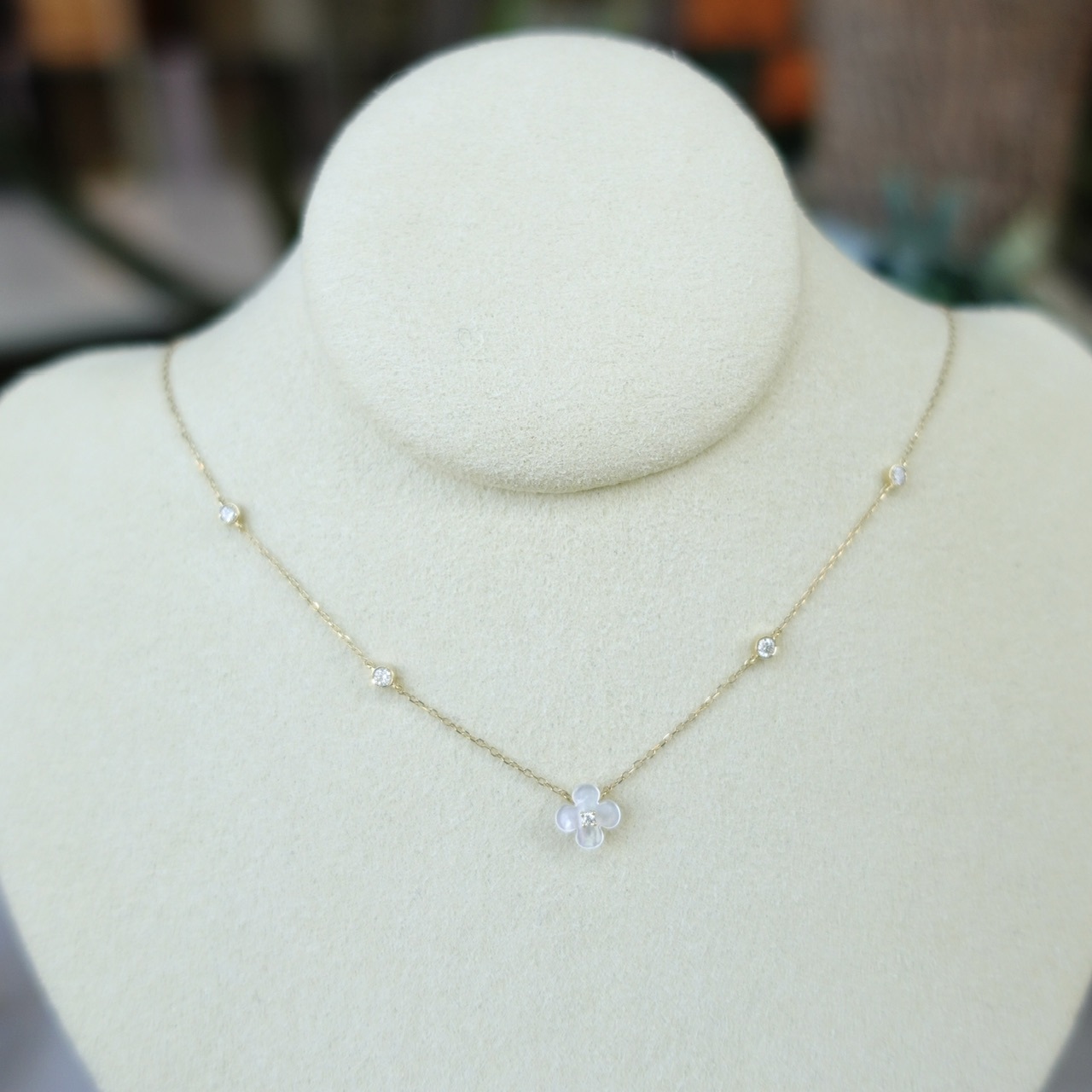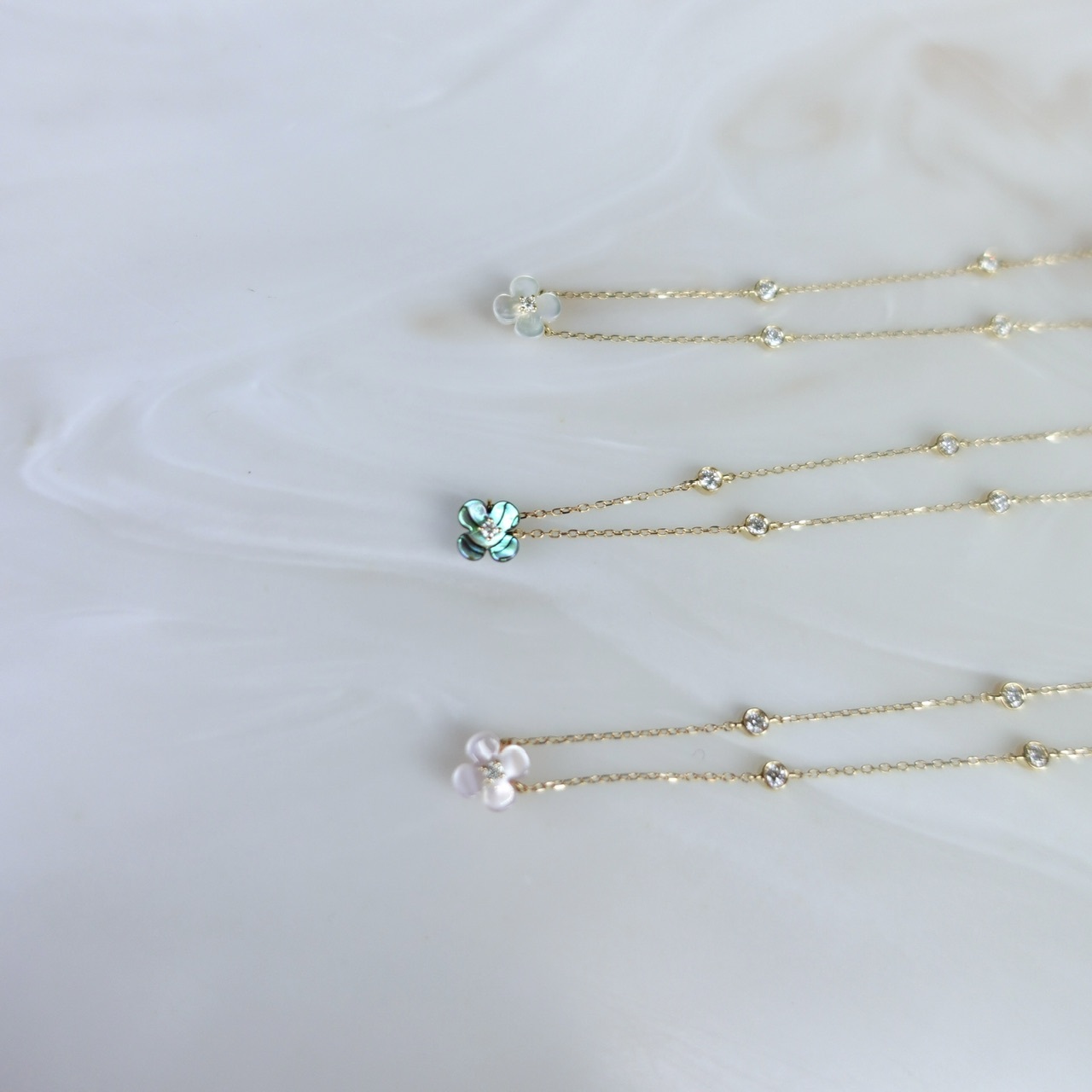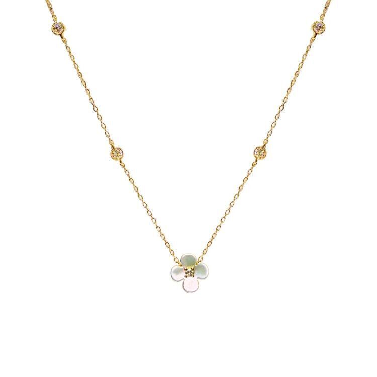 將珍珠母貝切割成四葉草形狀,點綴天然鑽石並以18K金鍊掛在胸前,珍珠母貝泛著柔和虹彩光澤,如陽光灑落水面般溫婉動人。