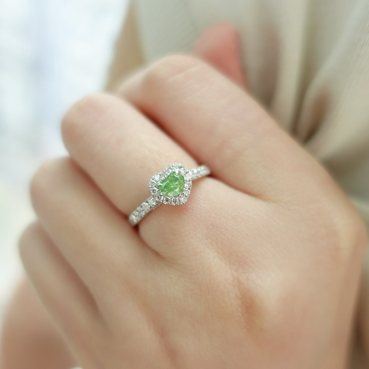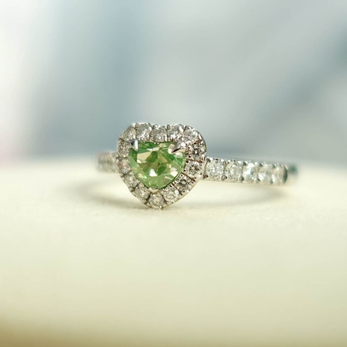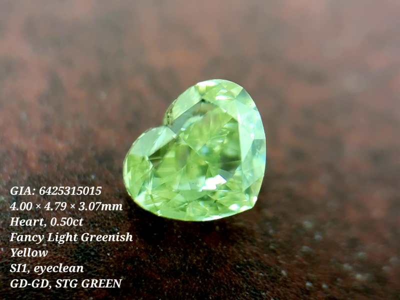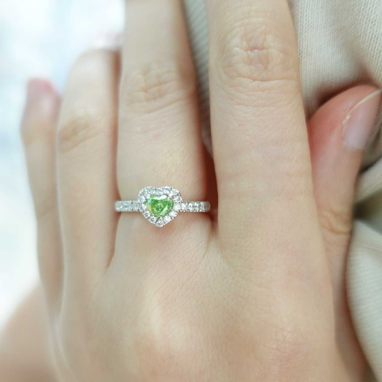 其中A款 0.5ct這顆帶有「強烈綠色螢光」的黃綠鑽,在一定的照明條件下,自身帶有的螢光綠會對彩鑽的修飾色(綠色)造成影響,從而提升彩鑽的濃艷程度!