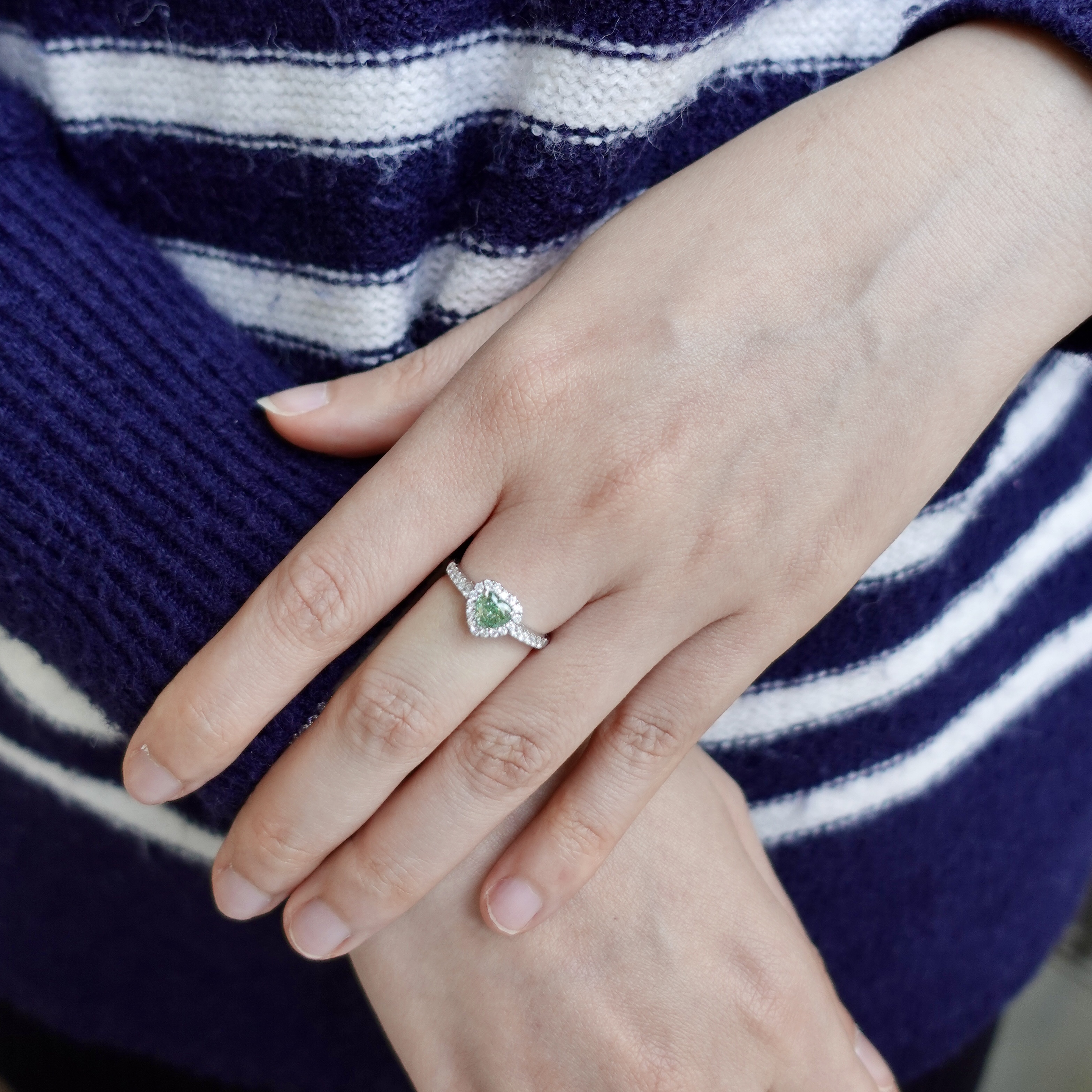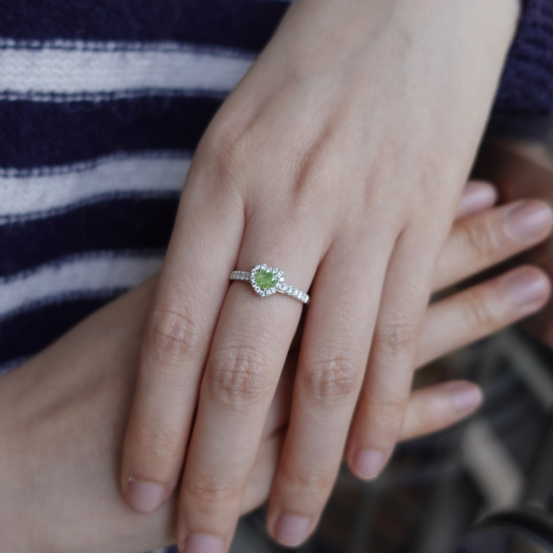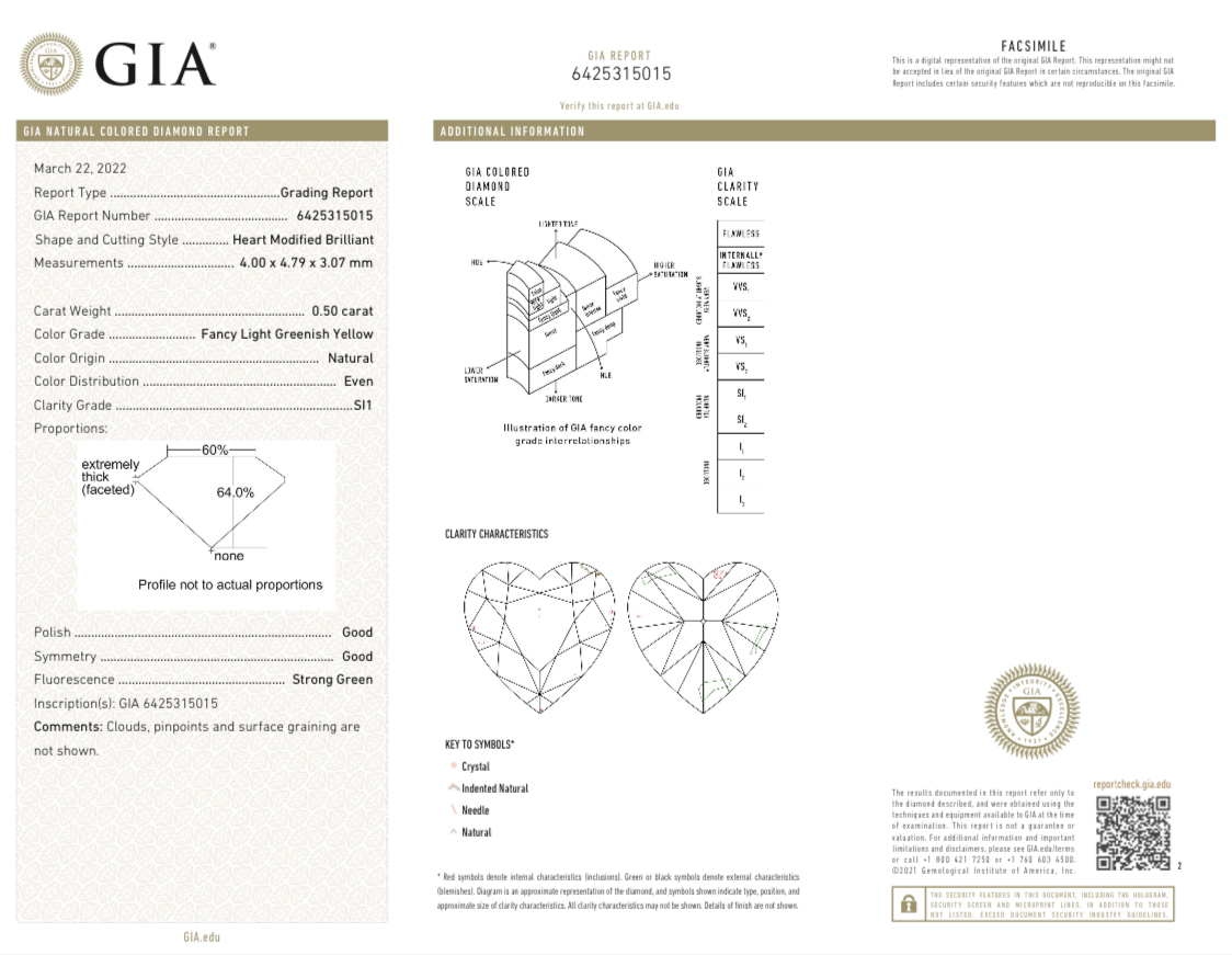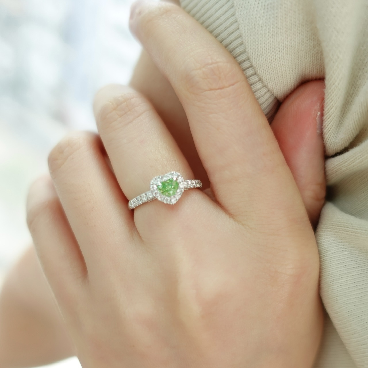 其中A款 0.5ct這顆帶有「強烈綠色螢光」的黃綠鑽,在一定的照明條件下,自身帶有的螢光綠會對彩鑽的修飾色(綠色)造成影響,從而提升彩鑽的濃艷程度!