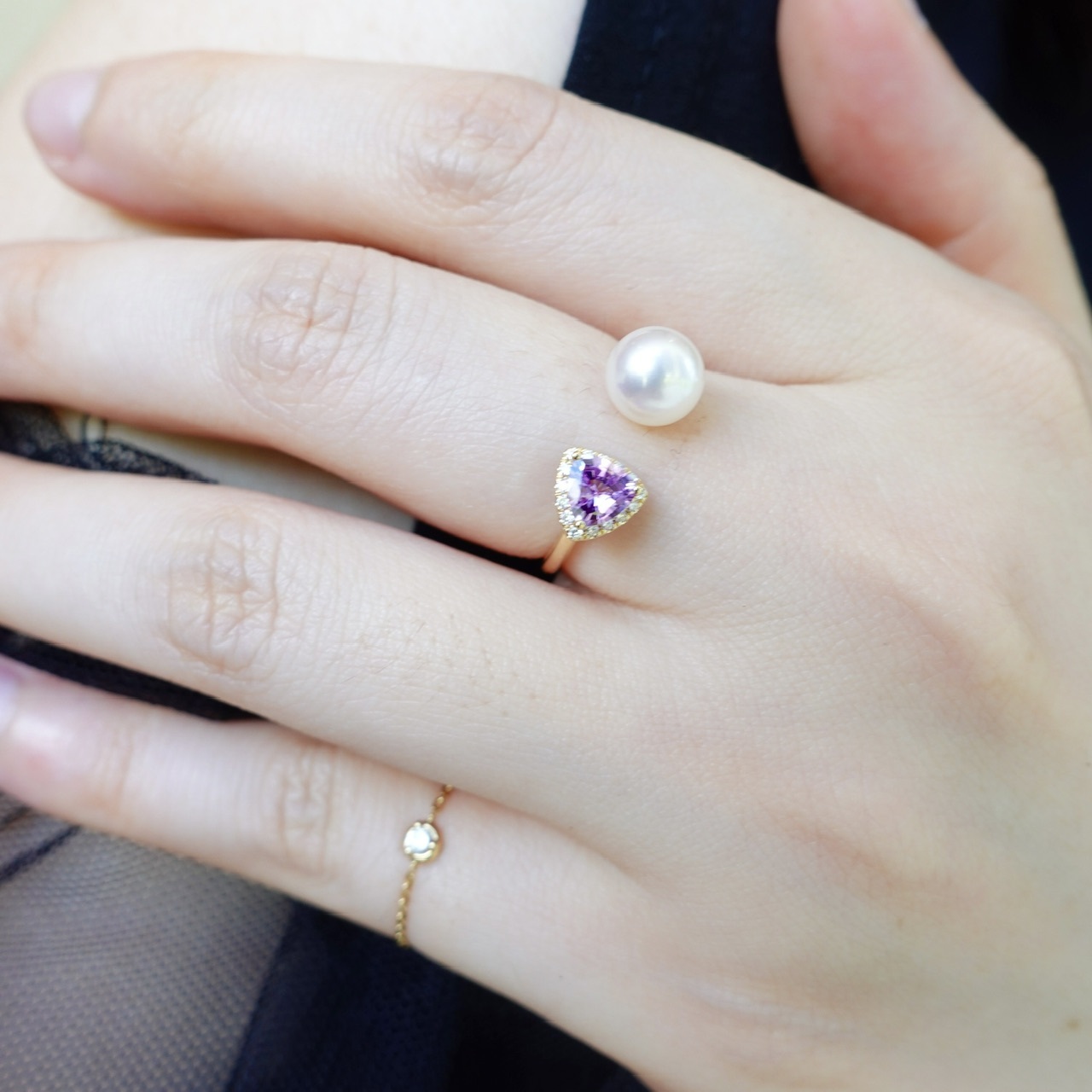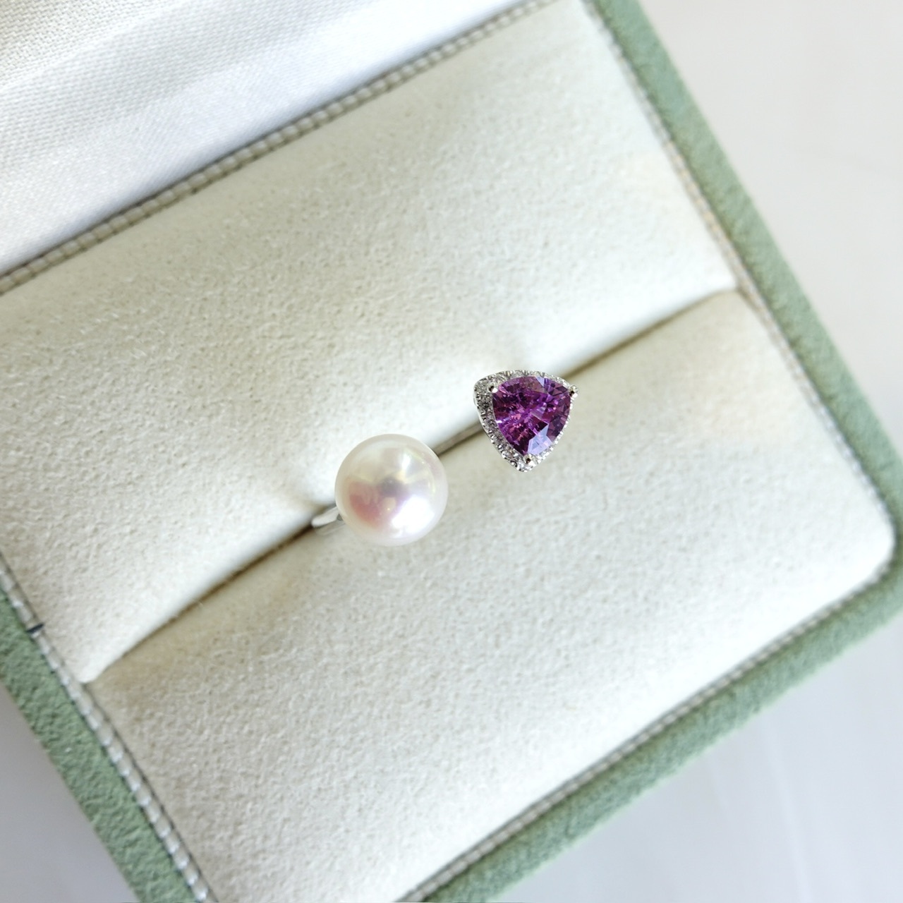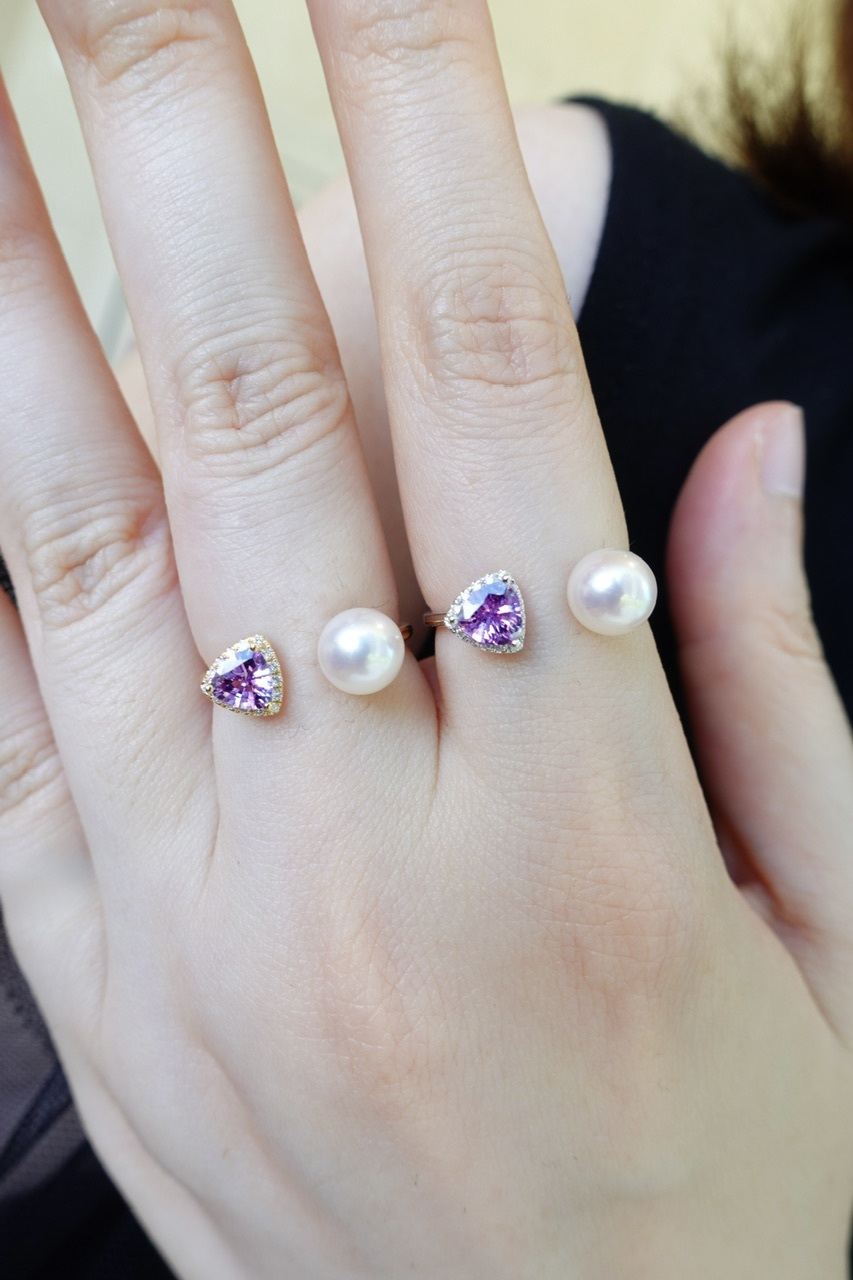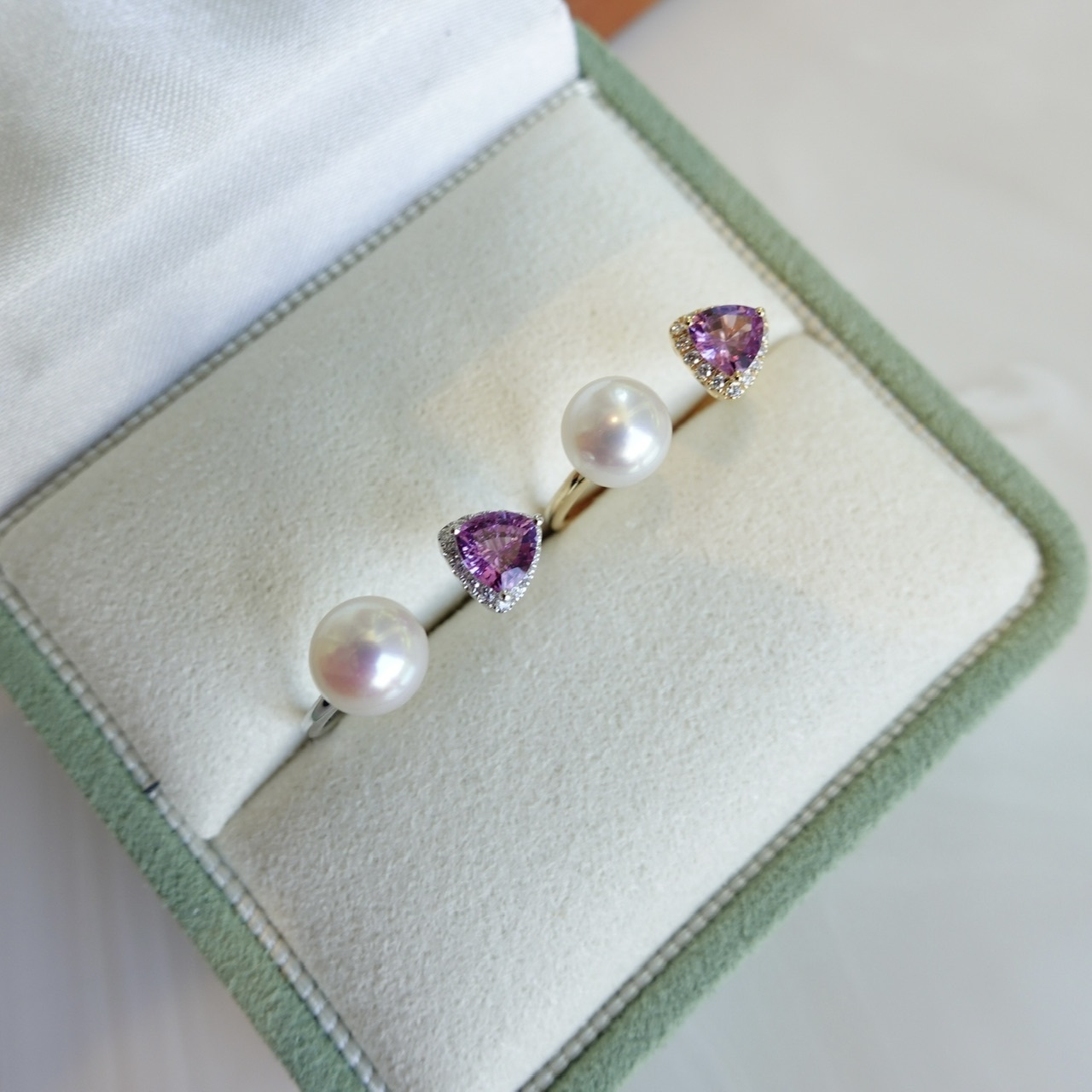 18K金鑲嵌天然紫藍寶石鑽石日本Akoya開口戒指
