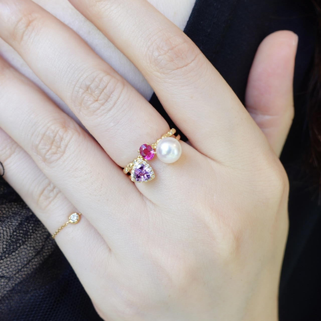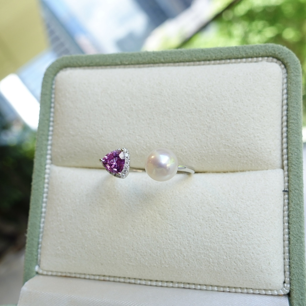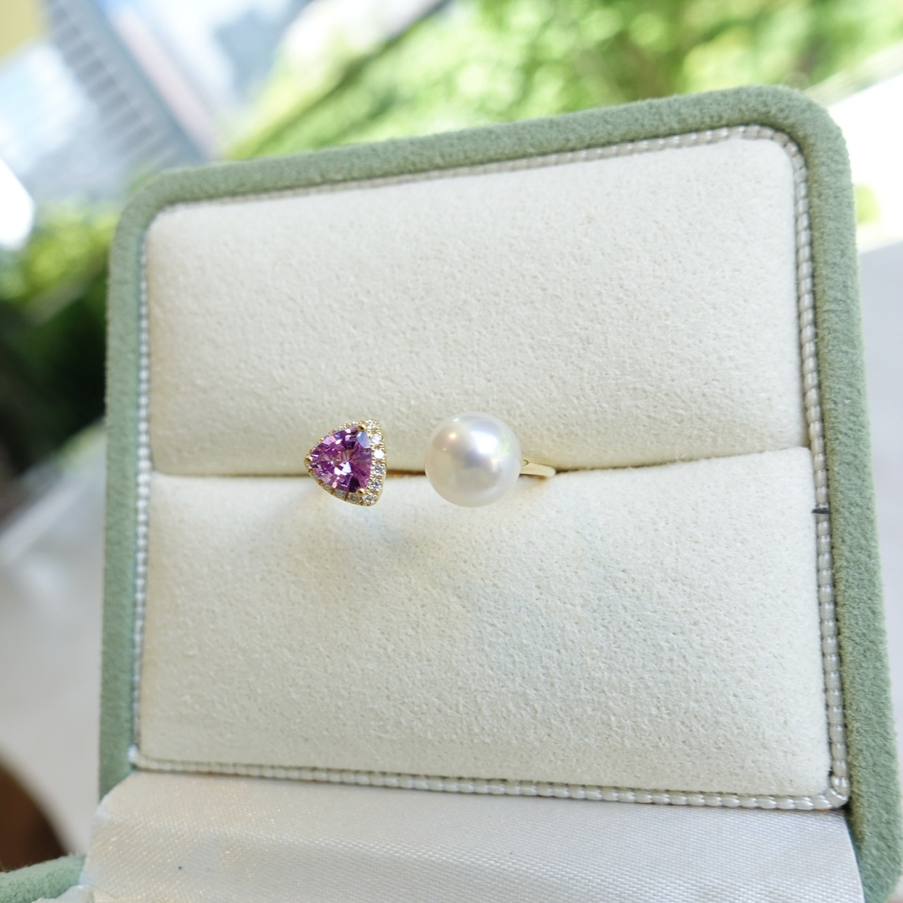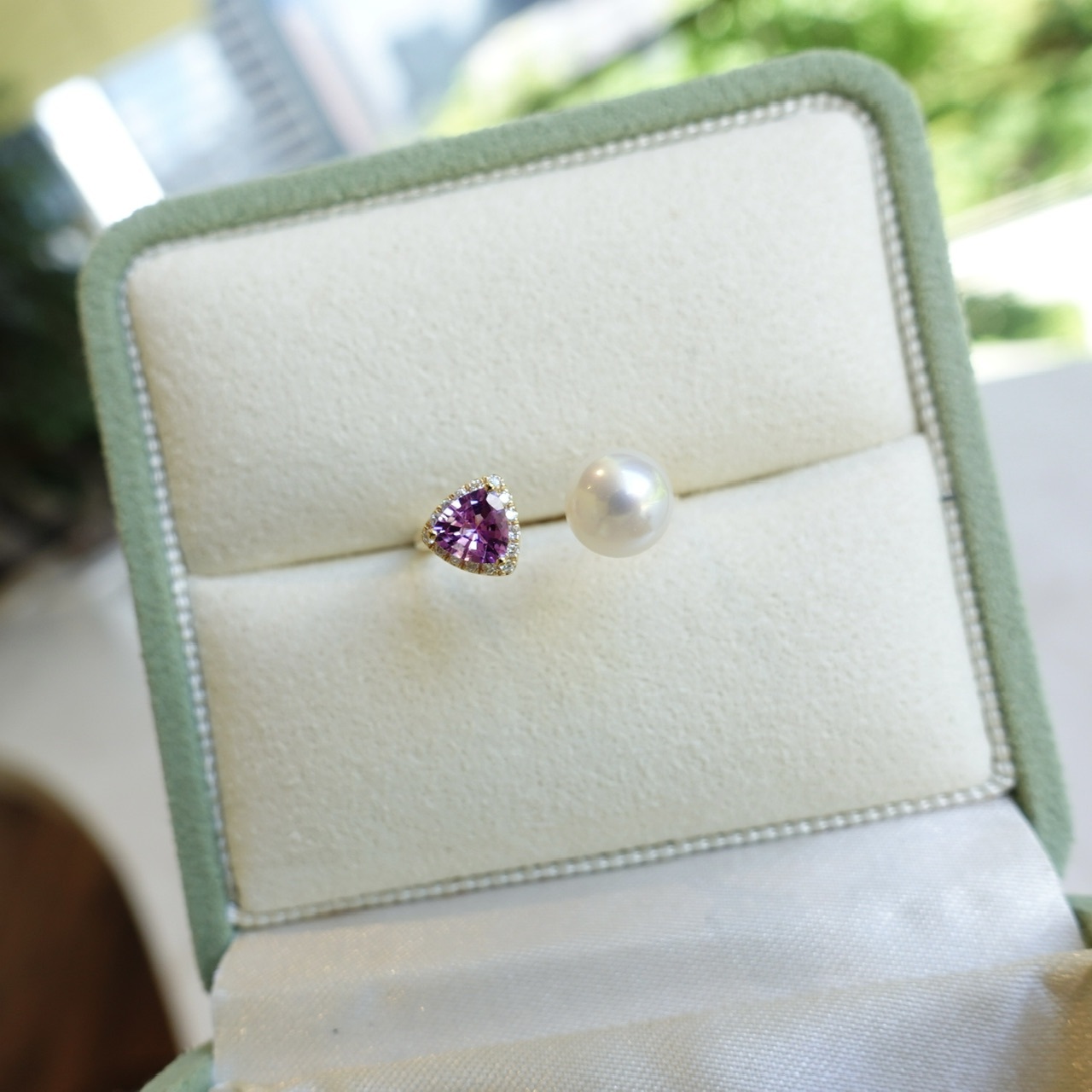 18K金鑲嵌天然紫藍寶石鑽石日本Akoya開口戒指