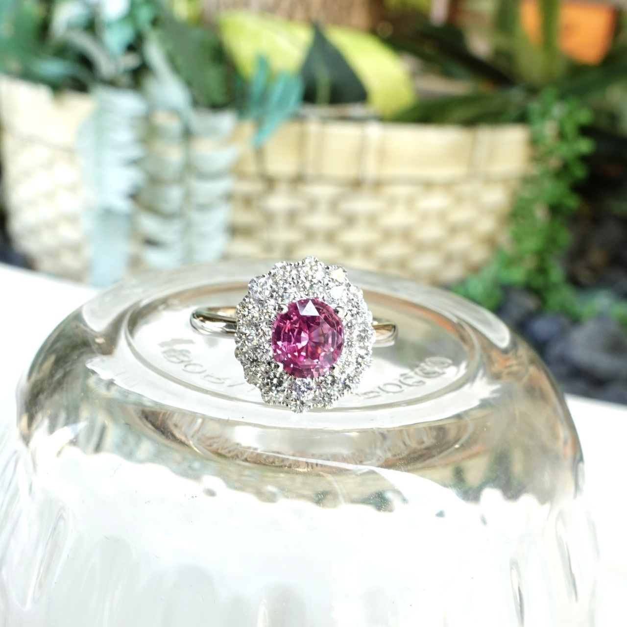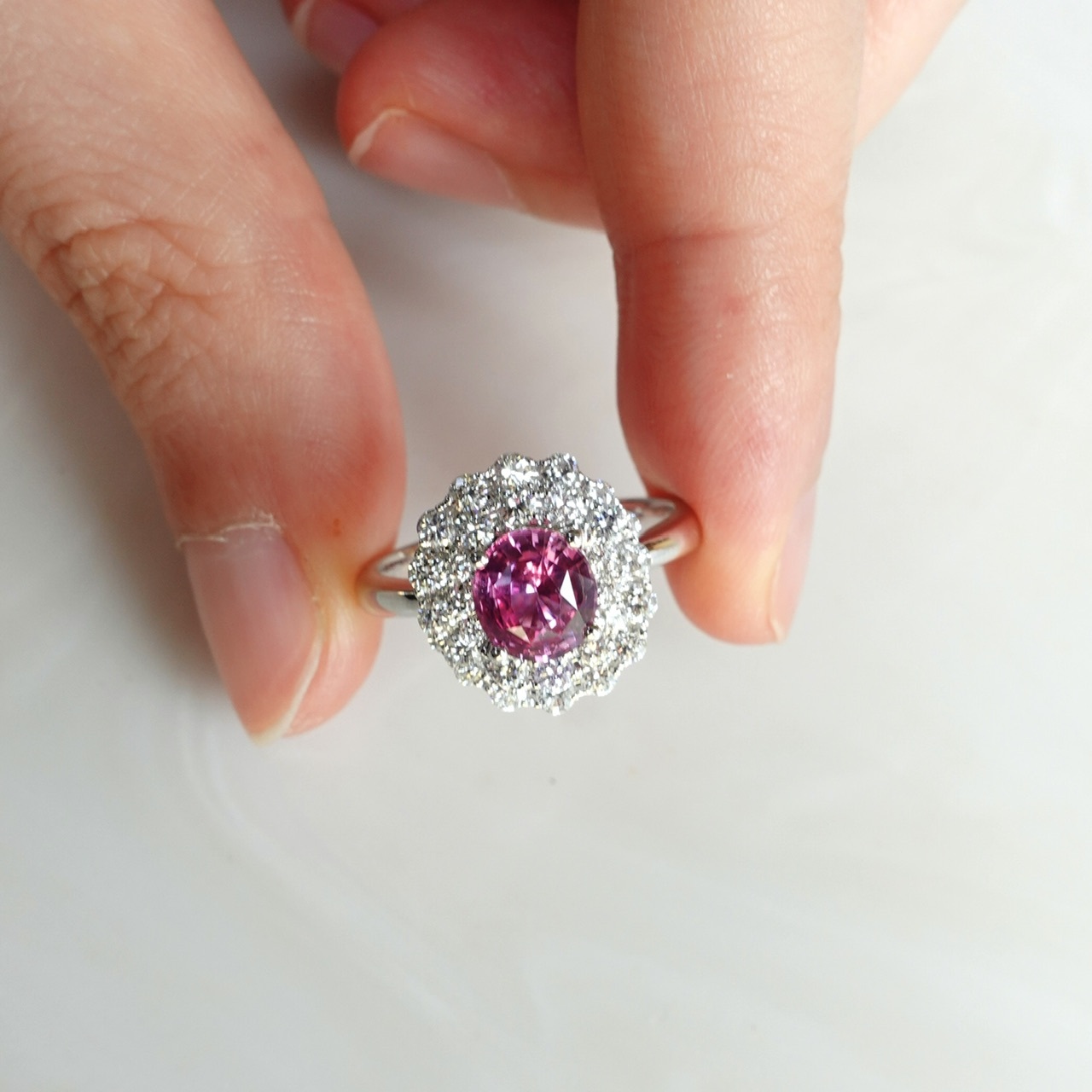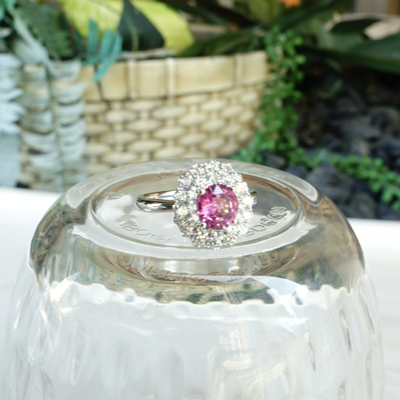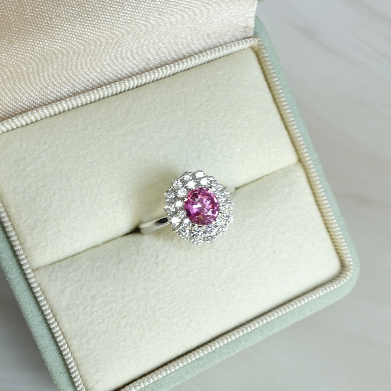 日出色如黎明初綻時天邊那一抹溫柔而熾烈的霞光,粉與橙在她之中交融,彷彿將日出時分最動人的光暈,永恆封存於寶石之中。鑽石由小至大螺旋圍繞主石,鑽石與鑽石之間採用共抓鑲,因為沒有做底托,鑽石底部通透無遮擋,光線可多角度射入,滿屏火彩!