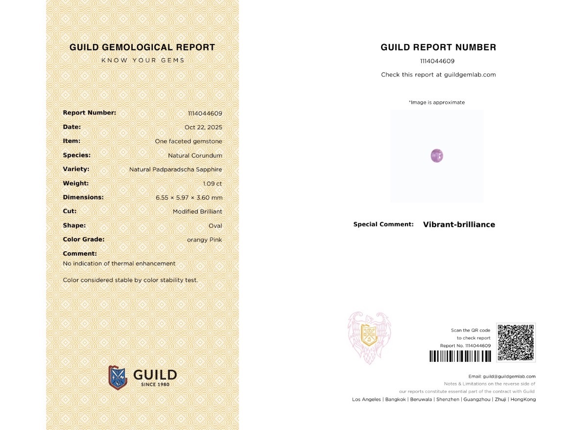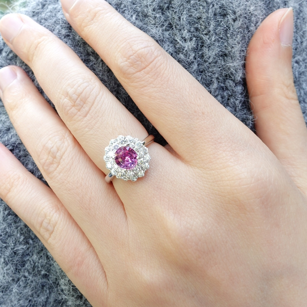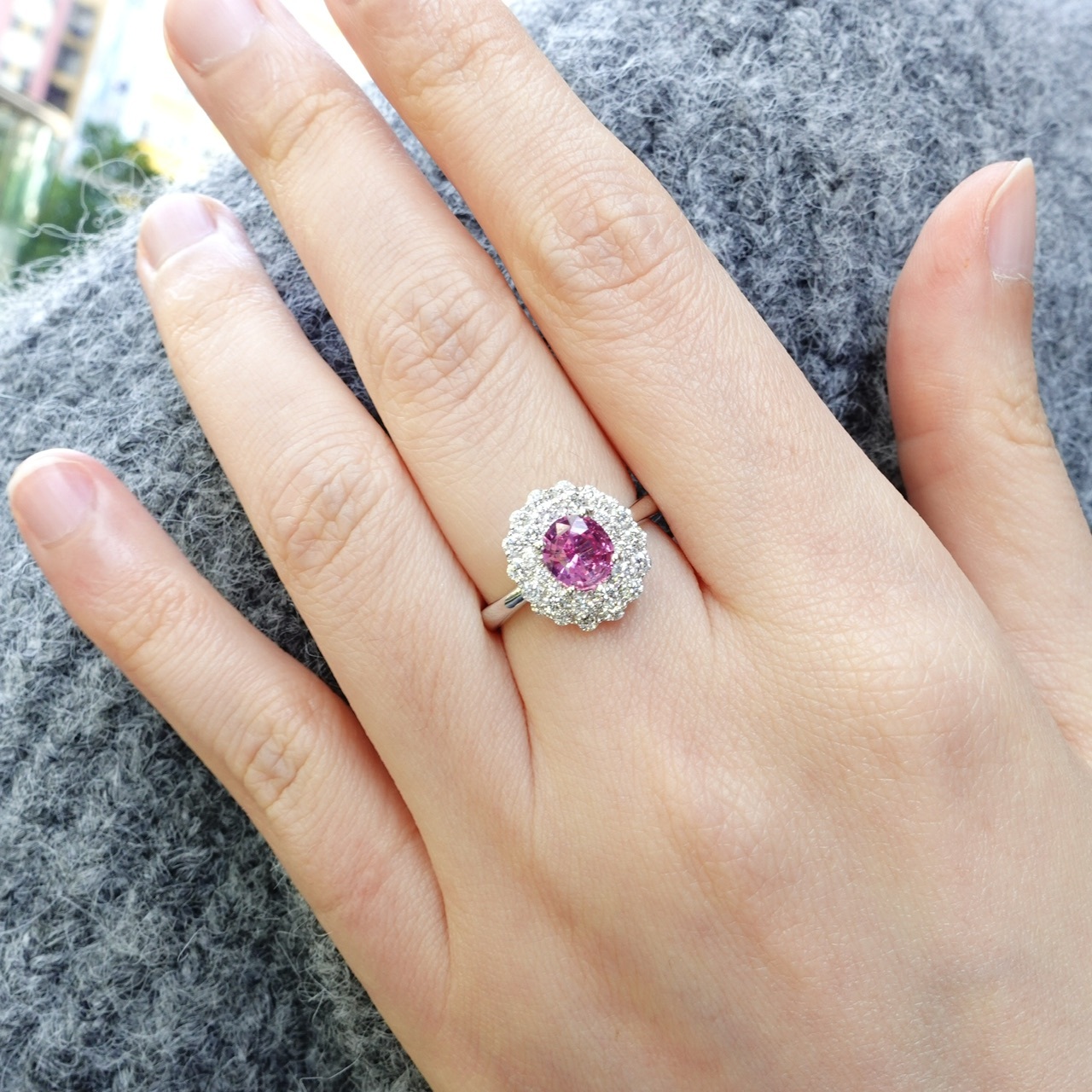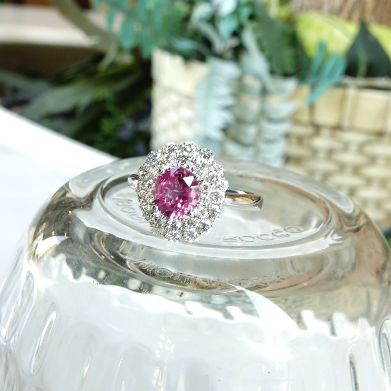 日出色如黎明初綻時天邊那一抹溫柔而熾烈的霞光,粉與橙在她之中交融,彷彿將日出時分最動人的光暈,永恆封存於寶石之中。鑽石由小至大螺旋圍繞主石,鑽石與鑽石之間採用共抓鑲,因為沒有做底托,鑽石底部通透無遮擋,光線可多角度射入,滿屏火彩!