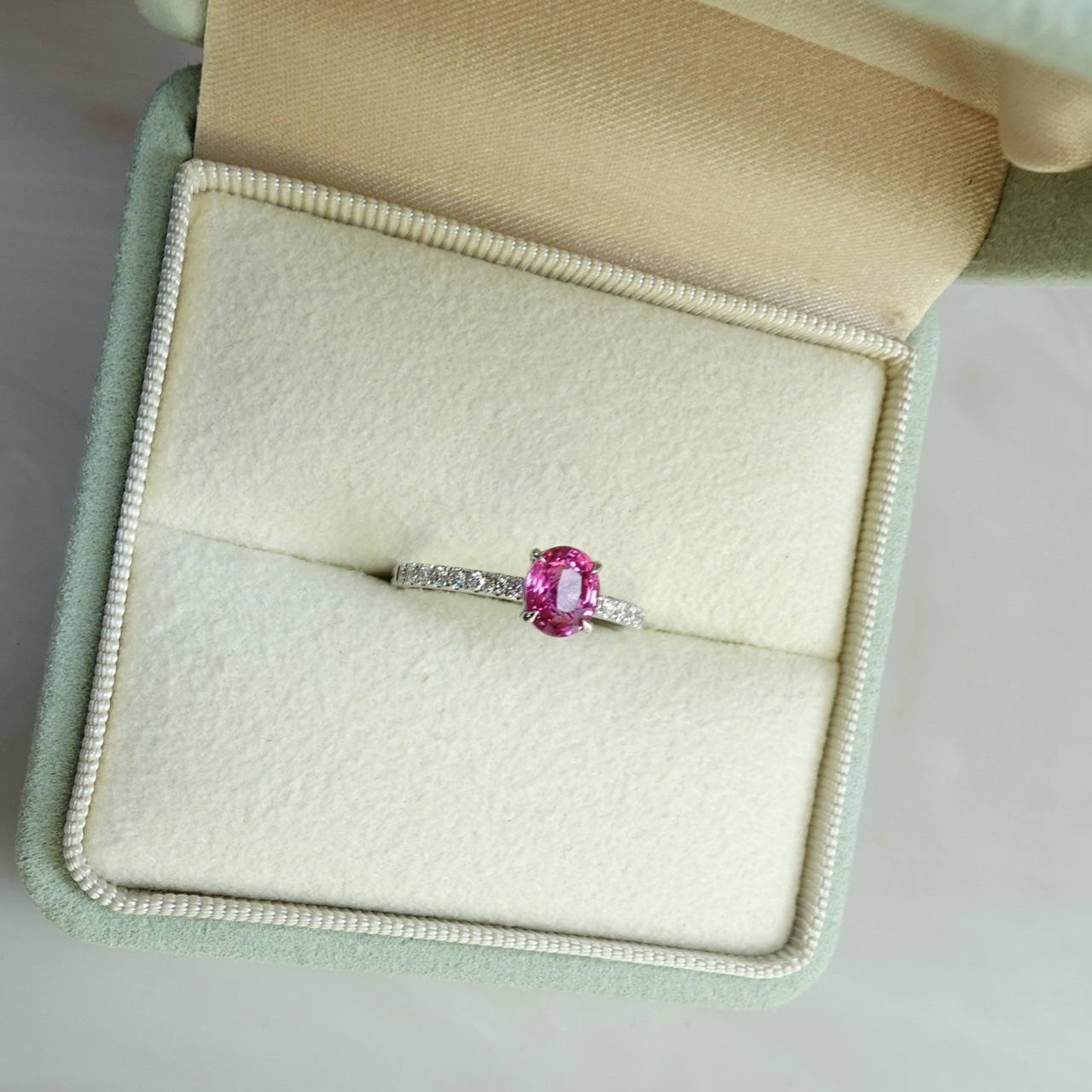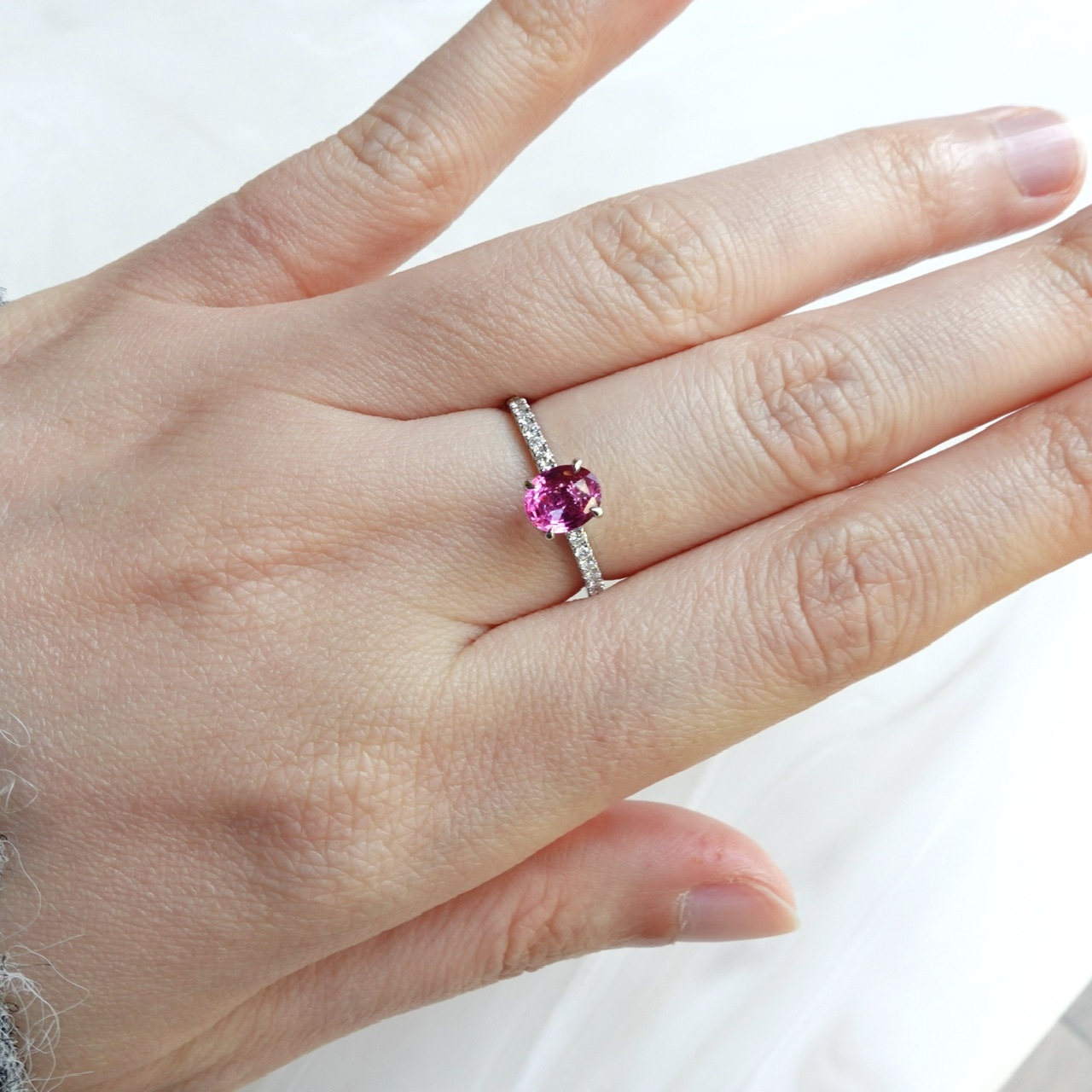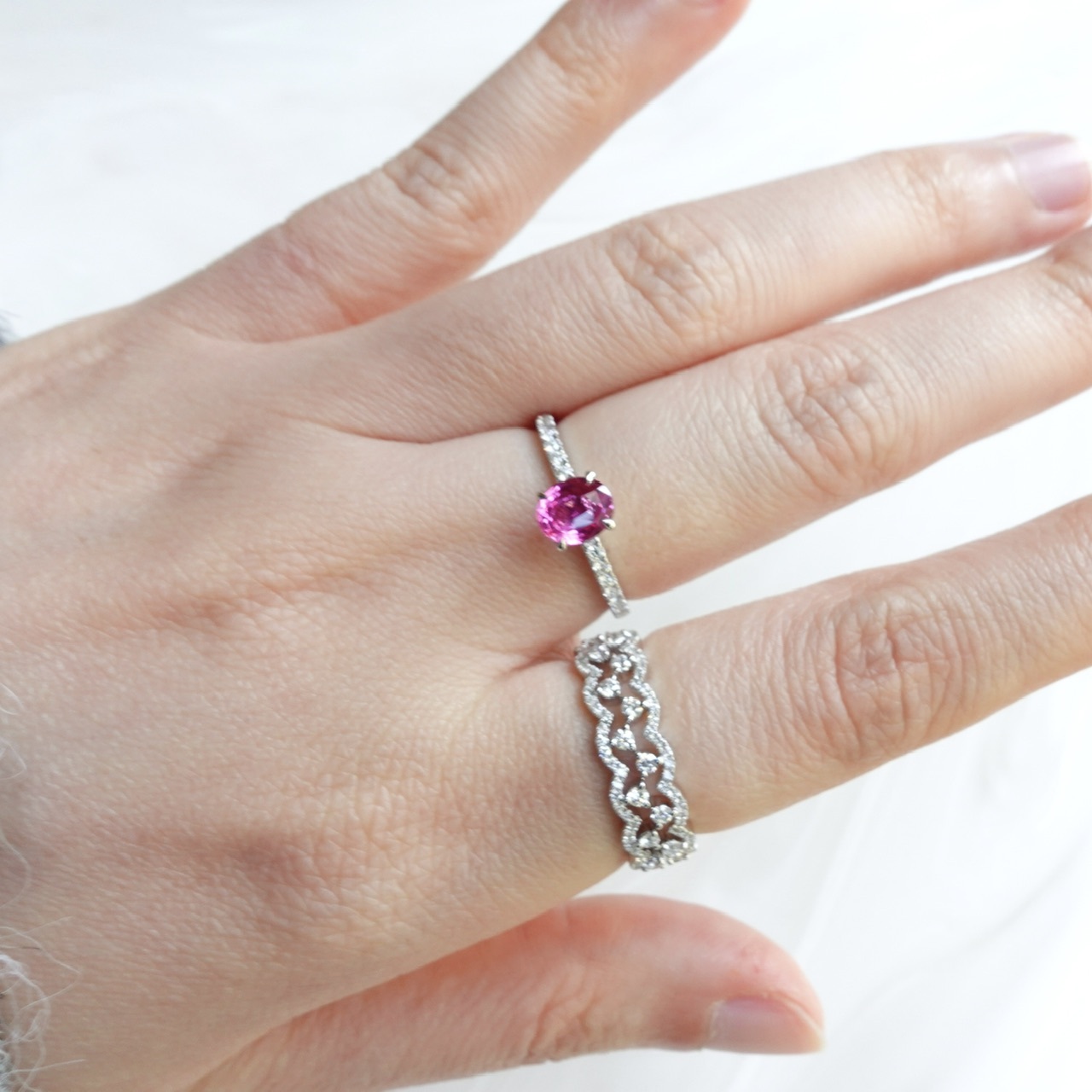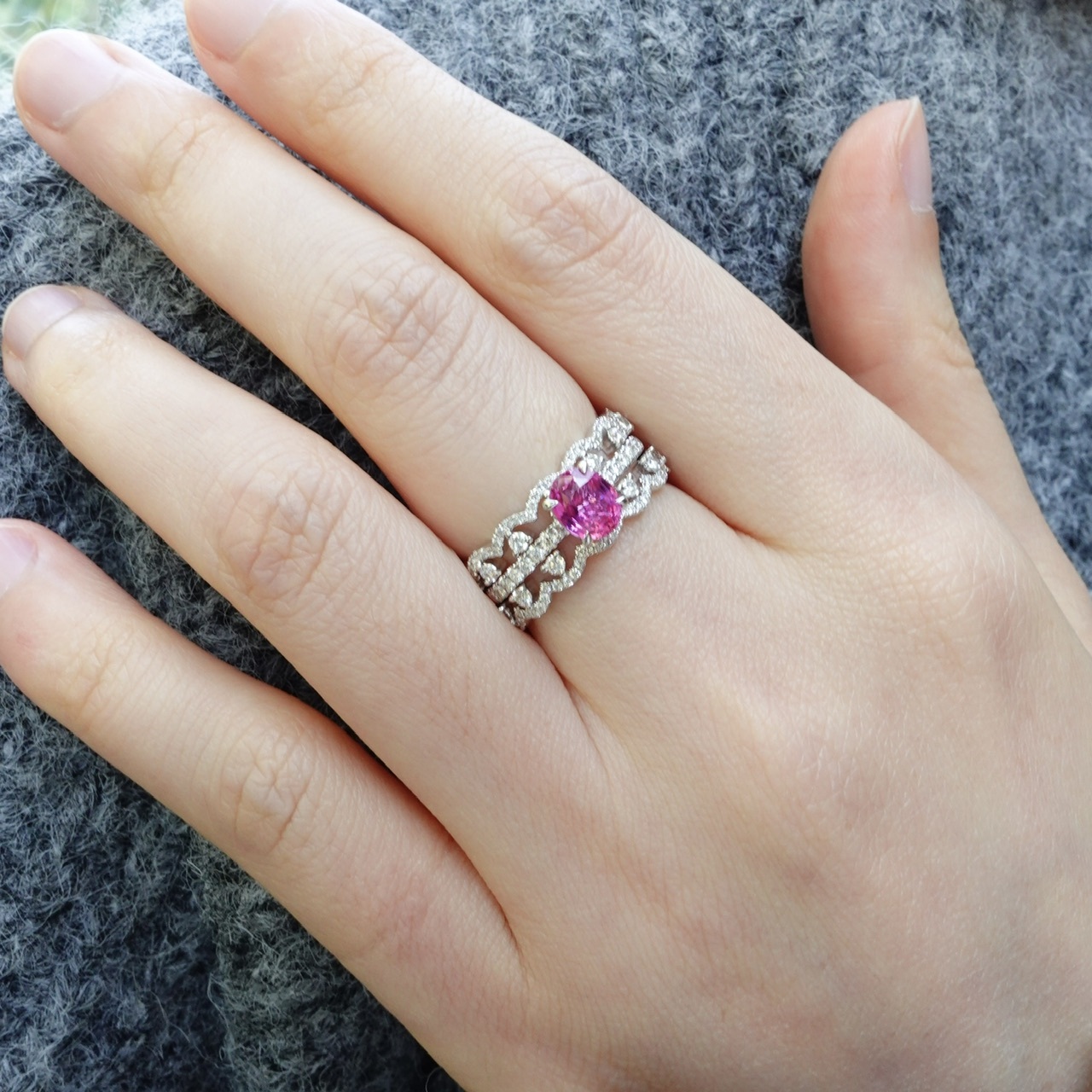 日出色Padparadscha滿溢甜美光暈,橢圓切割迸發極致火彩✨一套三戒,獨家設計「收腰底托」,讓主石戒與蕾絲鑽石排戒完美嵌合。單戴時優雅自若,疊戴則璀璨奪目——隨手搭配,日常佩戴即刻升級為設計師收藏!