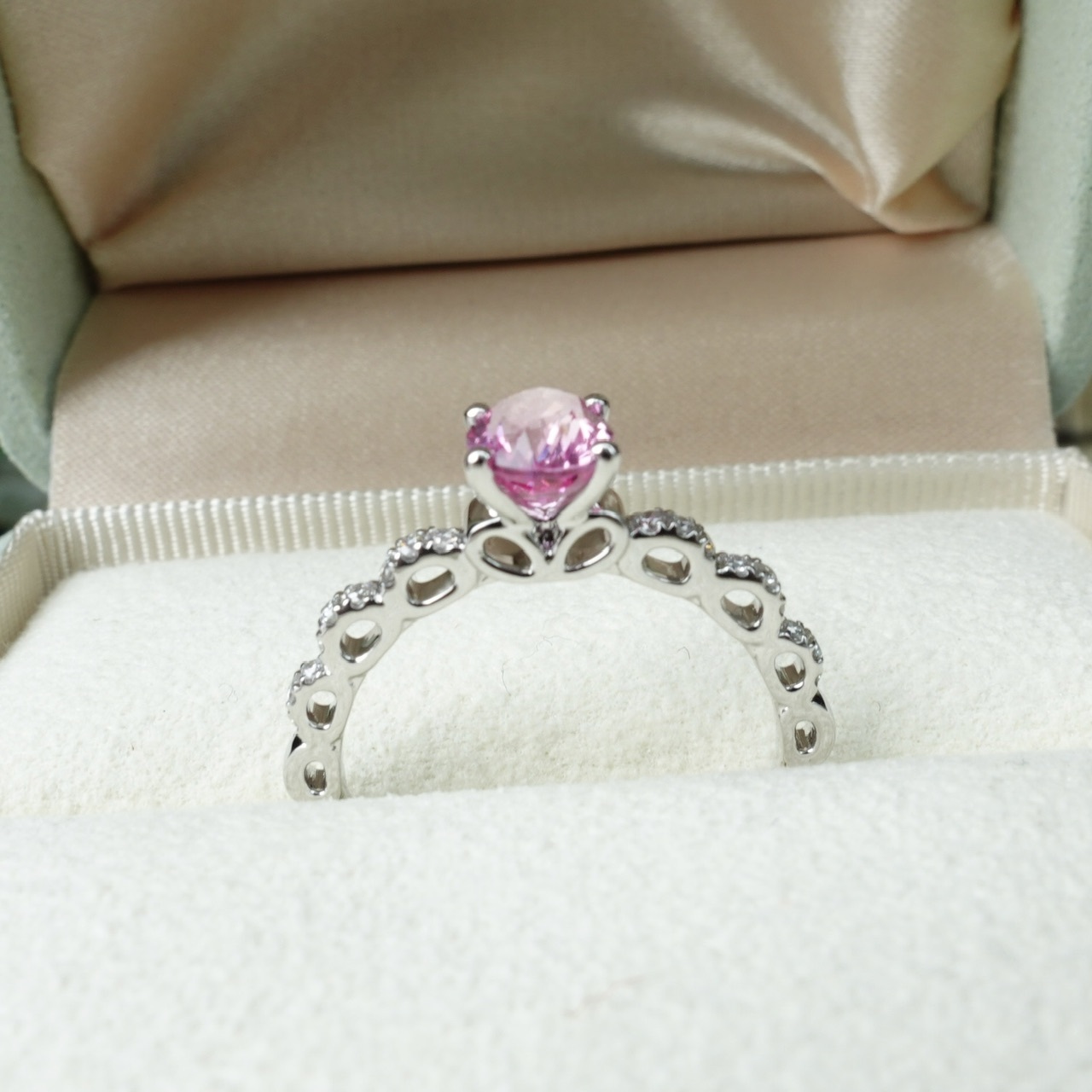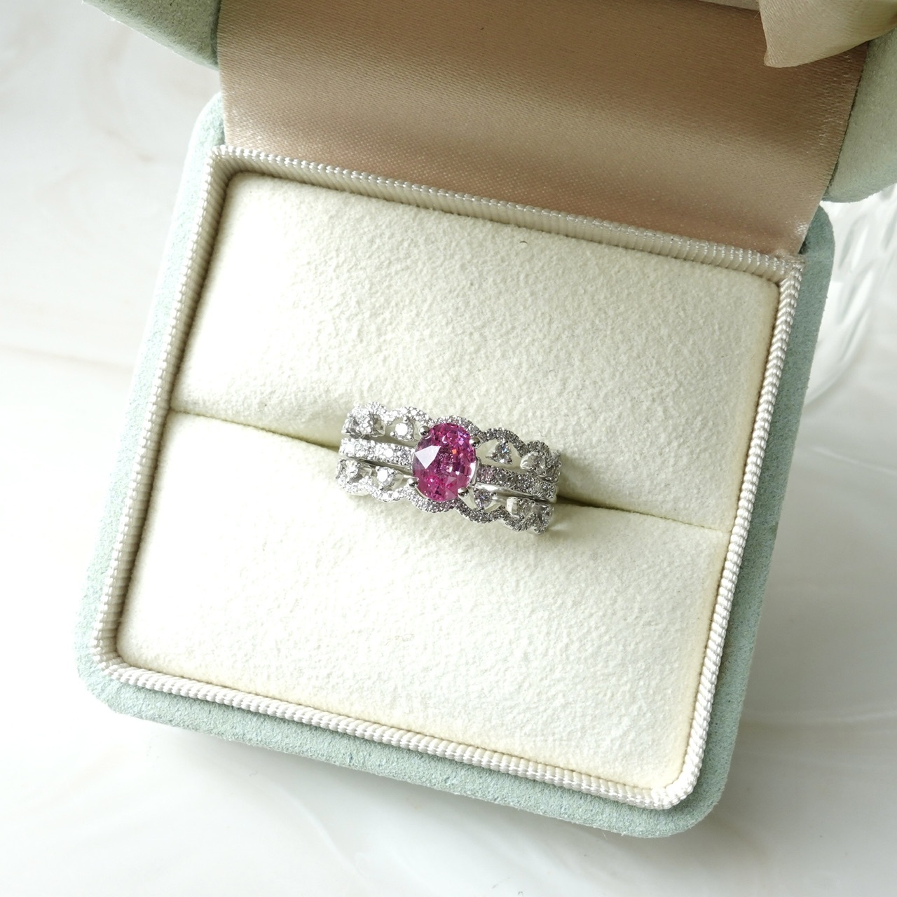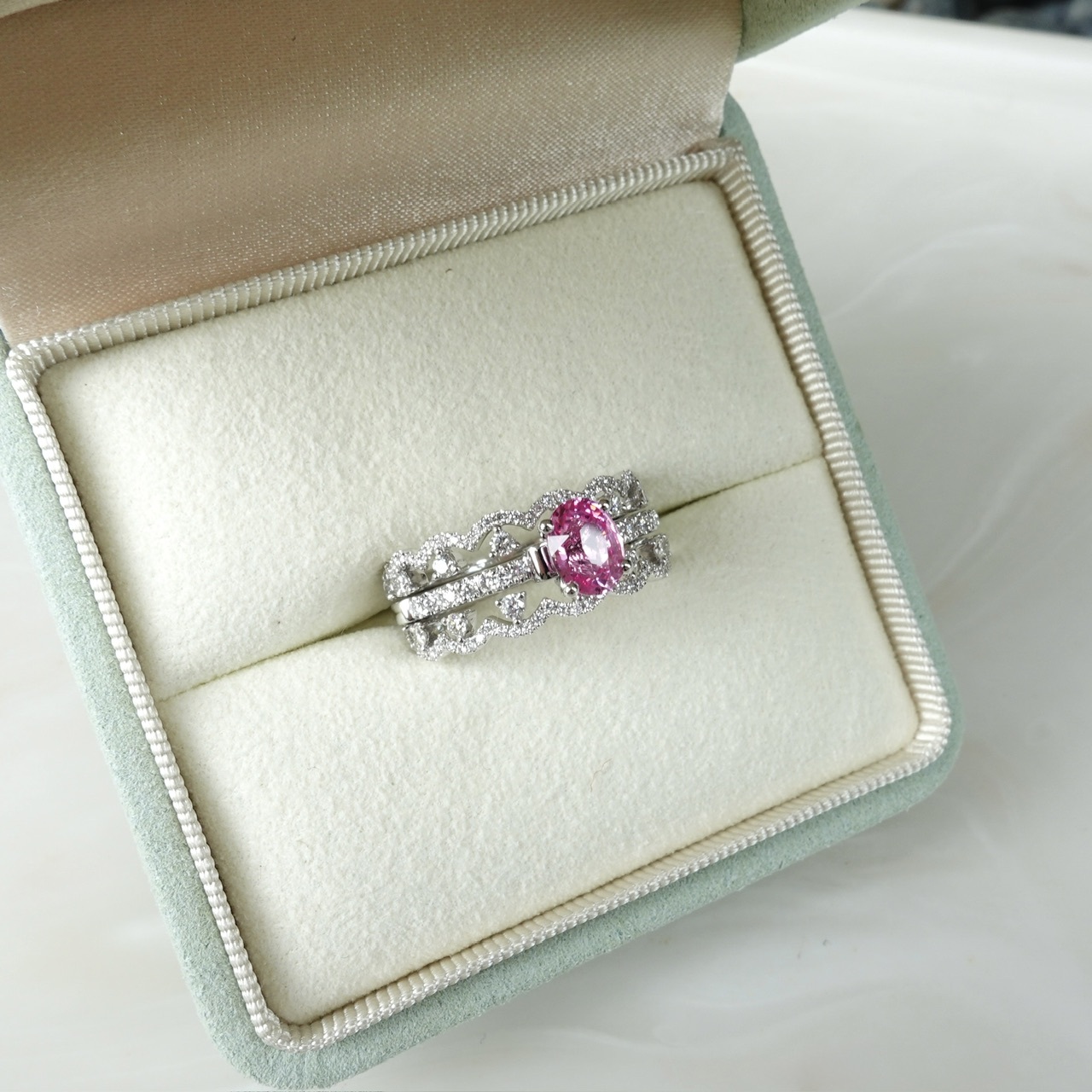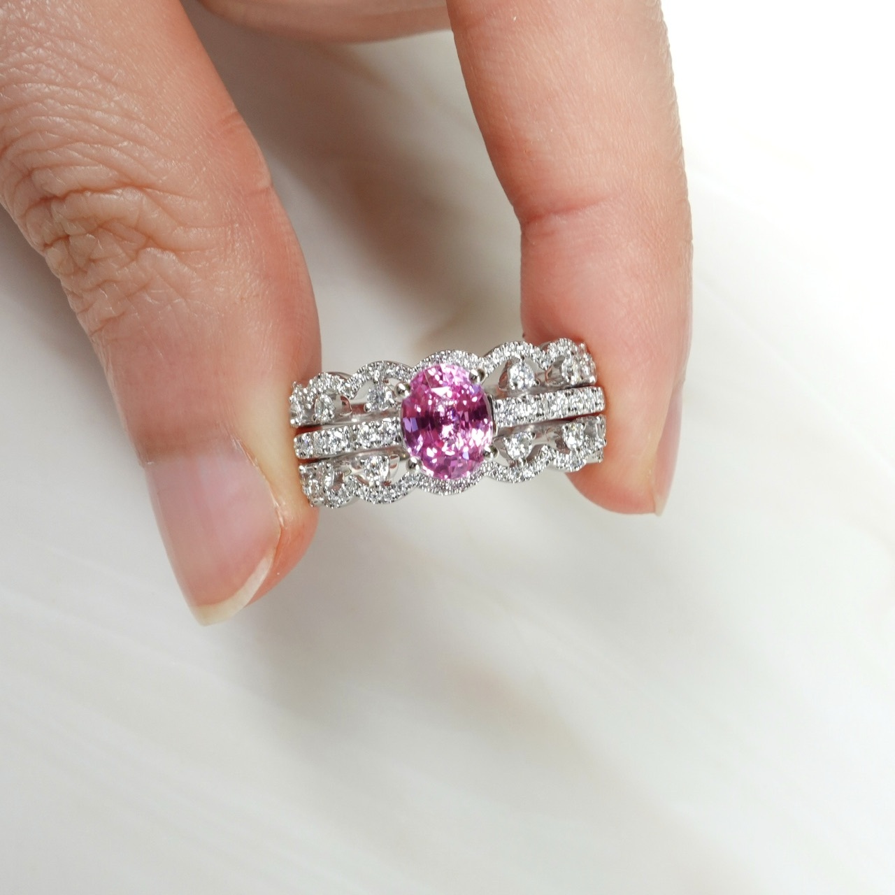 日出色Padparadscha滿溢甜美光暈,橢圓切割迸發極致火彩✨一套三戒,獨家設計「收腰底托」,讓主石戒與蕾絲鑽石排戒完美嵌合。單戴時優雅自若,疊戴則璀璨奪目——隨手搭配,日常佩戴即刻升級為設計師收藏!