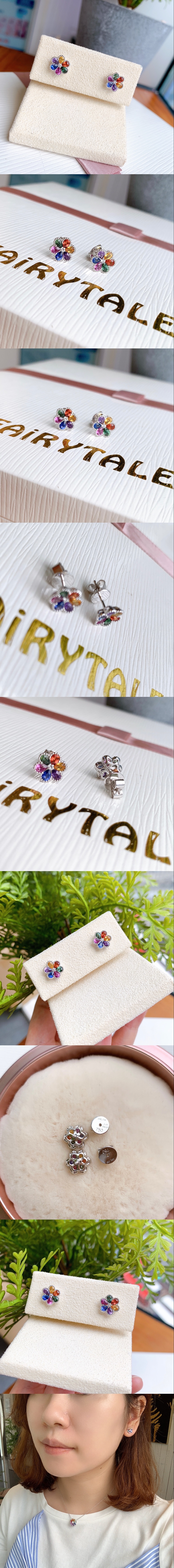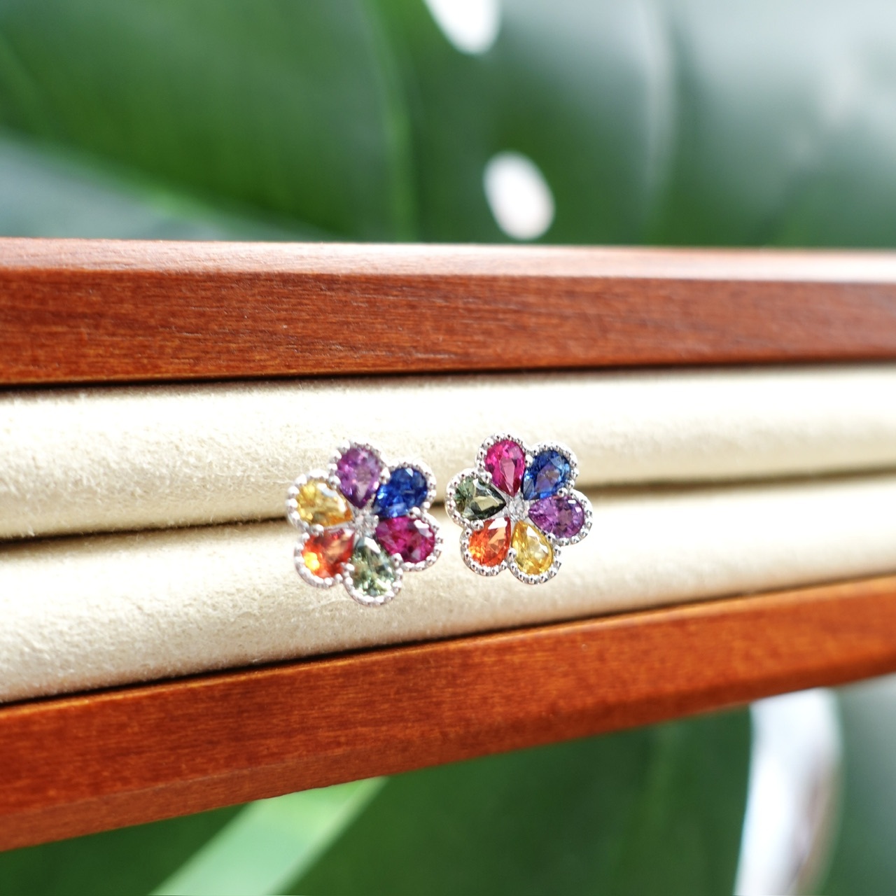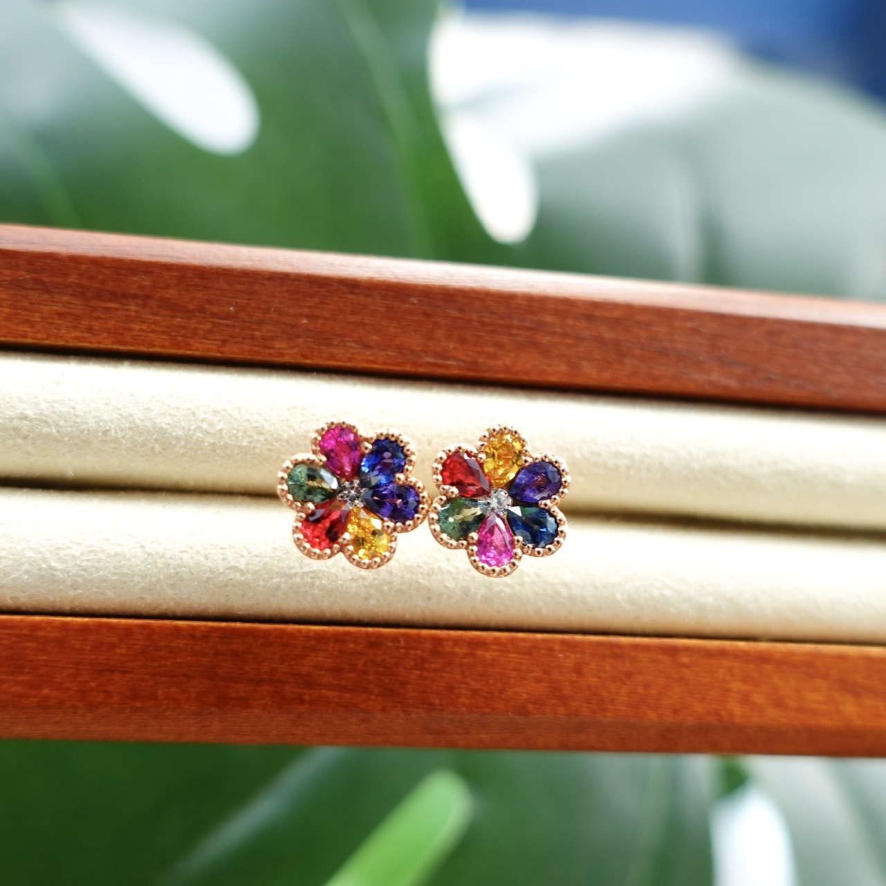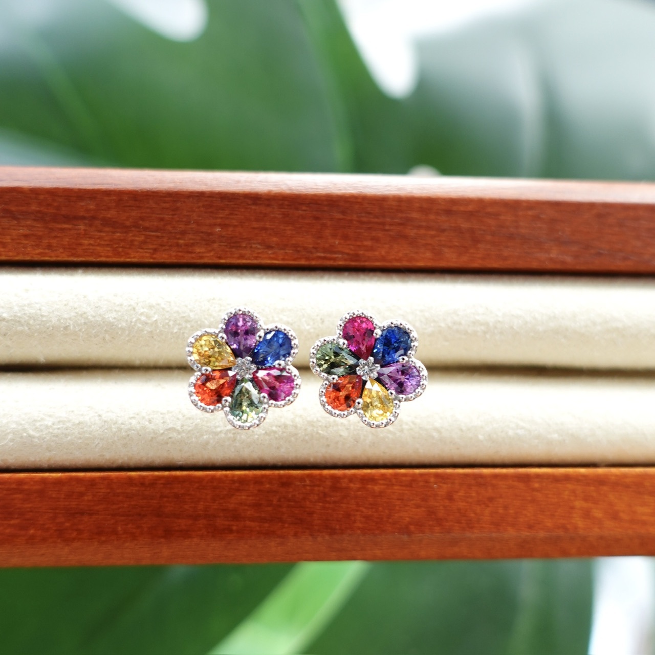 18K金彩虹藍寶拼花鑽石耳釘-六瓣