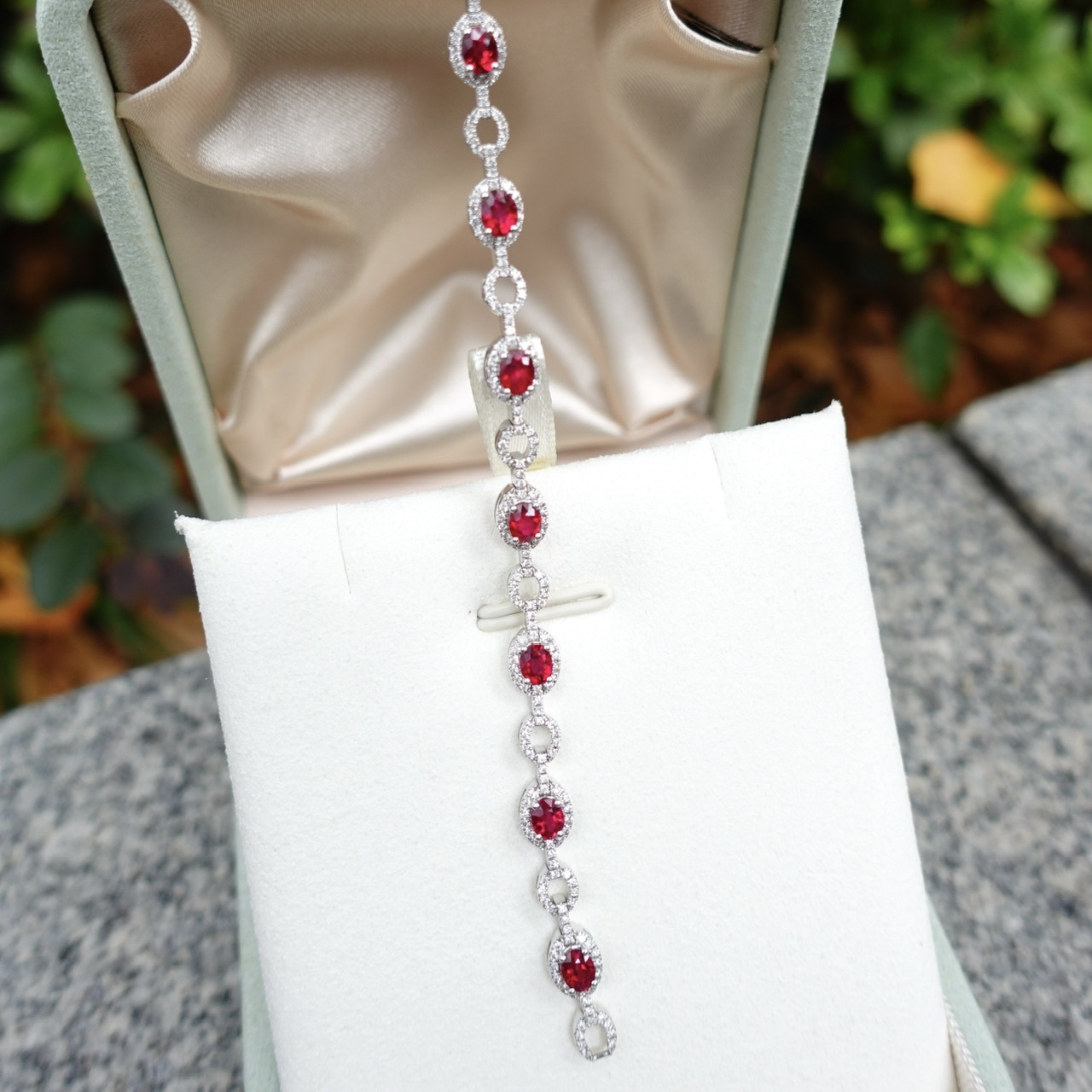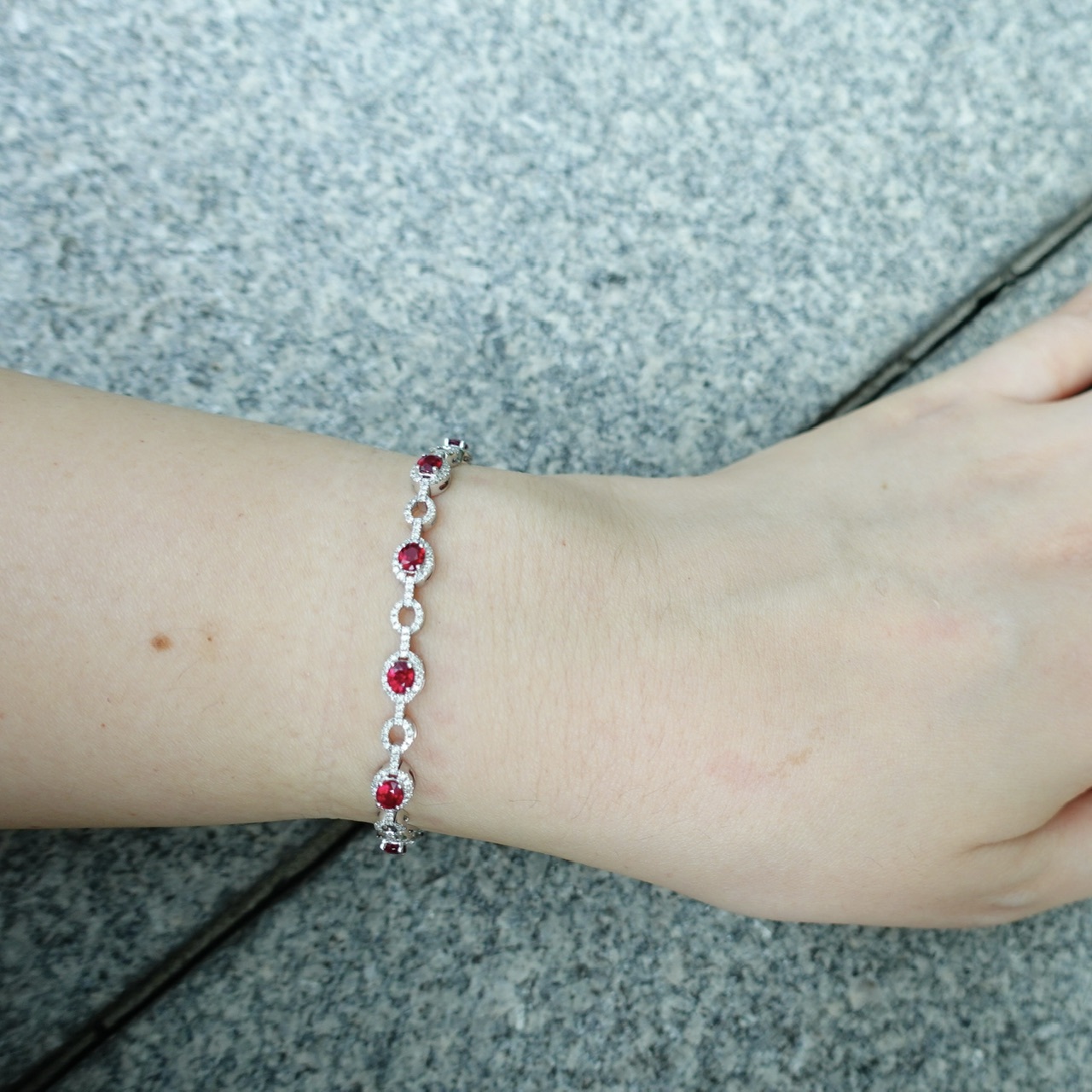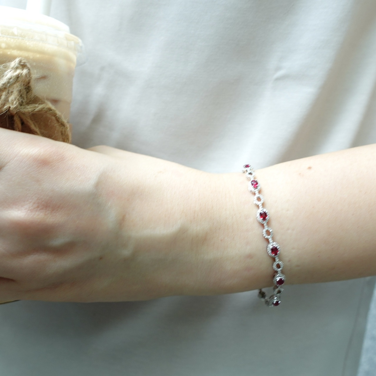 精選濃郁熾烈的鴿血紅寶石,色澤鮮明,絕不暗沉。即便在陰天光線下拍攝的產品照,依舊能拍出如火焰般溫暖耀眼的紅色光采。紅寶石與圓鑽交織相映,勾勒出輕盈靈動的線條。