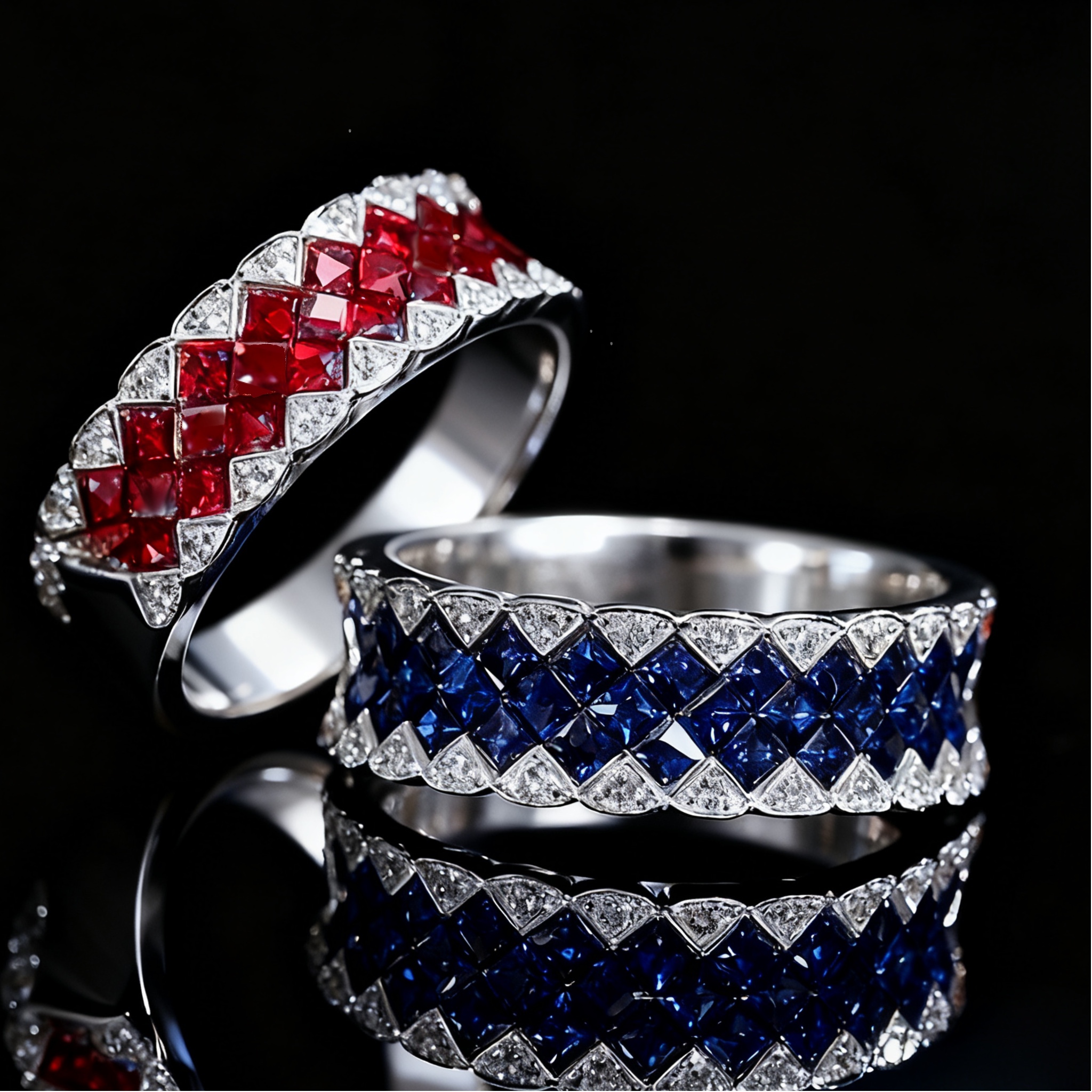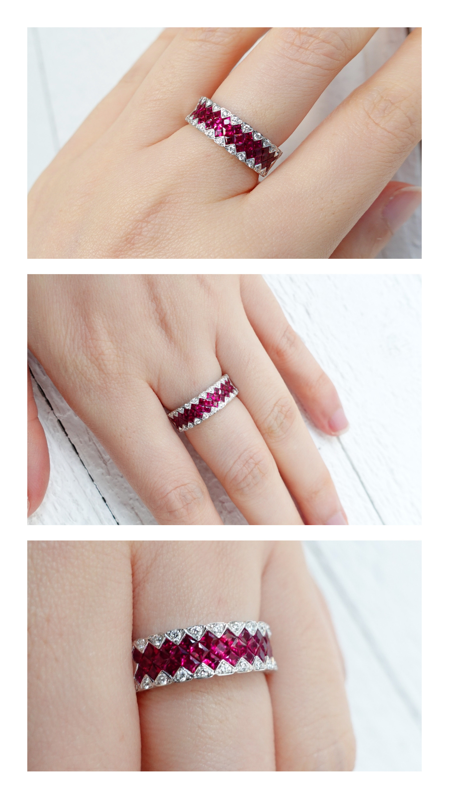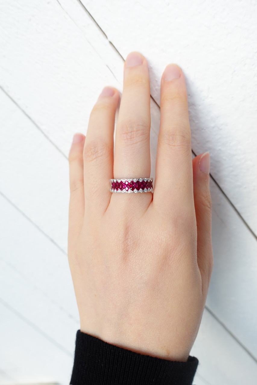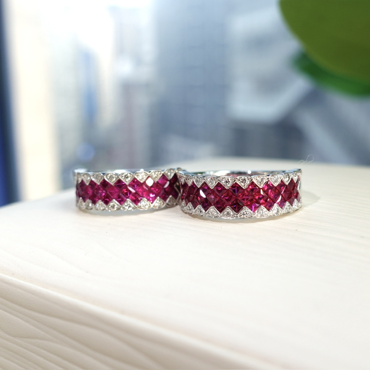 圖中的紅寶石戒排便是採用「無縫鑲」的技巧,肉眼看不到任何鑲爪,寶石排列井井有條,熱情的紅色系無縫拼接後耀眼奪目。