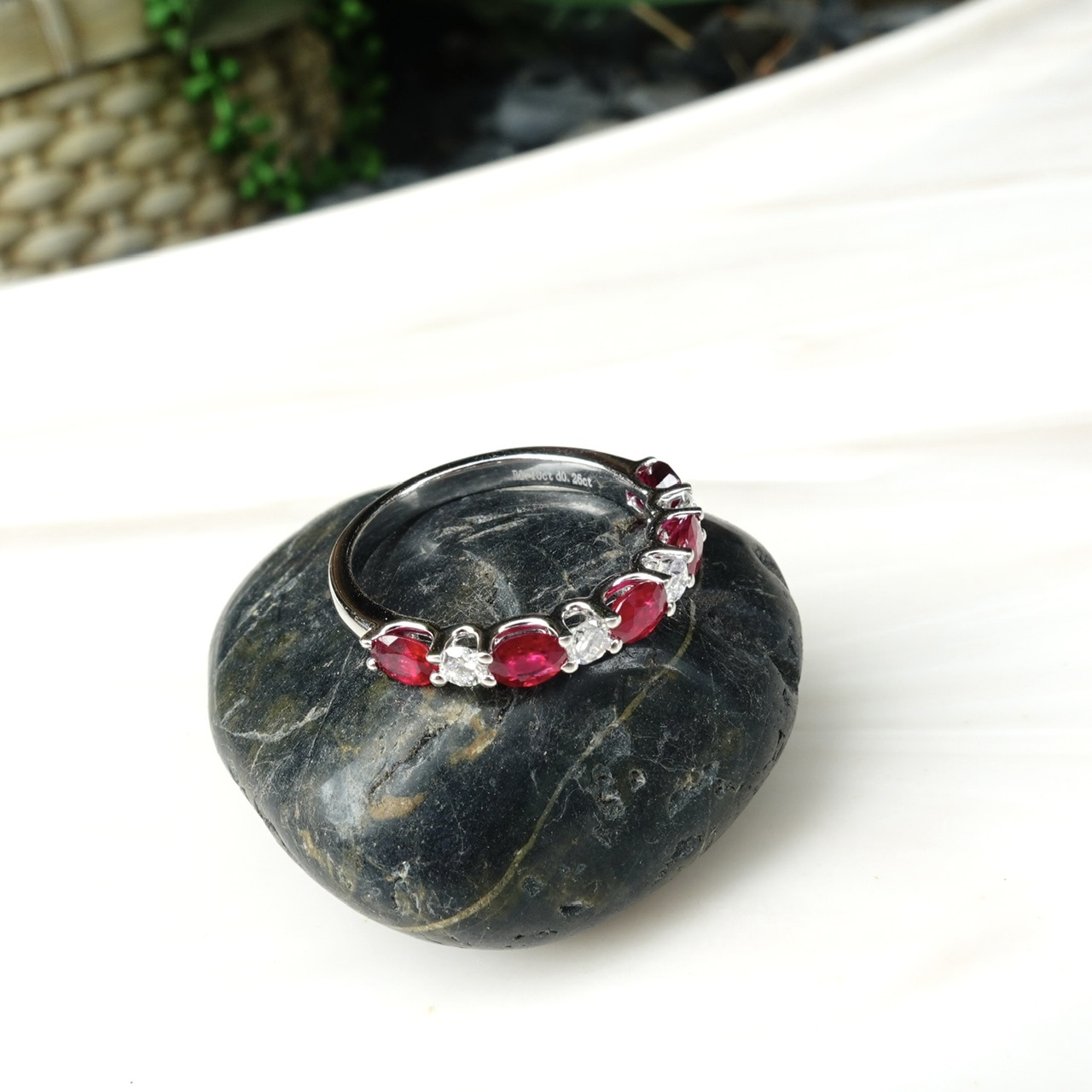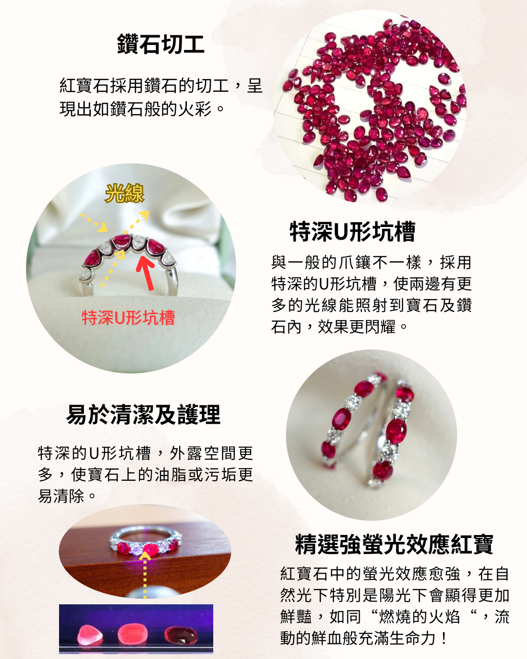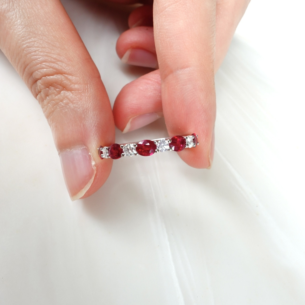 1.紅寶石採用鑽石的切工,呈現出如鑽石般的火彩,與明亮式鑽石相間排列,兩者火彩互相輝映