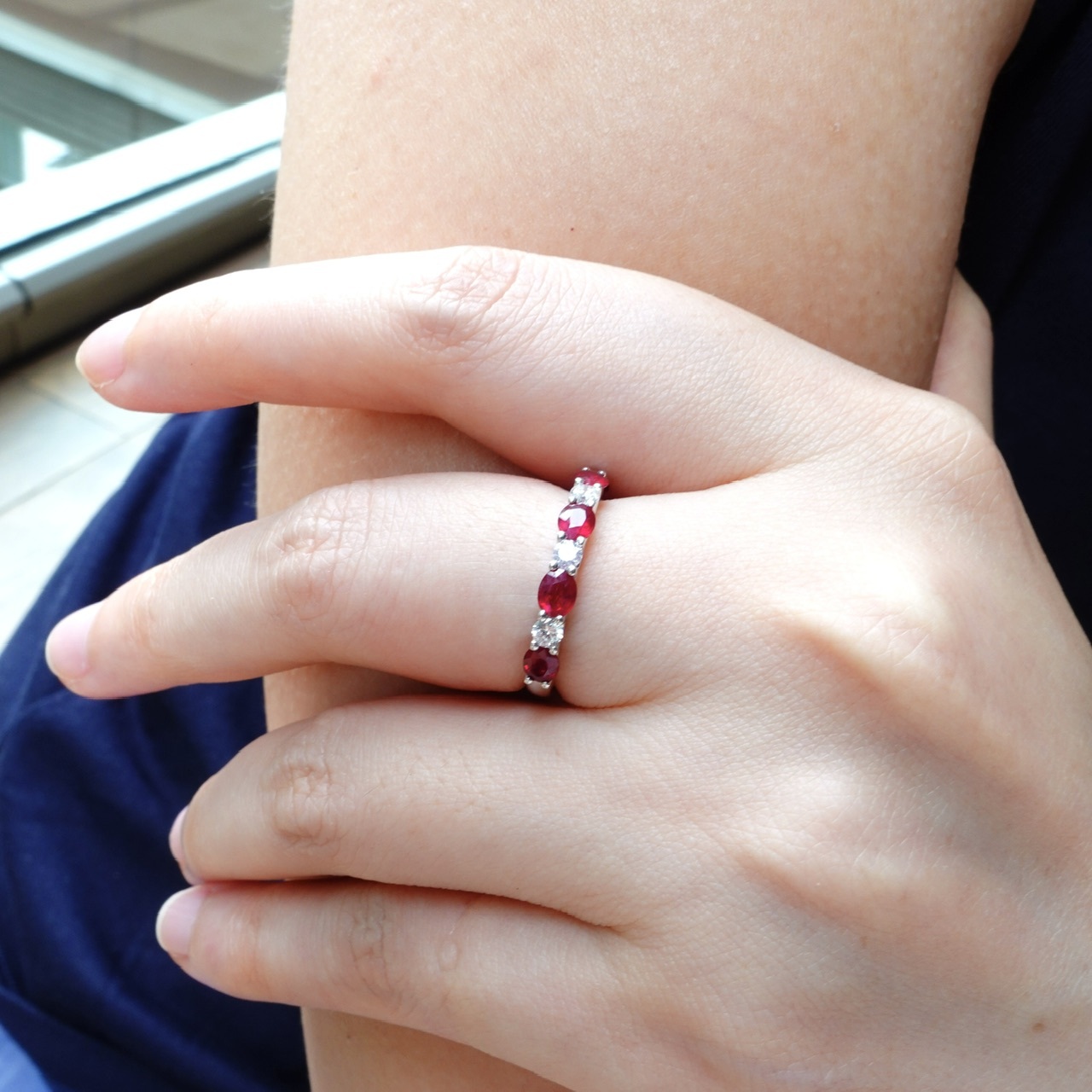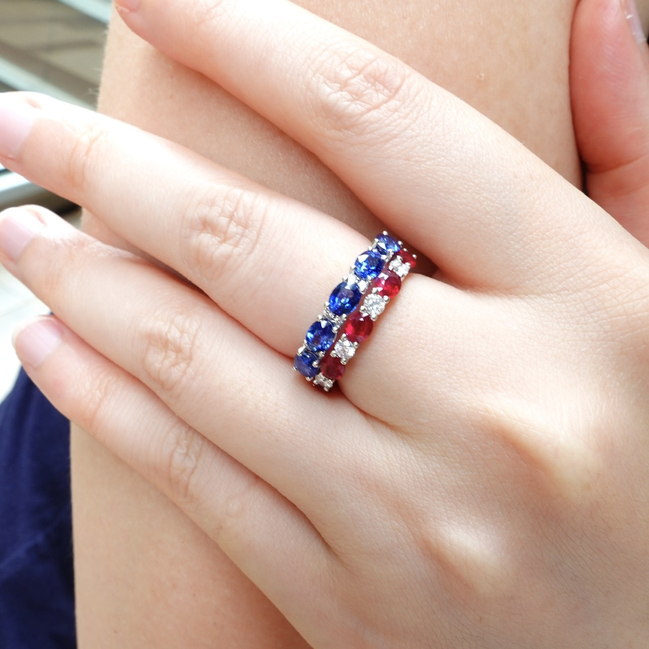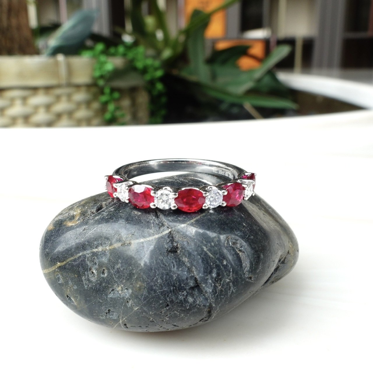 1.紅寶石採用鑽石的切工,呈現出如鑽石般的火彩,與明亮式鑽石相間排列,兩者火彩互相輝映