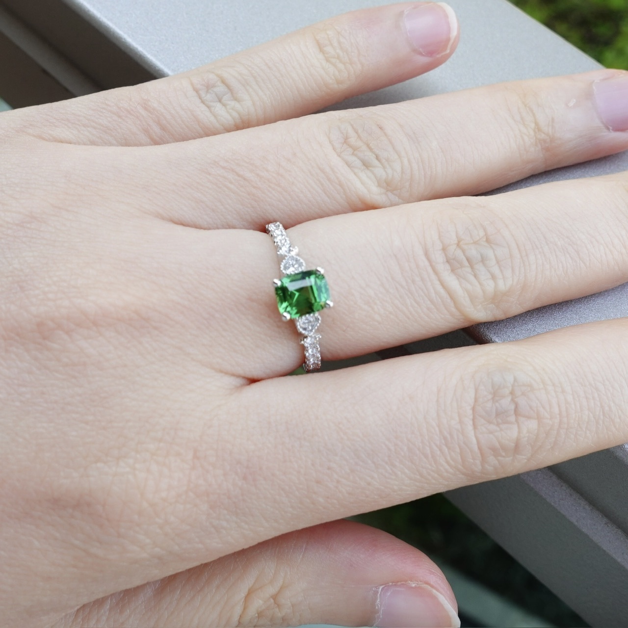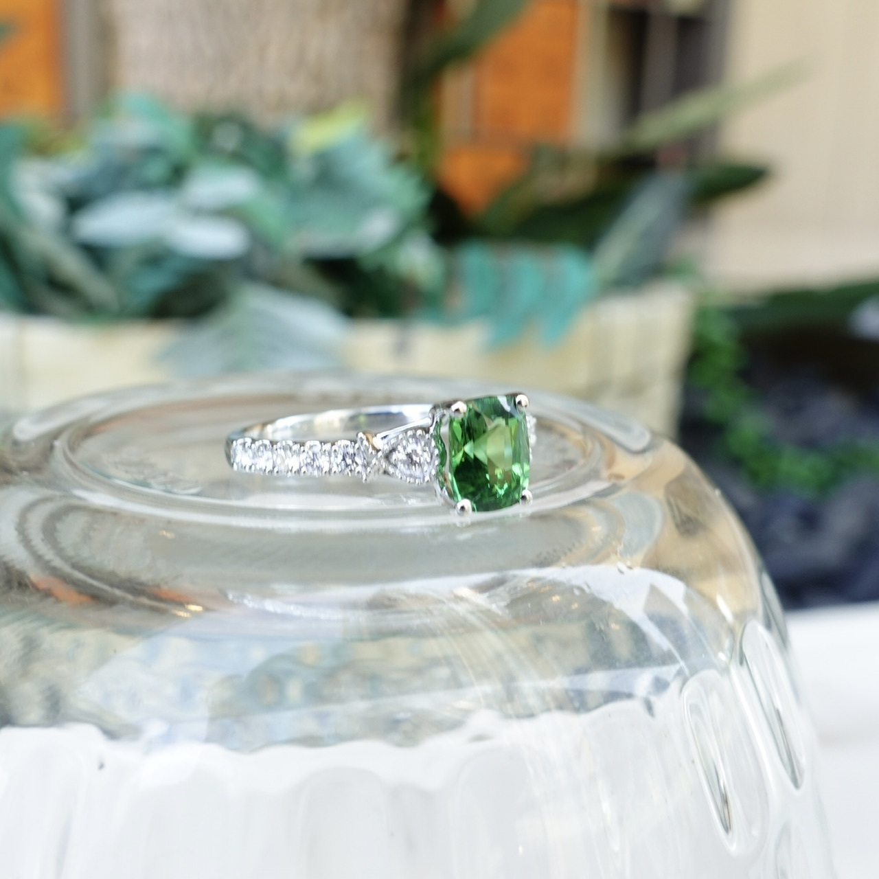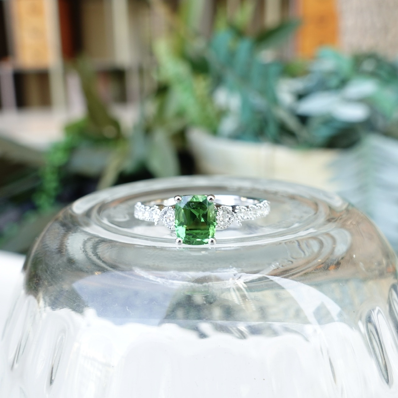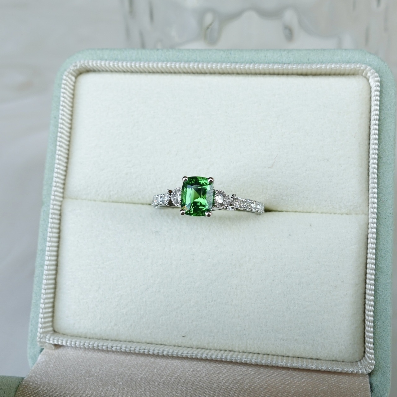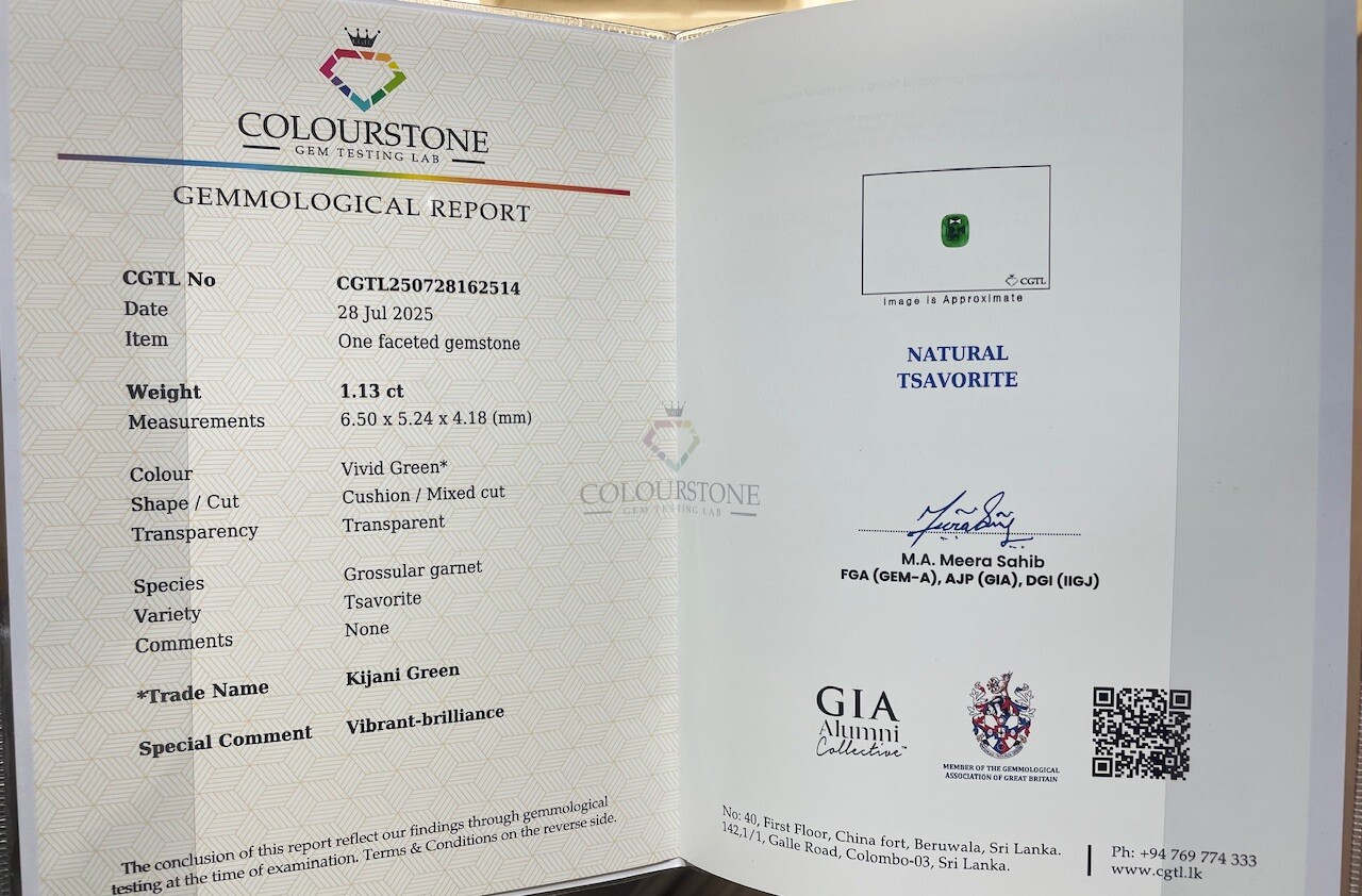 「Kijani Green 卡扎尼綠」,是沙弗萊 顏色等級中的頂尖存在——高飽和度的翠綠如盛夏森林,明度恰到好處,既鮮亮又不失深邃。這顆1.13ct主石不僅擁有頂級色相,更擁有高淨度玻璃晶體純淨體質、精湛切割的火彩閃耀,成為石榴石族中萬里挑一的「三高典範」:高折射率、高淨度、高稀缺性。