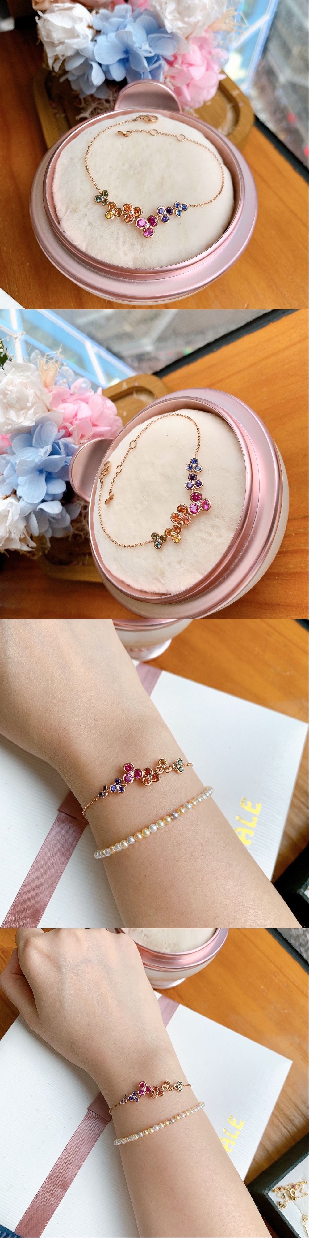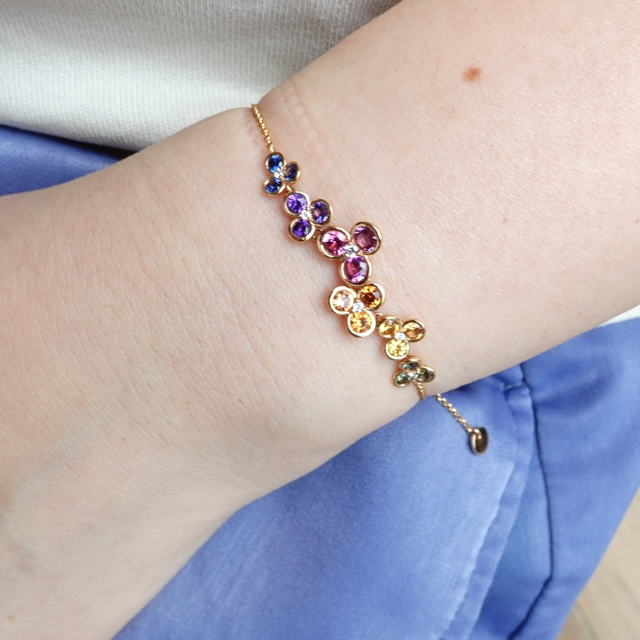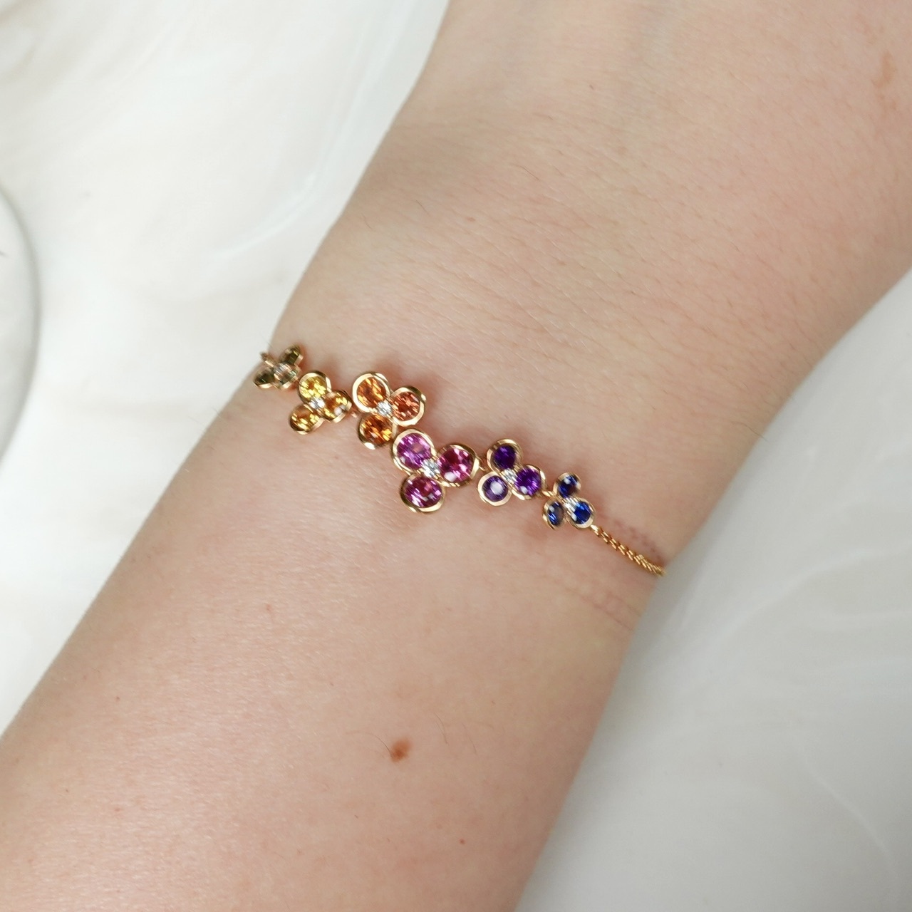 這款手鏈以花朵造型串聯,花瓣鑲嵌彩色藍寶石,層遞出彩虹般的絢麗光譜。花心點綴的鑽石宛如凝露,增添璀璨亮點。整體設計巧妙融合幾何對稱的秩序與自然靈動的姿態,做工極致精細,每個角度都閃耀迷人光彩。