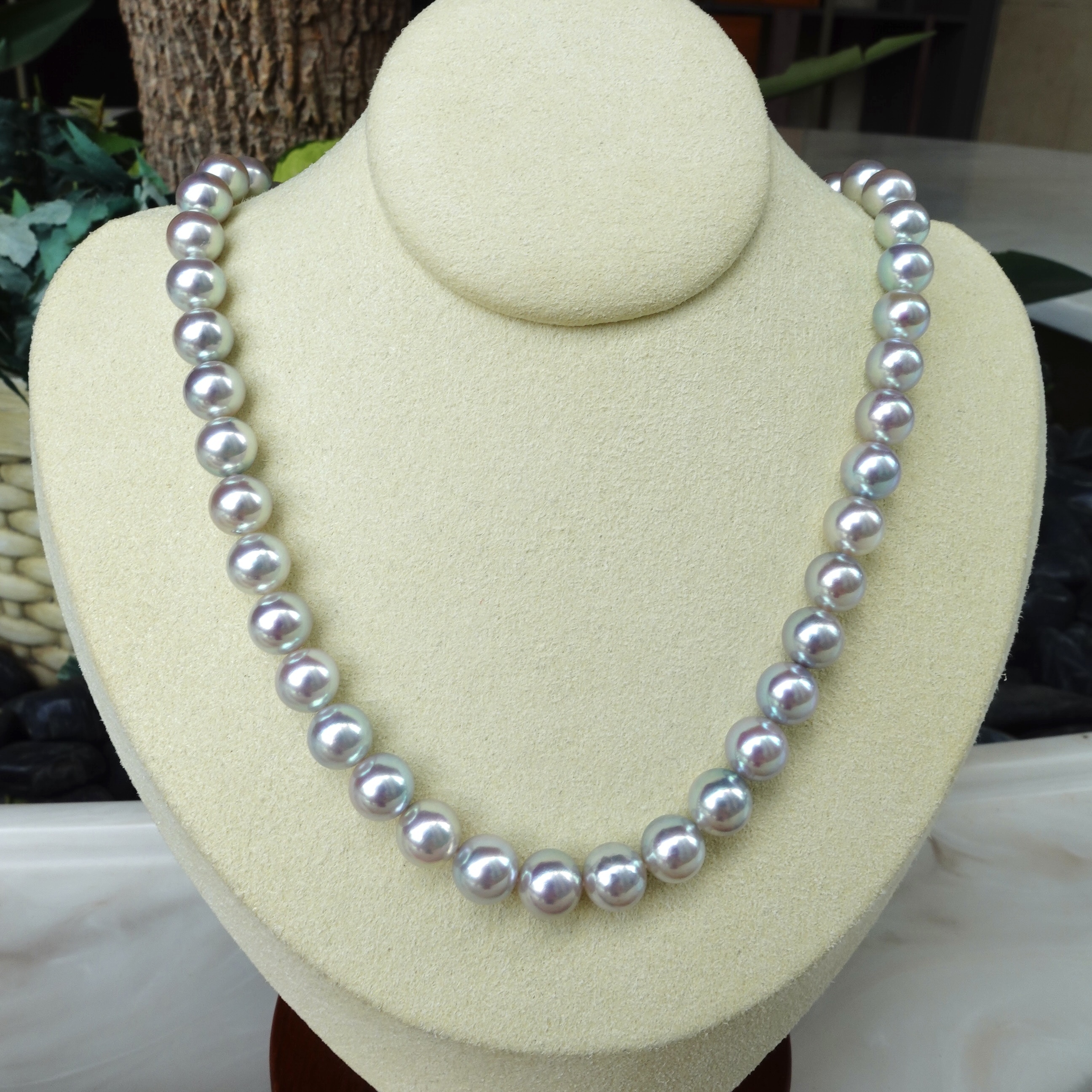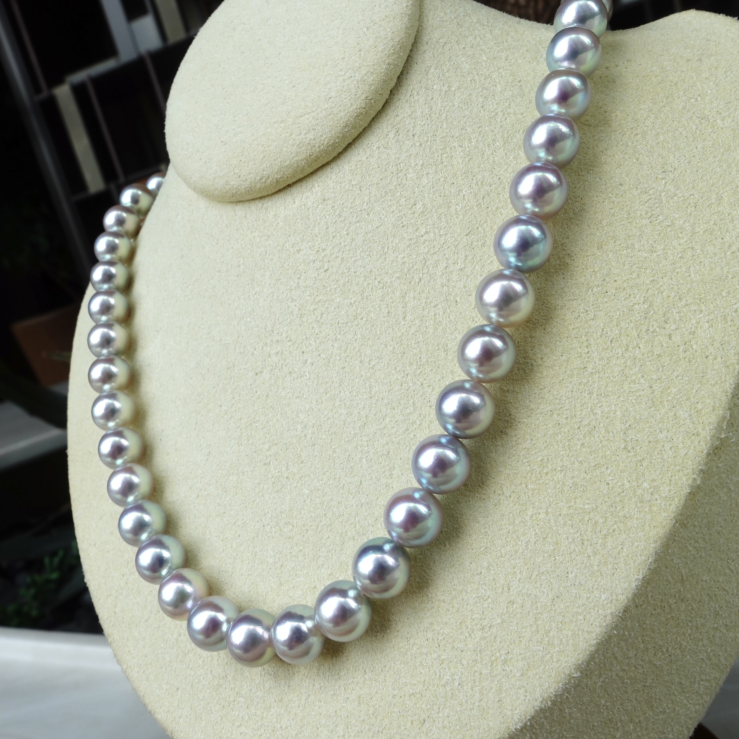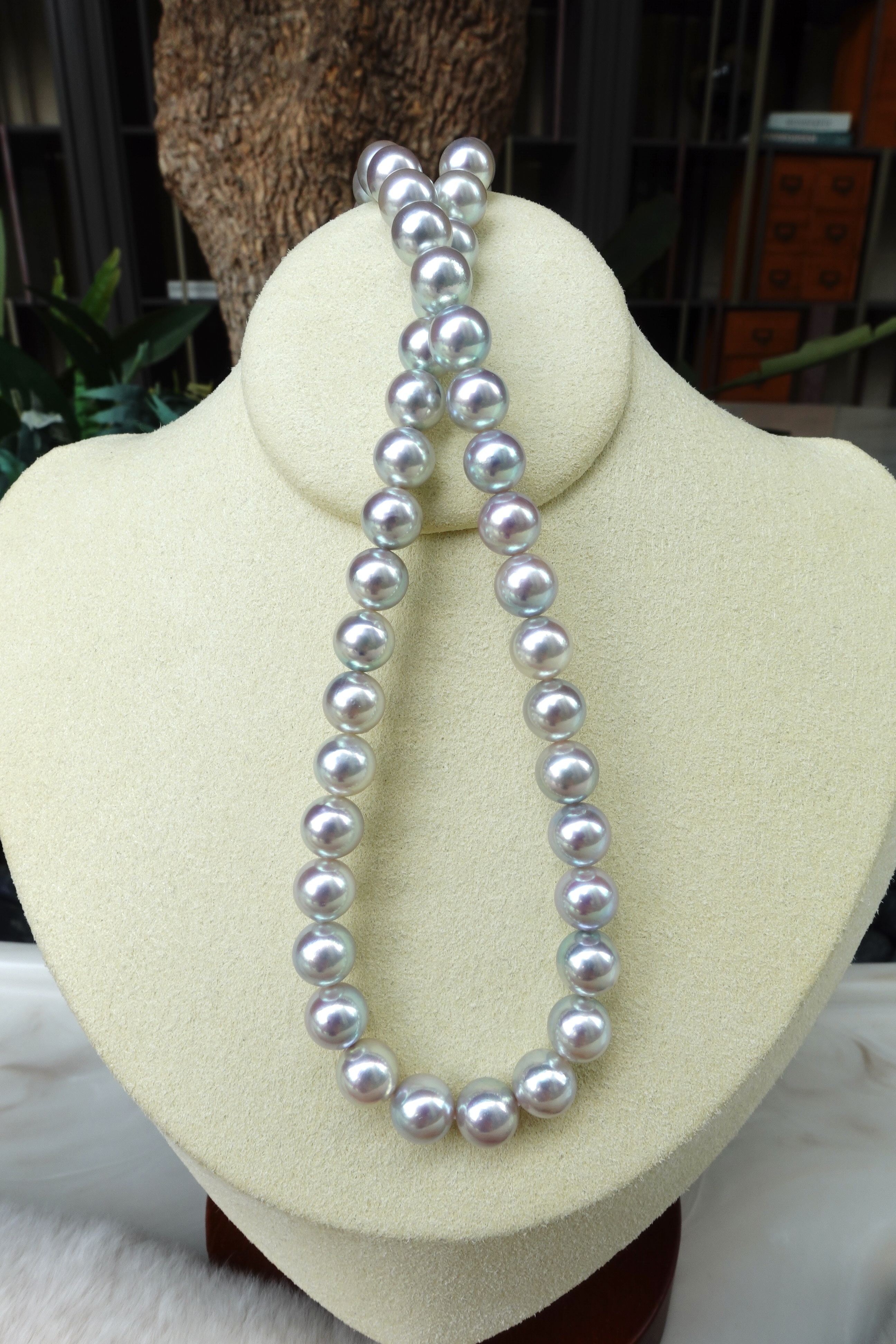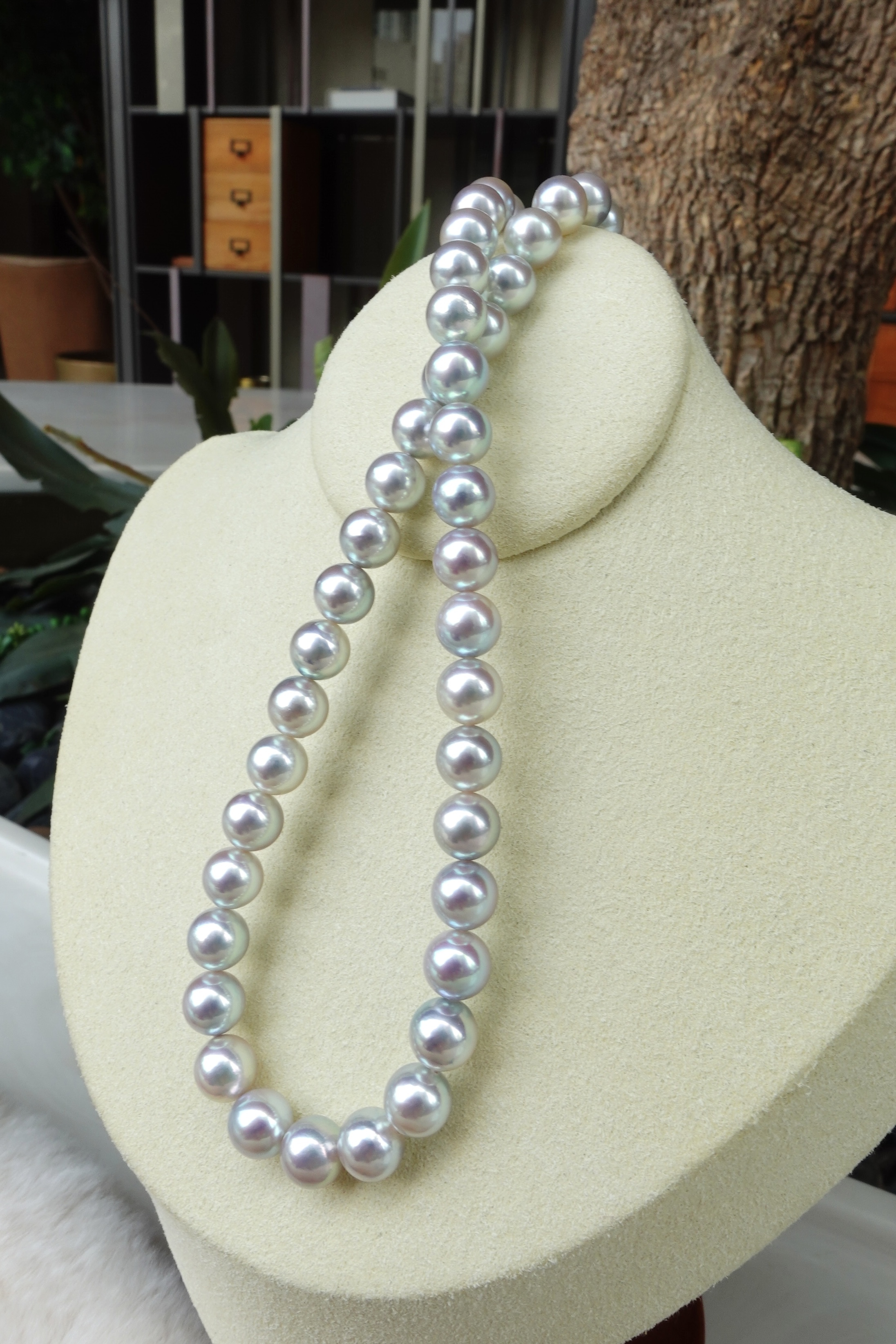 極光藍玫瑰blue rose是天然藍灰色系的akoya珠串里,皮光最亮的那2%。Akoya的總產量,不到20%為藍灰色系,其中只有2%-3%可以成為真多麻,往下2%,達不到真多麻的級別,但是皮光是最亮的那一檔,就是blue rose。