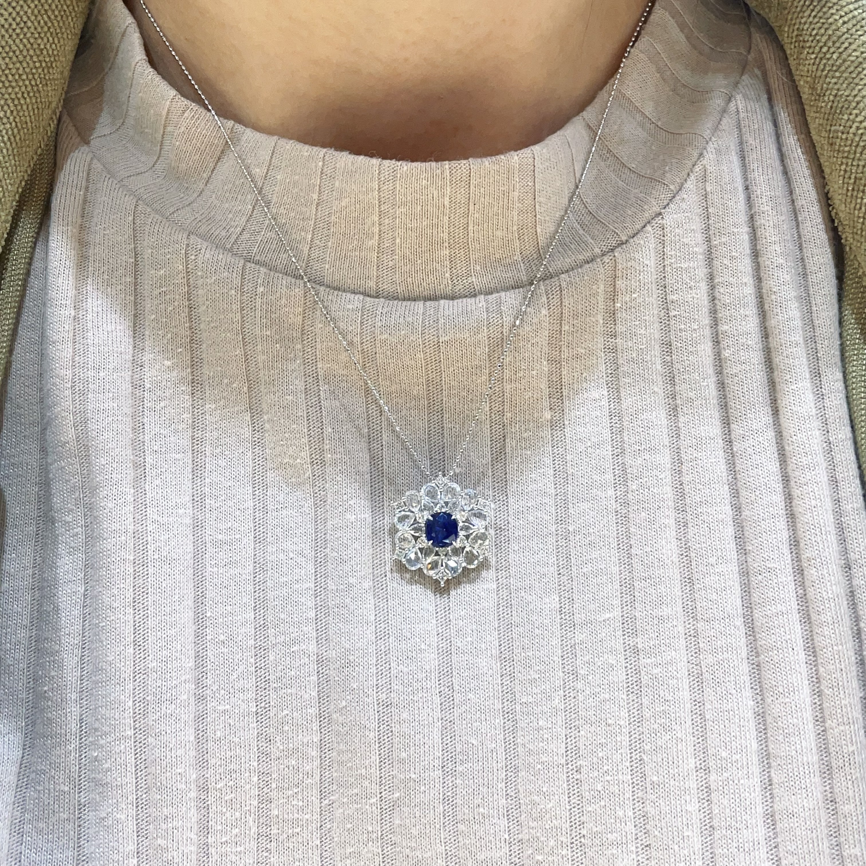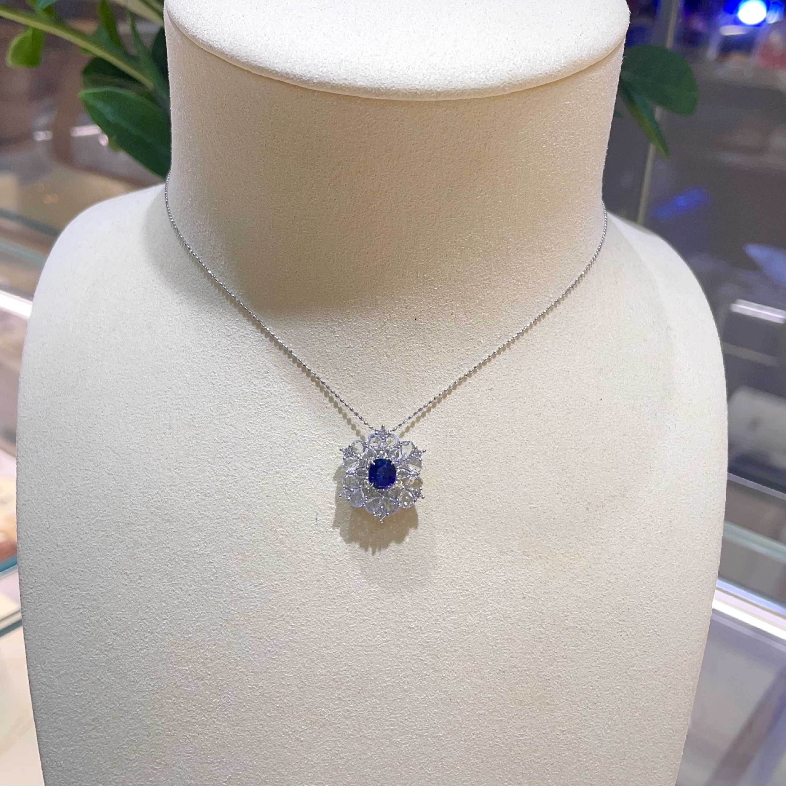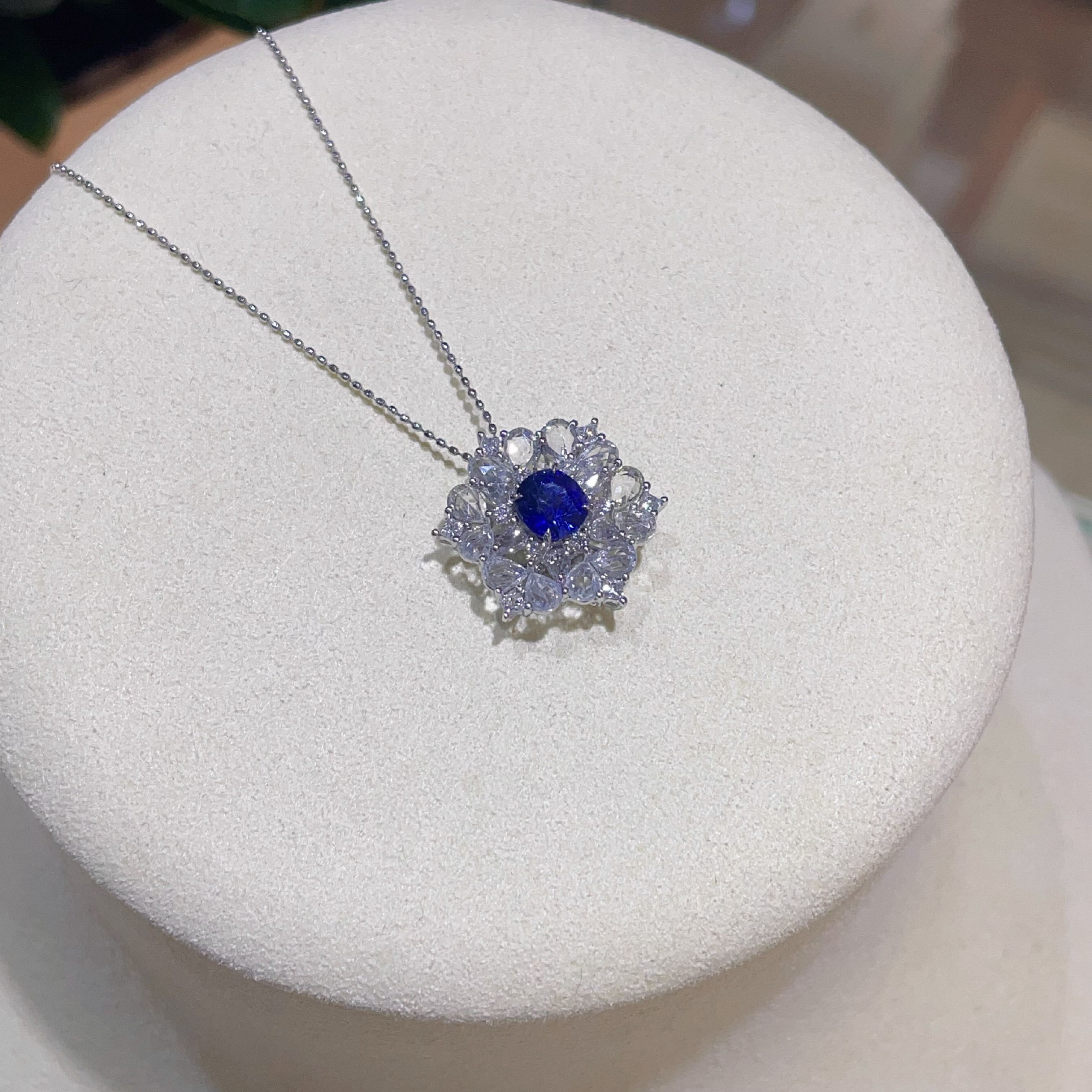 1.28ct皇家藍藍寶石,枕形切割,色澤如深海凝眸,深邃濃郁。周圍以Rose cut白藍寶與天然鑽石層層圍鑲,由內而外漸次綻放,化作放射狀花瓣,光影流轉,層次分明。戒指與吊墜兩用設計,一飾雙戴,於指尖與頸間自由變幻,優雅隨心。
