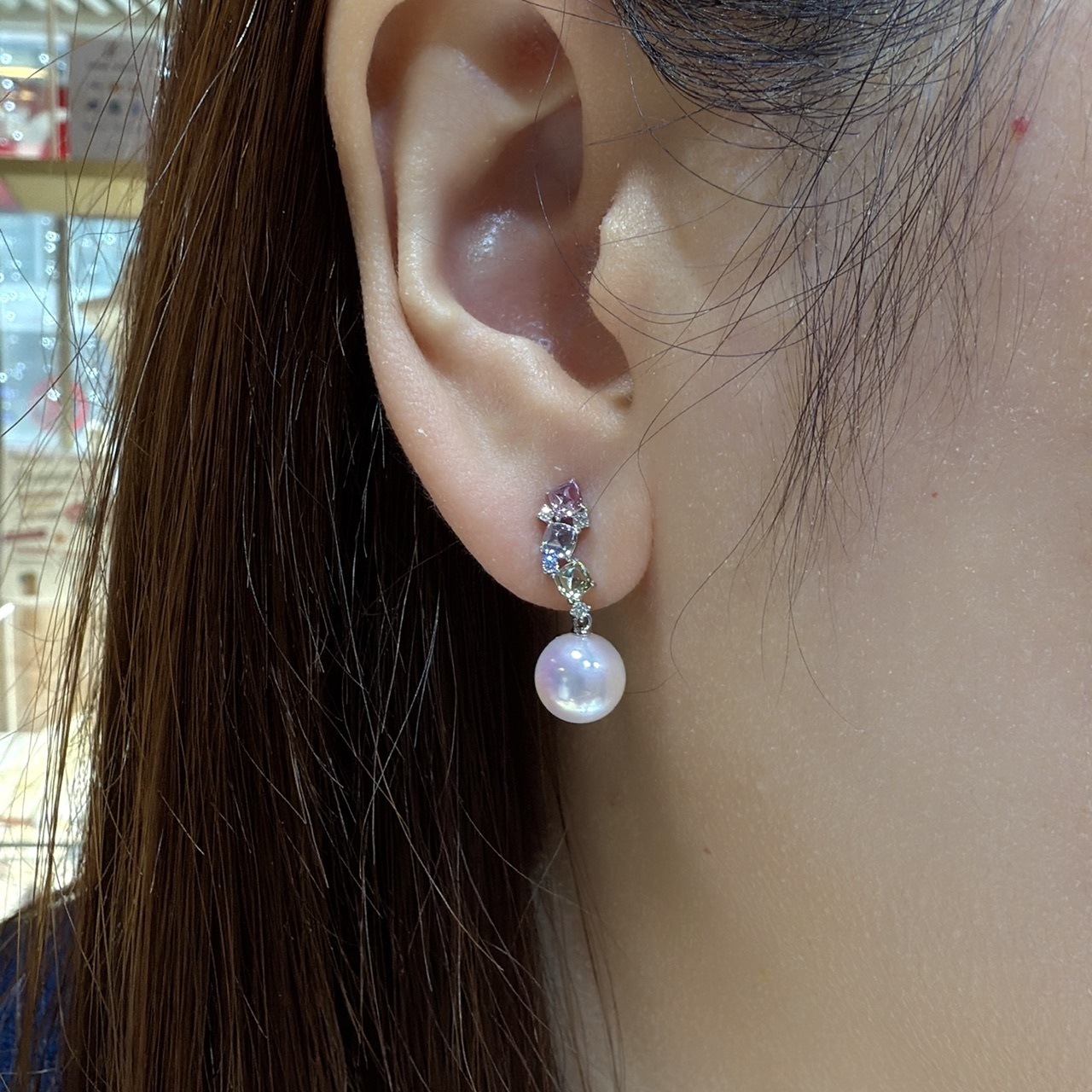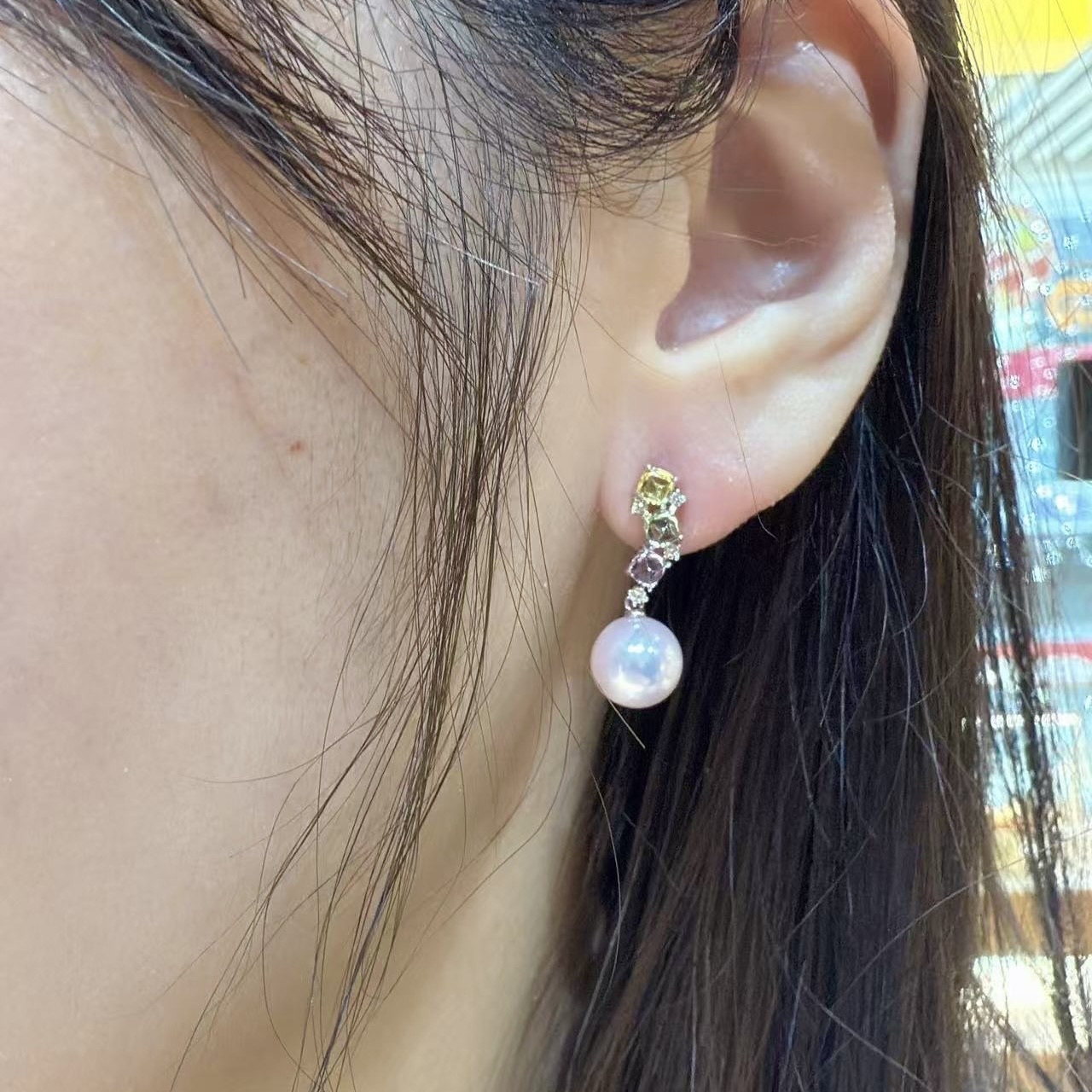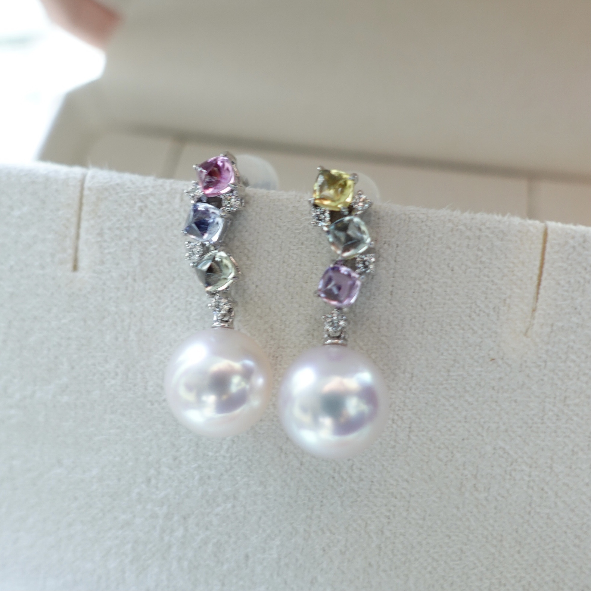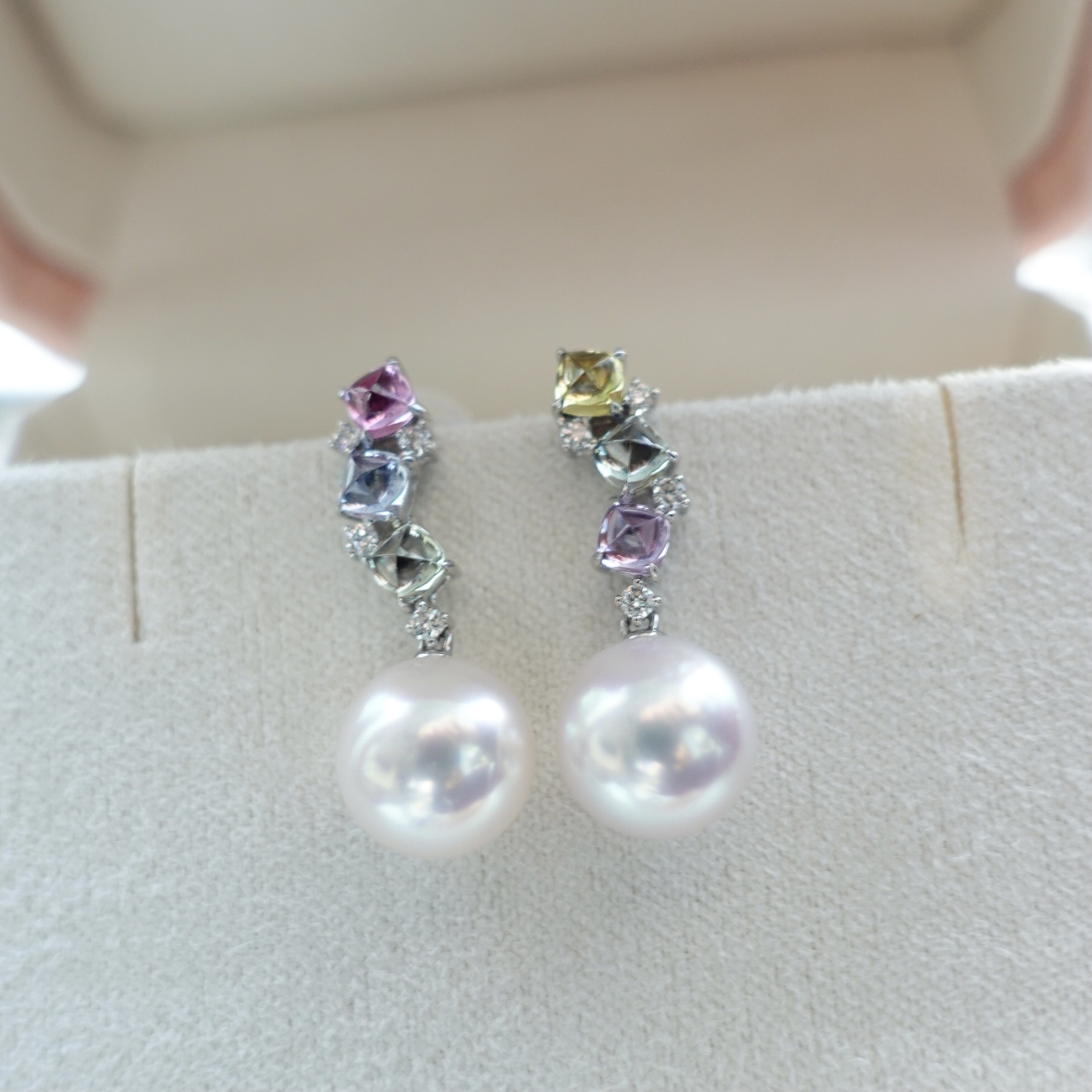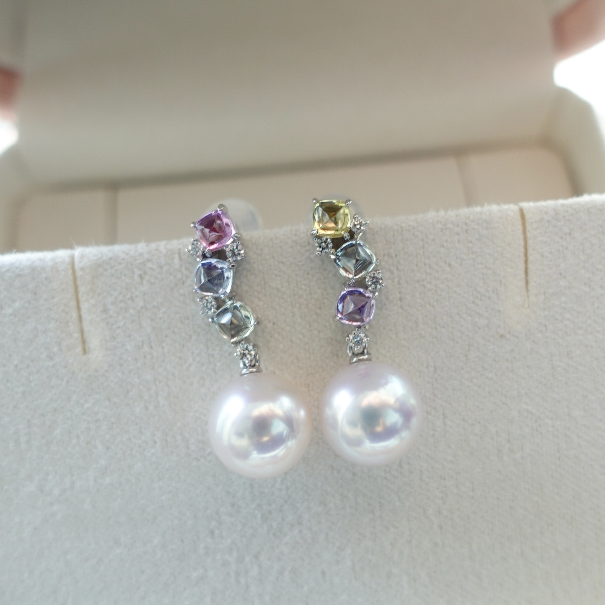 糖塔這種切割方式捨棄了寶石的火彩,但凸顯了寶石晶體和其本身的顏色!彩色的糖塔形藍寶石,像把彩虹熬成了糖漿,一滴滴凝固成一座會發光的水晶塔!下墜鏡面光澤的日本akoya,上耳瀅瀅透亮!