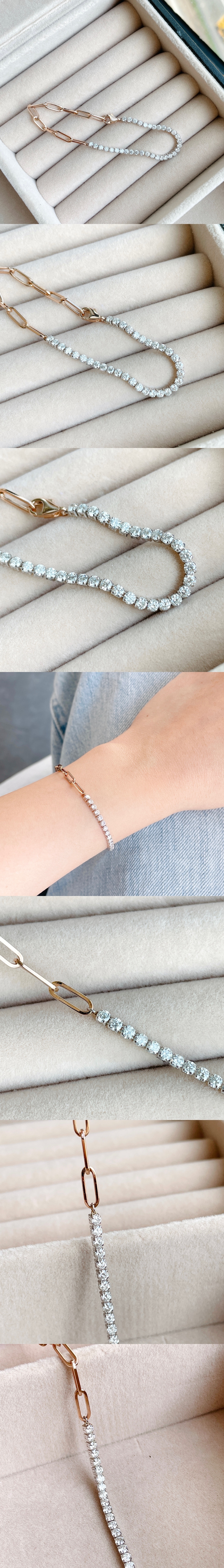 與傳統的tennis bracelet 鑲口比較,日本製輕金鑲口手鏈所需的鑽石更多,一眼望去幾乎看不到釘爪,盡是閃閃爍爍的光芒。