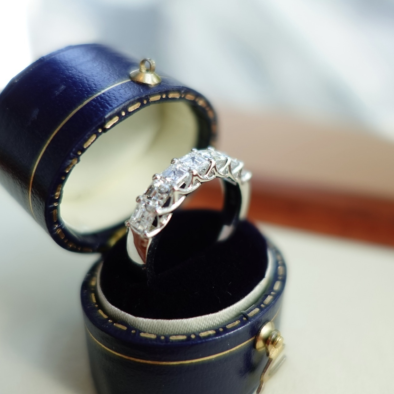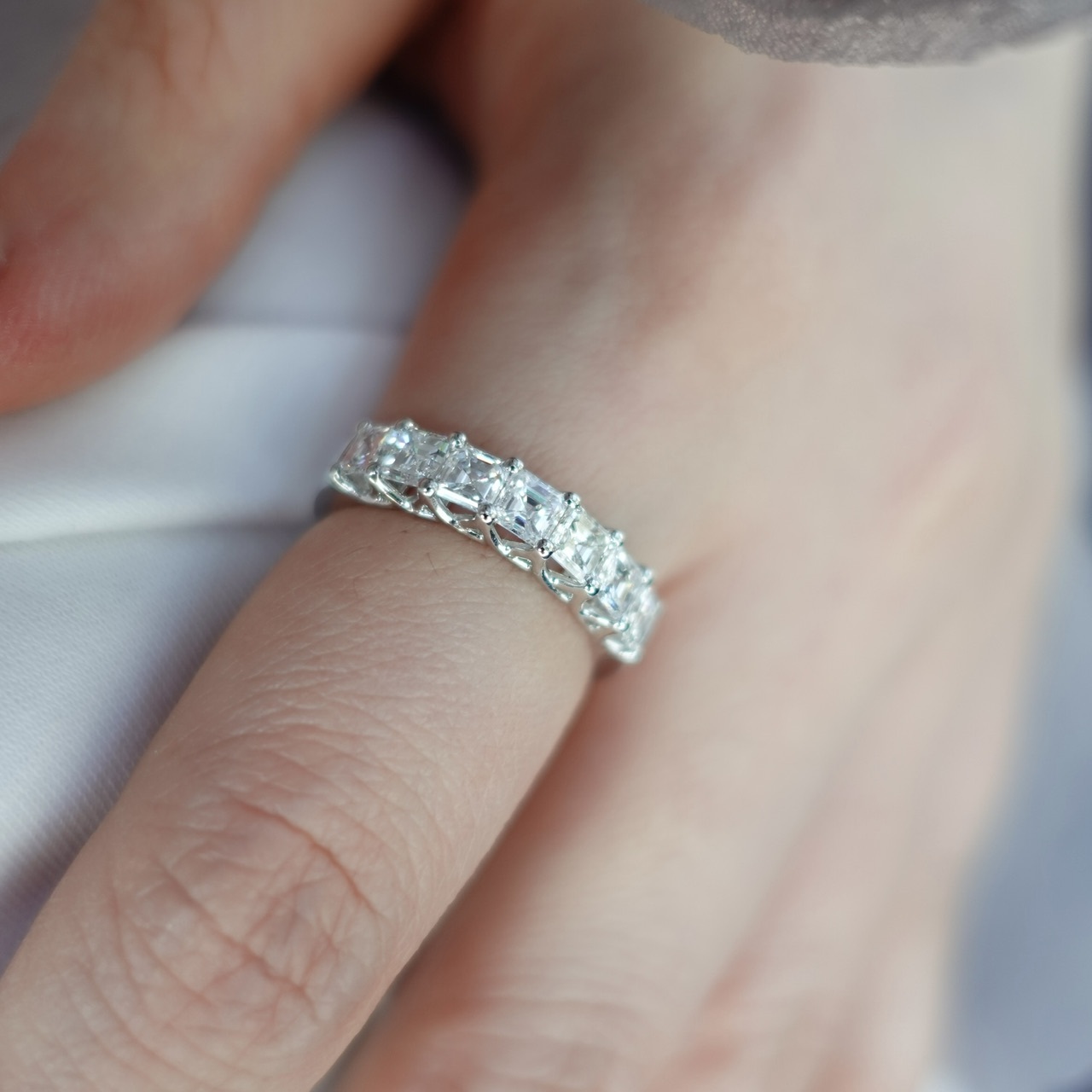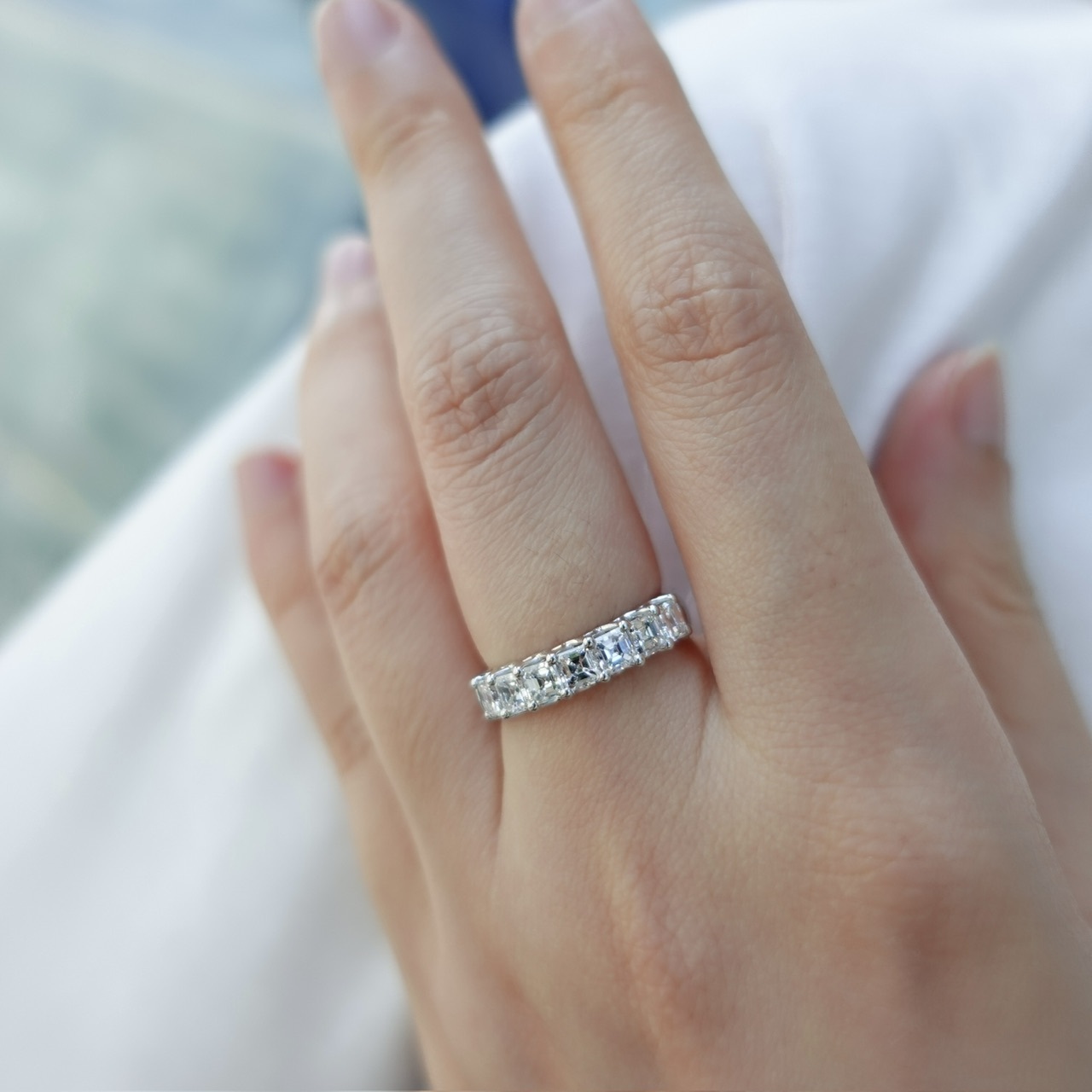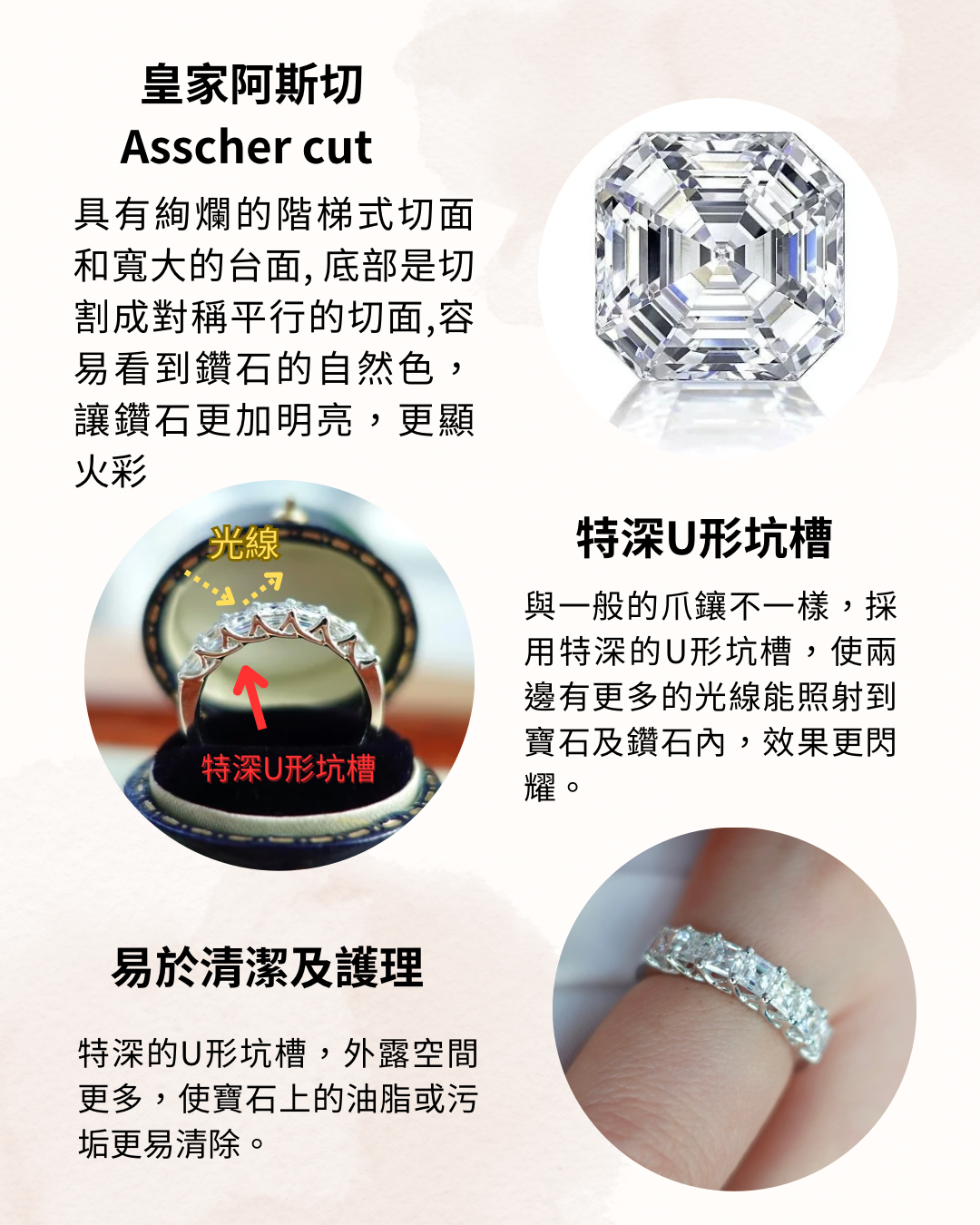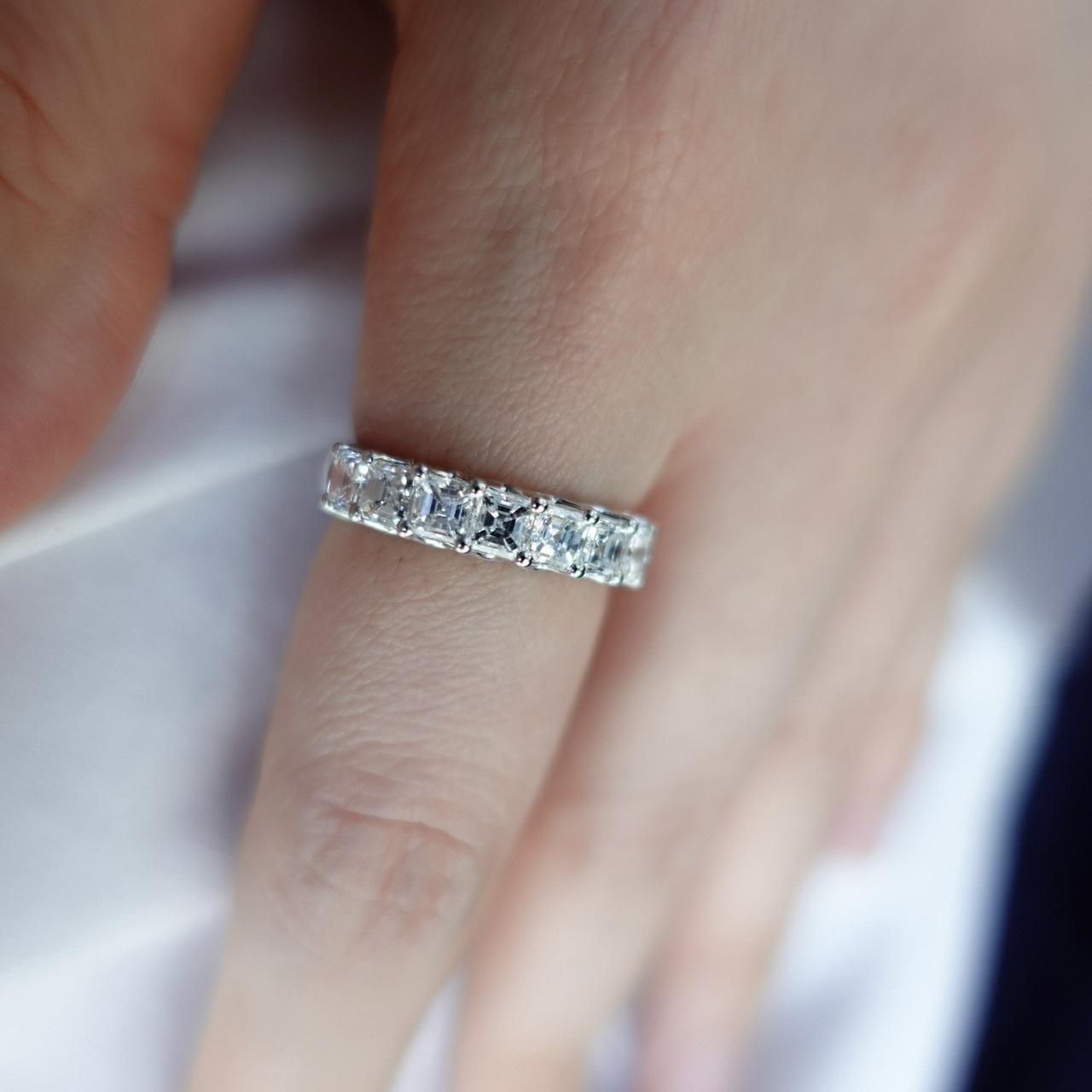 Asshcer cut有階梯式切面和寬大的台面,底部是切割成對稱平行的切面,相交於底部中心的一個點上。Asscher cut對每一個部份都遵循嚴苛的標準,每顆鑽石效果均呈正方形,因為每顆的長寬比例均保證在 1.00  1.05 之間,這種相稱性具有更好的深度,這種切割的鑽石比其他鑽石切割的色彩更鮮豔,這意味著很容易看到鑽石的自然色,更加明亮,更顯火彩,因此,我們也特意找來顏色淨度達最高質量(DEF vvs)的鑽石來完成這款戒指,呈現給大家如同高級珠寶品牌一樣的質感。