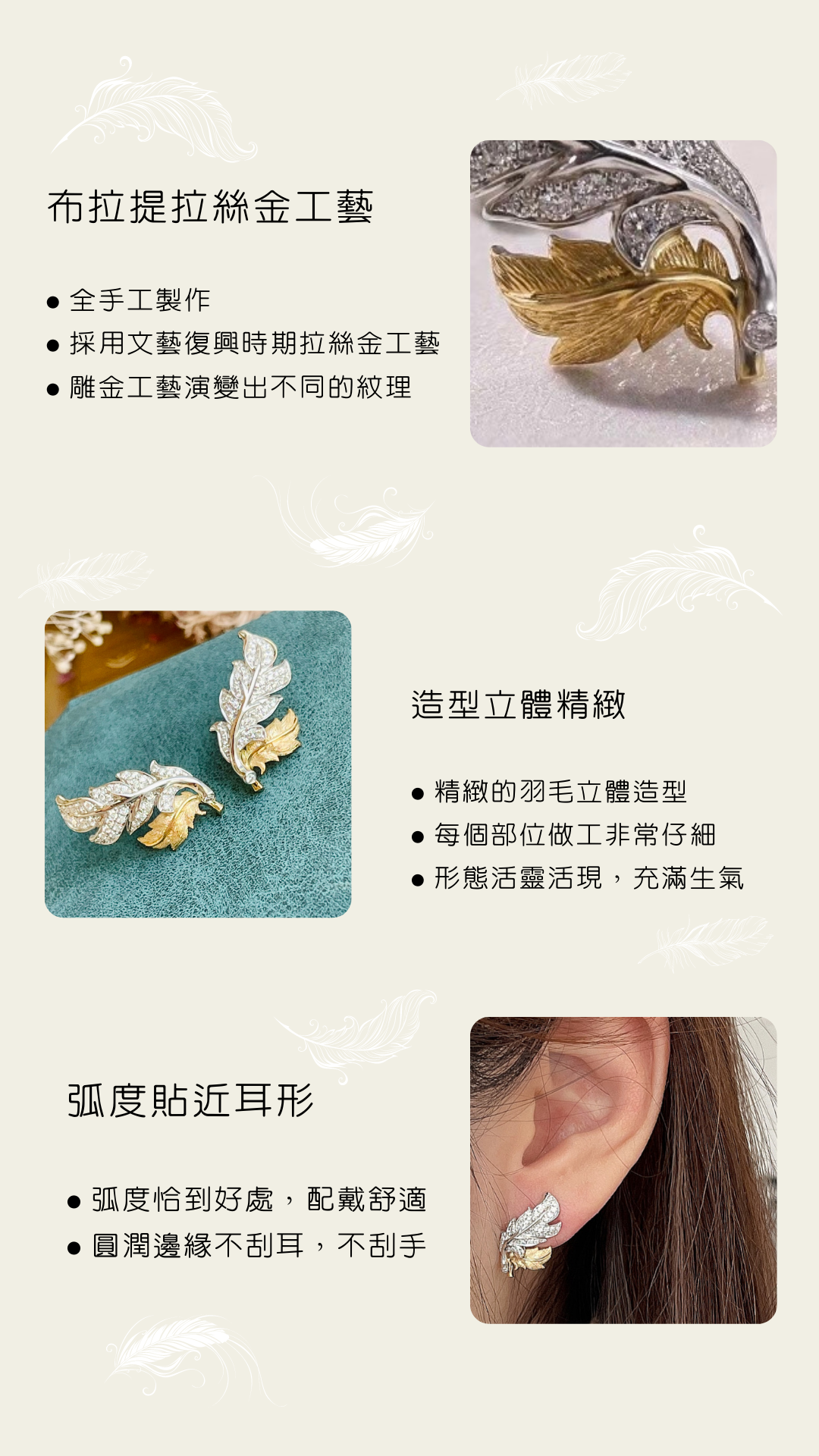 旁邊的18K黃金小羽毛採用了文藝復興時期盛行的布拉提拉絲工藝,是全手工製作,運用雕金工藝,演變出不同的紋理/質感,使K金看起來有如織物般柔軟的美感,如薄紗般輕柔,令珠寶格外華麗。✨