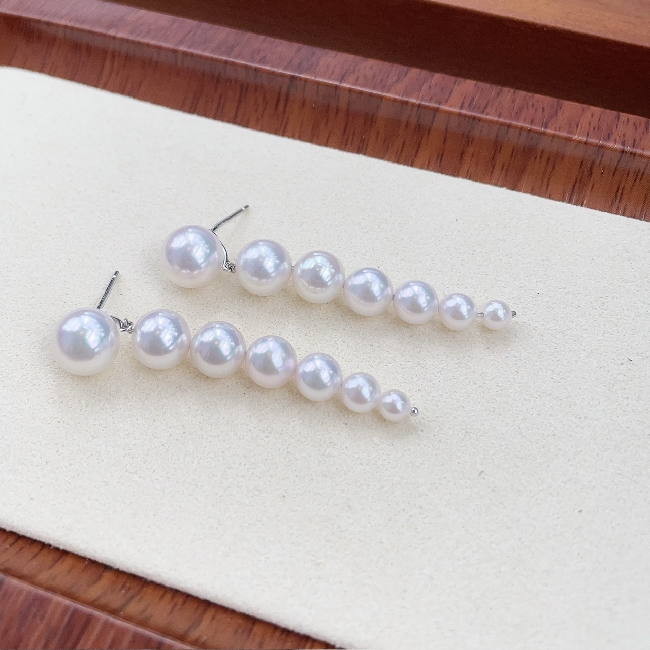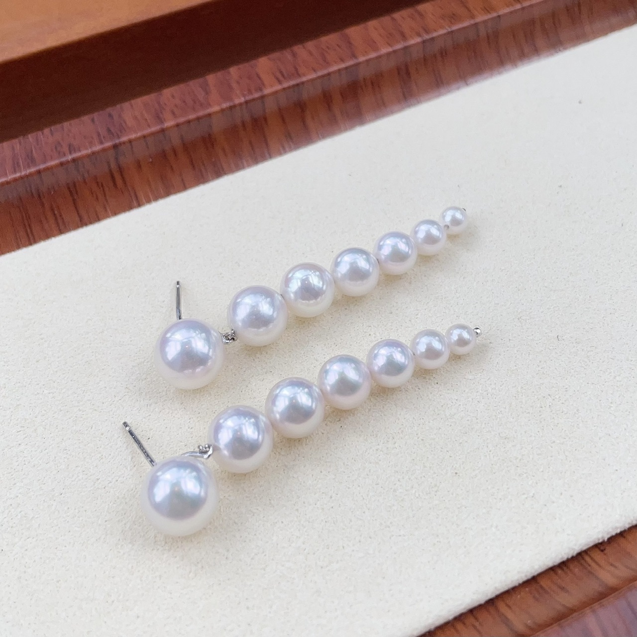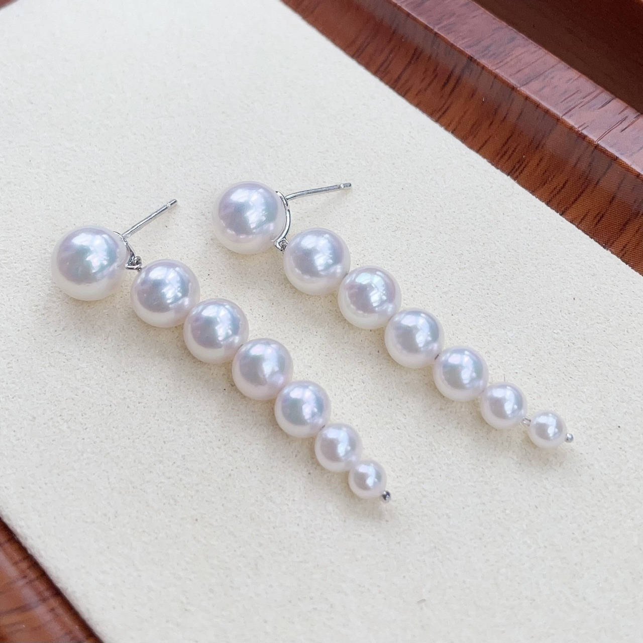 每邊由7顆介乎3.5-9mm Akoya珍珠大小漸變組合成,難度在於品相方面,要保持不同大小的珍珠有同一光澤及顏色,必需要同時備有大量不同大小的高品質Akoya珍珠才能配得出來,最大一顆Akoya介乎8.5-9mm之間, 8.5mm以上的Akoya珍珠要達到頂級皮光也很難得,是所有珍珠最重成本的一顆。