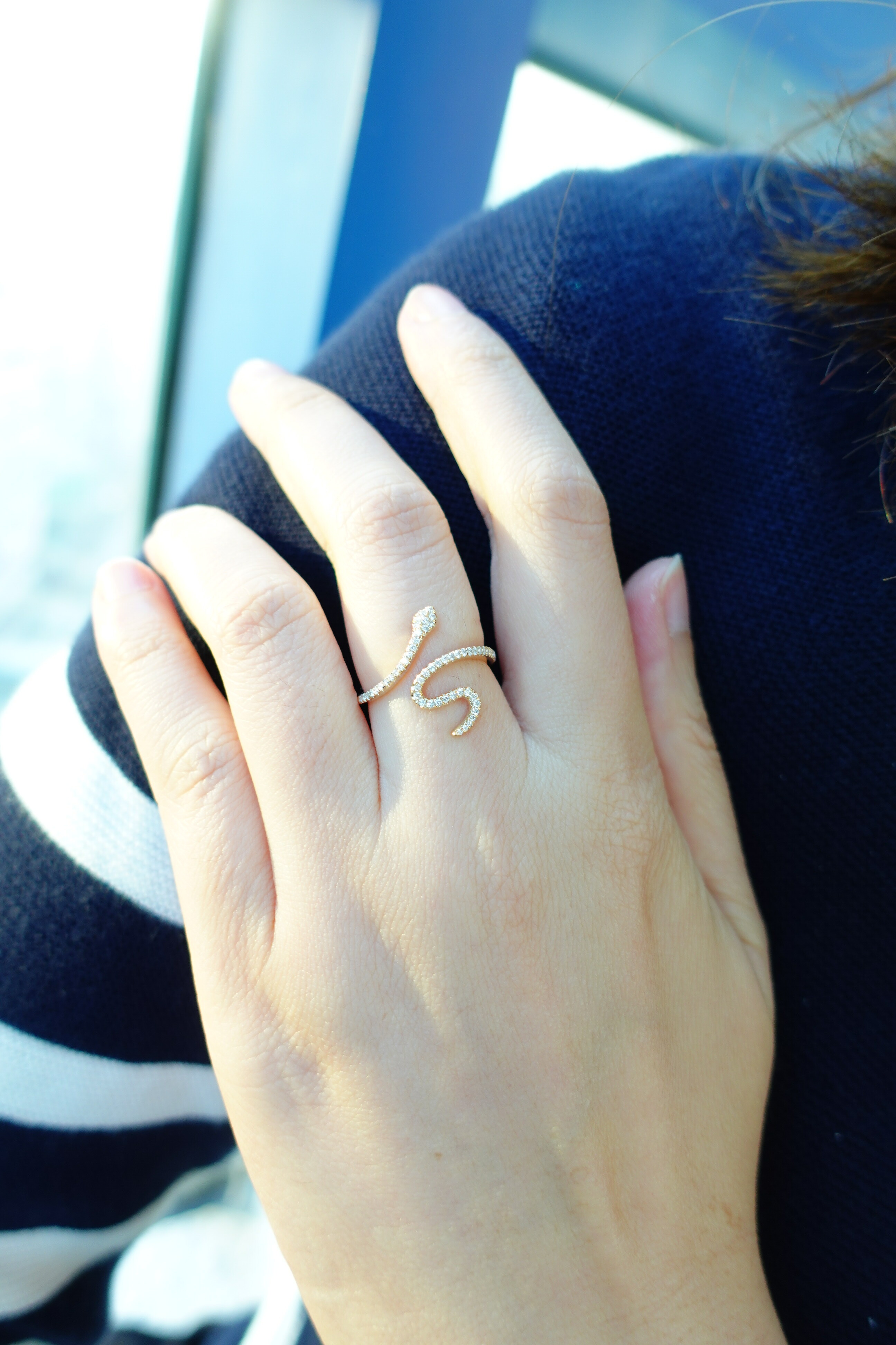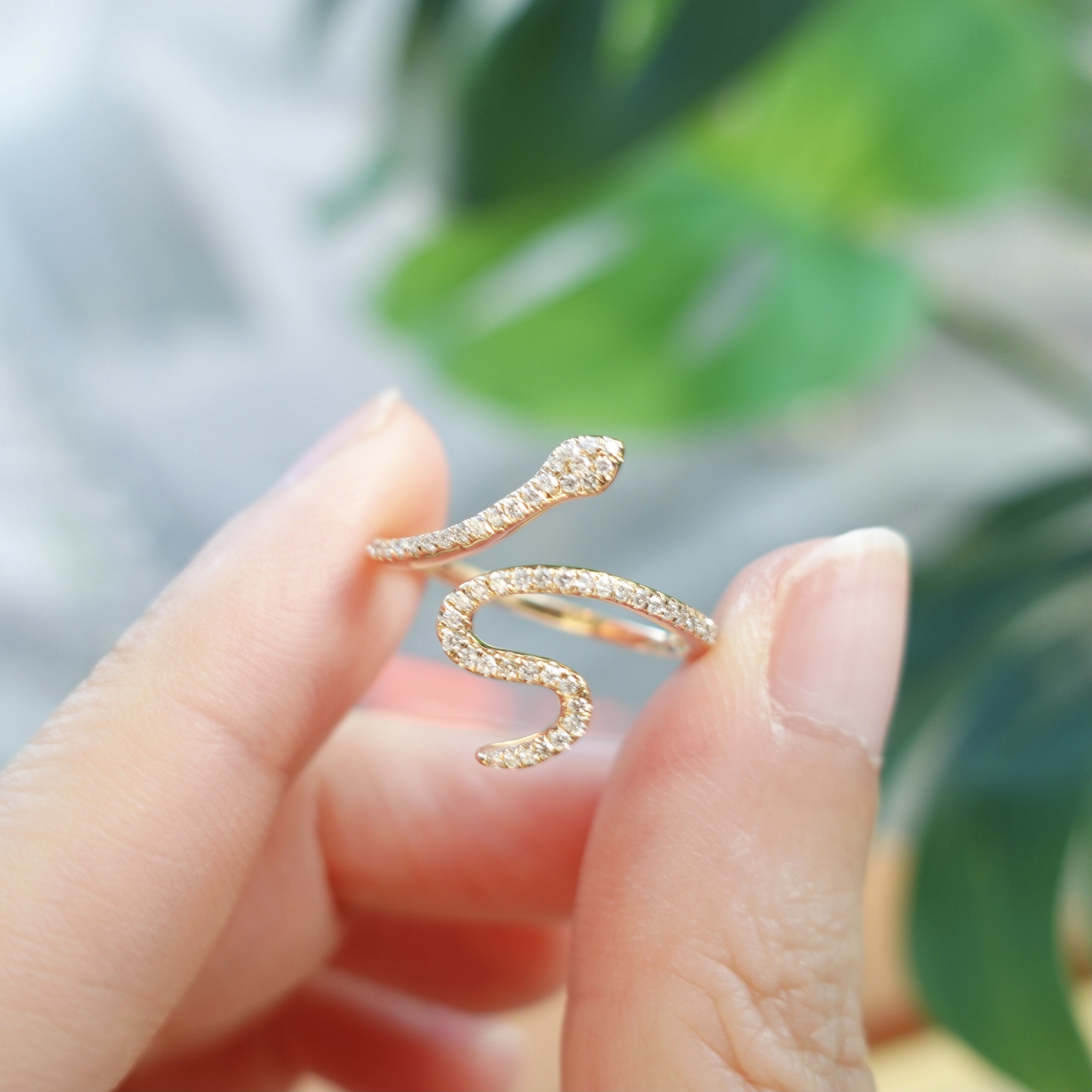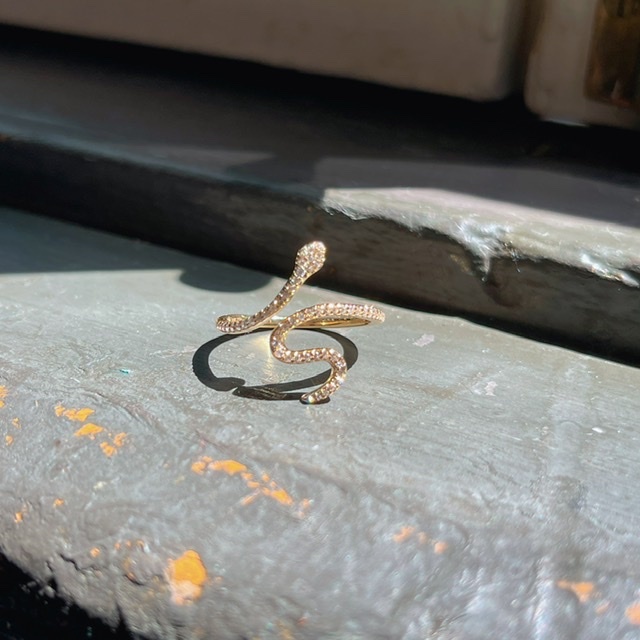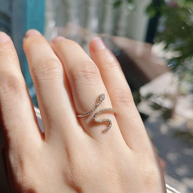 這款蛇形鑽石戒指簡約而不失精緻,不需要過多的寶石點綴或繁複的工藝,而是專注於線條的刻劃。戒指的蛇形態取決於線條的粗細和厚度,並用鑽石鑲口代替蛇身的質感,讓靈蛇戒指栩栩如生,彷彿隨時可以脫離戒指跳動。這款靈蛇戒指絕對是你不可或缺的一件日常珠寶。